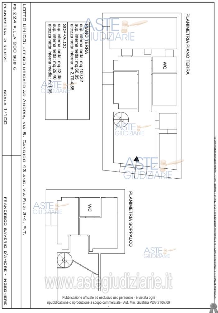 Vendita all'asta Senza incanto, con gara telematica sincrona - LOTTO UNICO: Ufficio a piano terra con zona soppalcata ubicato in Andria (BT) alla Via San Candido n. 43 – angolo Via Fabio Filzi nn. 3-5. Prezzo base € 141.905,42 (offerta minima € 106.429,07). Data vendita 28/05/2026 ore 11:30. Professionista delegato alla vendita Avv. Francesco Napoletano - Email "francesco.napoletano@libero.it"; Cell. 3333900368; Tel. 0803957673. Custode Giudiziario Avv. Francesco Napoletano - Email "francesco.napoletano@libero.it"; Cell. 3333900368; Tel. 0803957673. Rif. Tribunale di Trani - Esecuzione immobiliare post legge 80 n. 202/2022