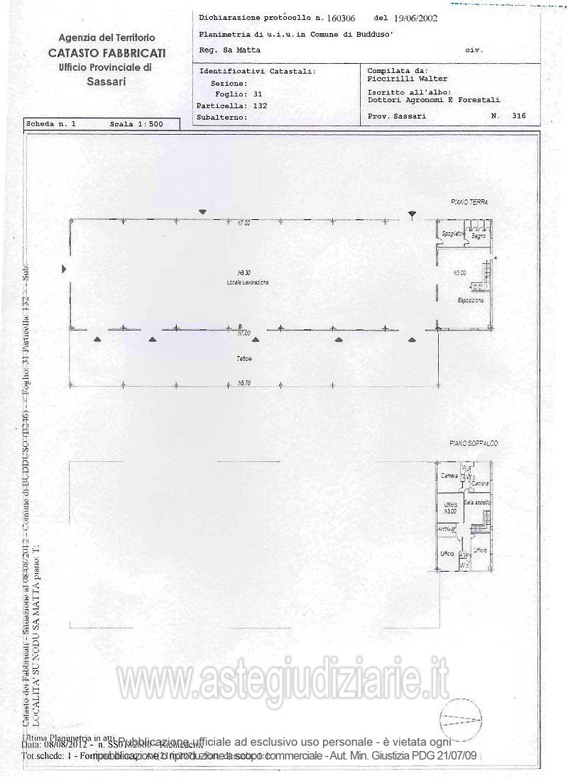 Vendita all'asta Senza incanto - LOTTO UNICO: - Appezzamento di terreno distinto nel Catasto Terreni del Comune di Buddusò, Sezione Agro, al:foglio 31 - particella 131- qualità sughereto – Cl. 3 – superficie di Ha 1.41.68 - Reddito Dominicale Euro 21,95 – Reddito Agrario Euro 5,12;- Fabbricato di tipo industriale distinto nel Catasto Fabbricati del Comune di Buddusò al:foglio 31 - particella 132 – Località Su Nodu Sa Matta – p. T - Z.C. 2° - Cat. D/1, con pertinenziale piazzale circostante. Prezzo base € 214.151,55 (offerta minima € 160.613,66). Data vendita 13/05/2026 ore 09:00. Giudice Elisa Remonti. Professionista delegato alla vendita Not. Antonietta Piras - Email "apiras.esecuzioni@gmail.com"; Cell. 079273264. Custode Giudiziario Istituto Vendite Giudiziarie Sassari - Email "visitaivgsassari@gmail.com"; Tel. 079260228. Rif. Tribunale di Sassari - Esecuzione immobiliare post legge 80 n. 182/2011