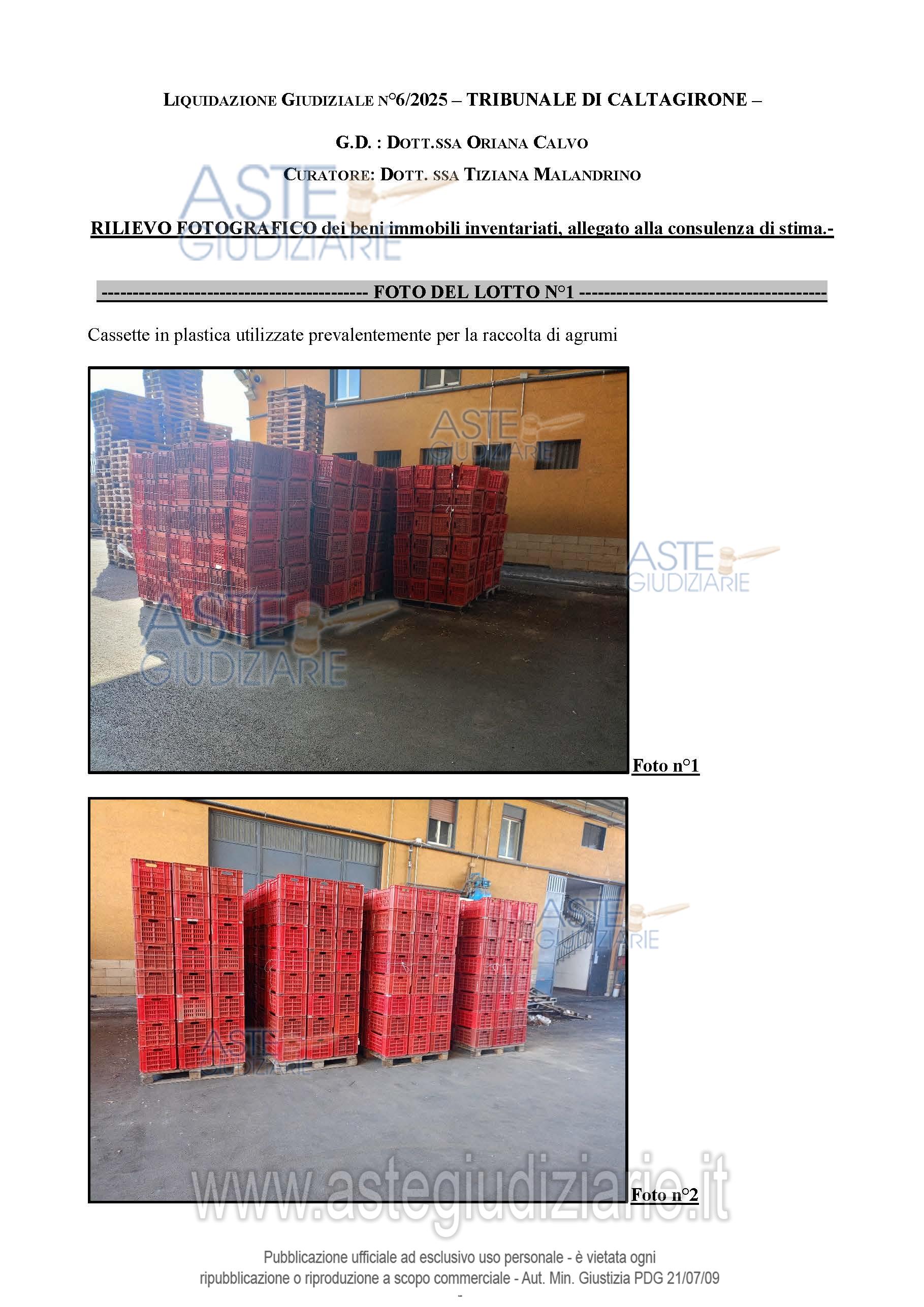 Vendita all'asta Senza incanto, con gara telematica sincrona mista - LOTTO 2: N.6.905 CASSETTE in plastica per la raccolta di arance (lotto n.1 perizia n.1). Prezzo base € 17.263,00 (offerta minima € 12.948,00). Data vendita 27/05/2026 ore 17:30. Giudice: Dott. Oriana Calvo.