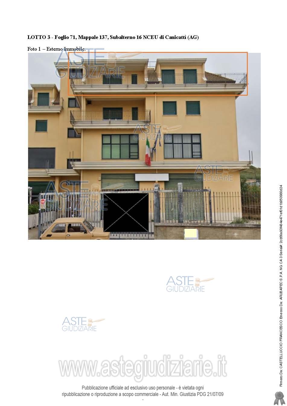 Vendita all'asta Senza incanto, con gara telematica sincrona mista - LOTTO 5: Piena proprietà per la quota di 1000/1000 di sottotetto non abitabile sito inCanicattì (Agrigento) Via Armando Diaz n.35. Composto da - n.1 vano in corso di costruzioneche comprende i due sottotetti non abitabili al grezzo, indivisibili, poiché aventi un’unica portad’accesso. - n.1 balconi che gira attorno a quasi tutto il piano. Posto al piano terzo, sviluppauna superficie lorda complessiva di circa mq 375,26. Prezzo base € 137.671,75 (offerta minima € 103.254,00). Data vendita 28/04/2026 ore 17:00. Giudice Luigi Vivacqua. Professionista delegato alla vendita Alessandra Balistreri. Custode Giudiziario Avv. Alessandra Balistreri - Email "ale.balistreri@gmail.com"; Cell. 3888708298. Rif. Tribunale di Agrigento - Esecuzione immobiliare post legge 80 n. 105/2023