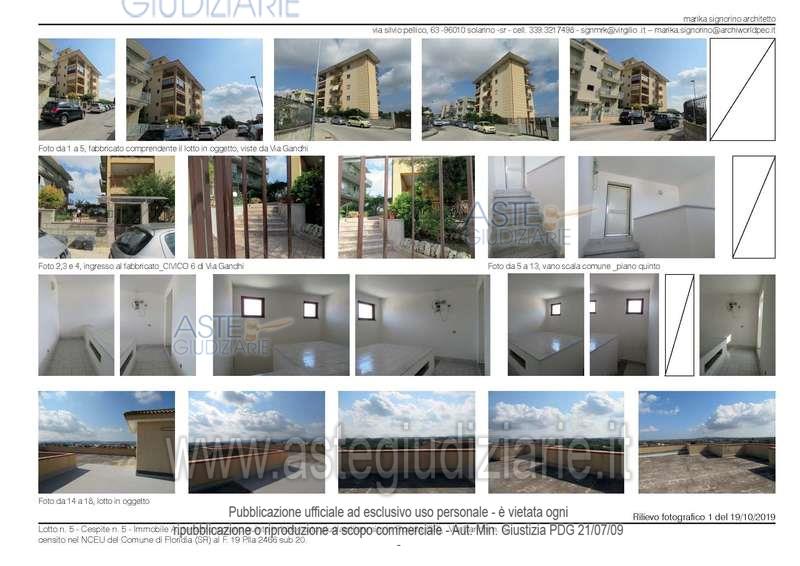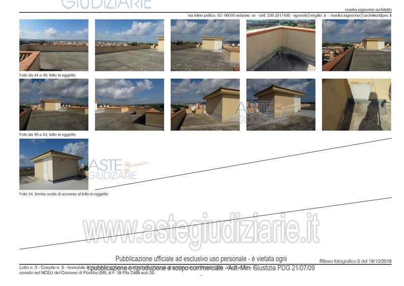 Vendita all'asta Senza incanto, con gara telematica sincrona mista - LOTTO 5: lastrico solare al piano quinto in Floridia Via Gandhi,6 al NCEU foglio 19 allegato B p.lla 2466 sub 20 di mq. 309,50. . Prezzo base € 10.441,41 (offerta minima € 7.831,06). Data vendita 15/07/2026 ore 10:00. Professionista delegato alla vendita: Avv. Stella Messina - Email "stellamessina@alice.it"; Tel. 0931/68236; Cell. 339/7961479.