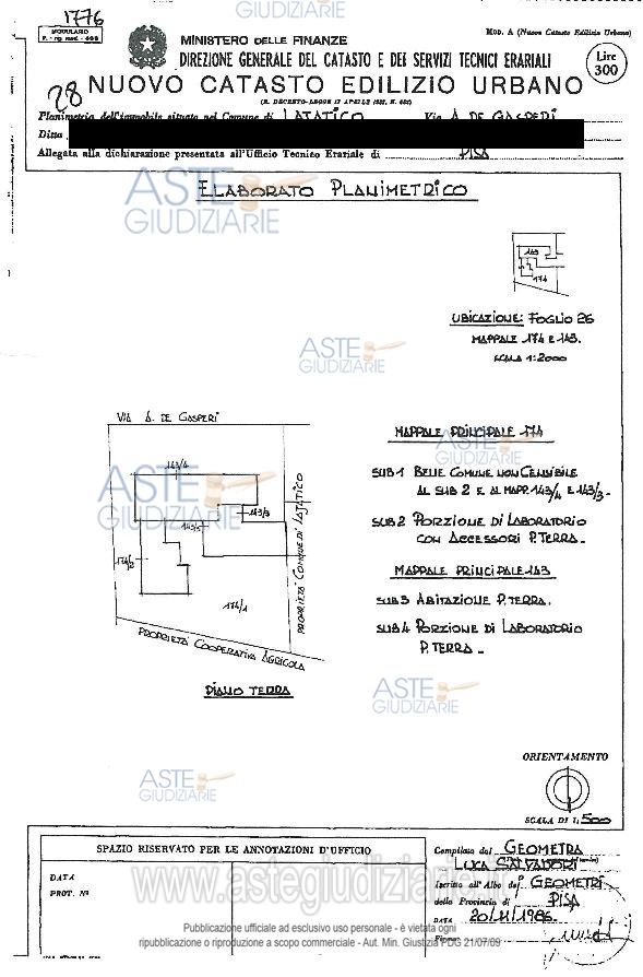 Vendita all'asta Senza incanto, con gara telematica asincrona - LOTTO UNICO: Piena proprietà di fabbricato artigianale insieme alla quota di un mezzo della nuda proprietà di appartamento per civile abitazione in una alla quota di un mezzo della nuda proprietà di altro fabbricato artigianale. Prezzo base € 105.120,00 (offerta minima € 78.840,00). Data inizio operazioni di vendita: 04/03/2026 ore 17:00. Giudice Dott. Marco Zinna. Professionista delegato alla vendita Avv. Fabrizio Possenti. Custode Giudiziario Dott. Cosimo Erriquez - Email "prenotazionipisa@astagiudiziaria.com". Rif. Tribunale di Pisa - Esecuzione immobiliare post legge 80 n. 171/2020
