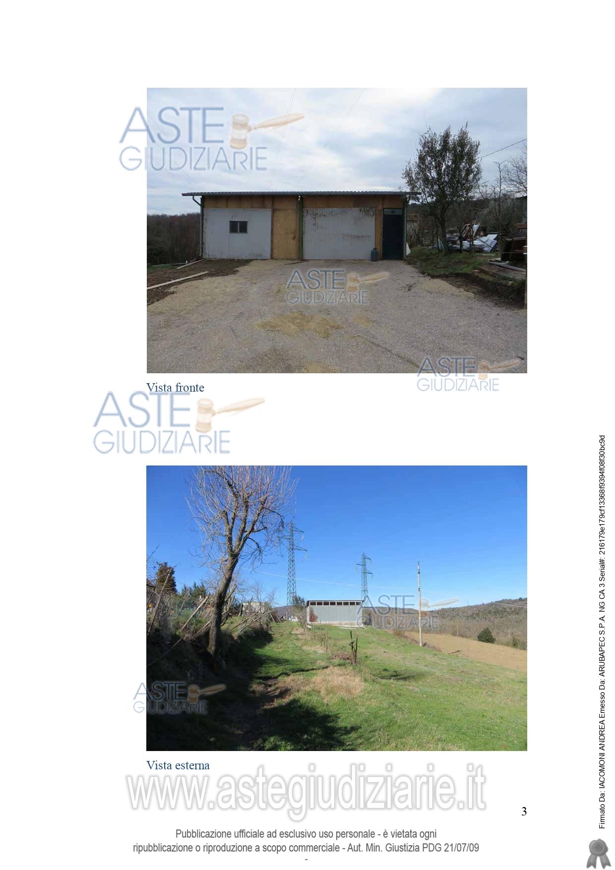 Vendita all'asta Senza incanto, con gara telematica sincrona mista - LOTTO 1: lotto 1) Diritto di piena proprietà per l’intero su di un edificio per rimessaggio, monopiano e con unico locale ubicato in Loc. Verniana, via La Costa snc, Monte San Savino (AR). È realizzato in lamiera con finestre a nastro e aperture per l’ingresso su un lato. L’altezza risulta di circa ml 3,10 e 4,00. Prezzo base € 18.700,00 (offerta minima € 14.040,00). Data vendita 19/05/2026 ore 10:00. Professionista delegato alla vendita Avv. Paolo Paolozzi - Email "paolopaolozzi@virgilio.it"; Cell. 3357400891; Tel. 0575494887. Custode Giudiziario Avv. Istituto Vendite Giudiziarie Arezzo - Siena - Email "visite.ivg@gmail.com"; Cell. 3397337017; Tel. 0577318111. Rif. Tribunale di Arezzo - Esecuzione immobiliare post legge 80 n. 4/2016