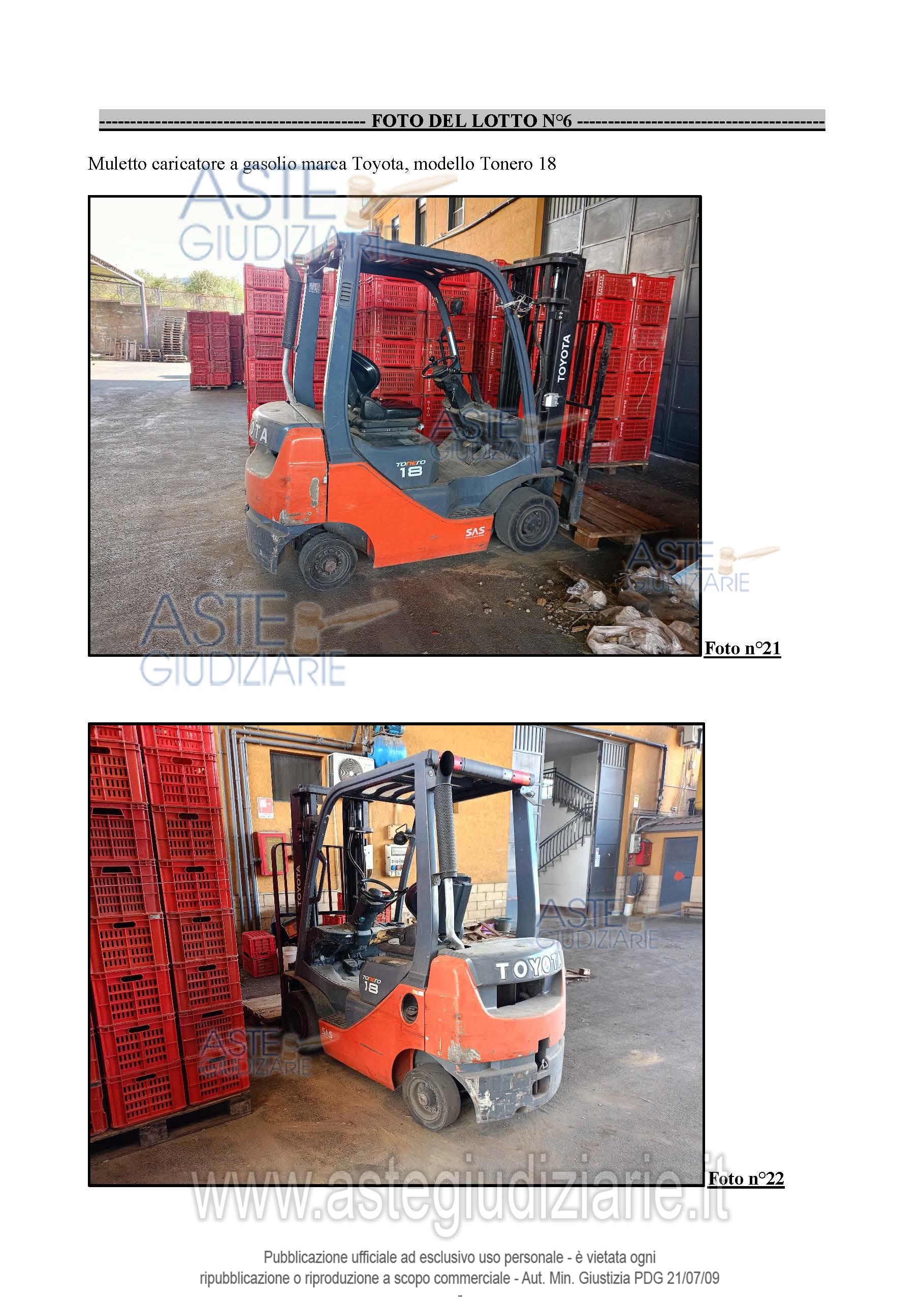 Vendita all'asta Senza incanto, con gara telematica sincrona mista - LOTTO 6: MULETTO caricatore Marca Toyota modello Tonero 18 (lotto n.6 perizia n.1). Prezzo base € 7.000,00 (offerta minima € 5.250,00). Data vendita 27/05/2026 ore 17:30. Giudice: Dott. Oriana Calvo.