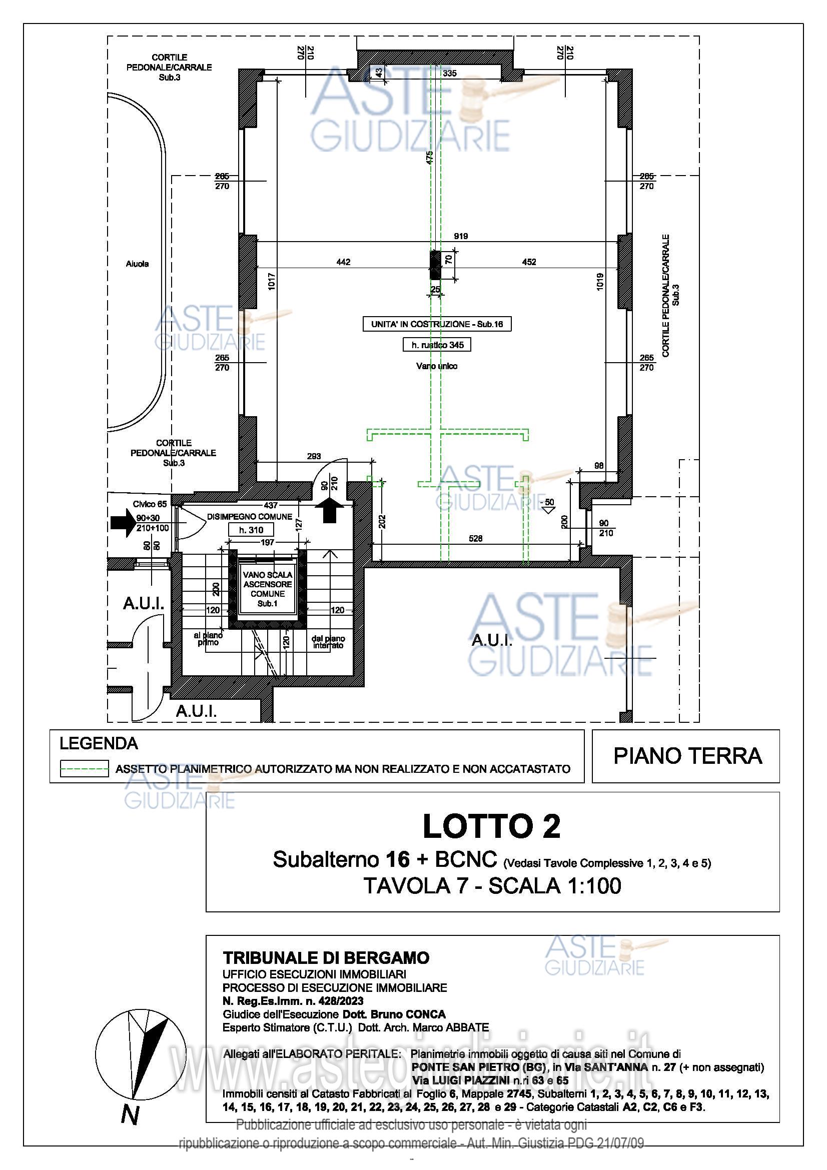 Vendita all'asta Senza incanto, con gara telematica asincrona - LOTTO 2: Unità immobiliare in corso di costruzione (ovvero “al rustico”) sito al piano terra. Si fa presente che l’immobile nel suo complesso è accatastato con la categoria F3 (immobile in corso di costruzione). Prezzo base € 27.037,39 (offerta minima € 20.278,04). Data inizio operazioni di vendita: 26/05/2026 ore 15:00. Professionista delegato alla vendita Avv. Simone Minola - Email "simoneminola@virgilio.it"; Tel. 0350779384. Custode Giudiziario Avv. Simone Minola - Email "simoneminola@virgilio.it"; Tel. 0350779384. Rif. Tribunale di Bergamo - Espropriazione immobiliare (cartabia) n. 428/2023