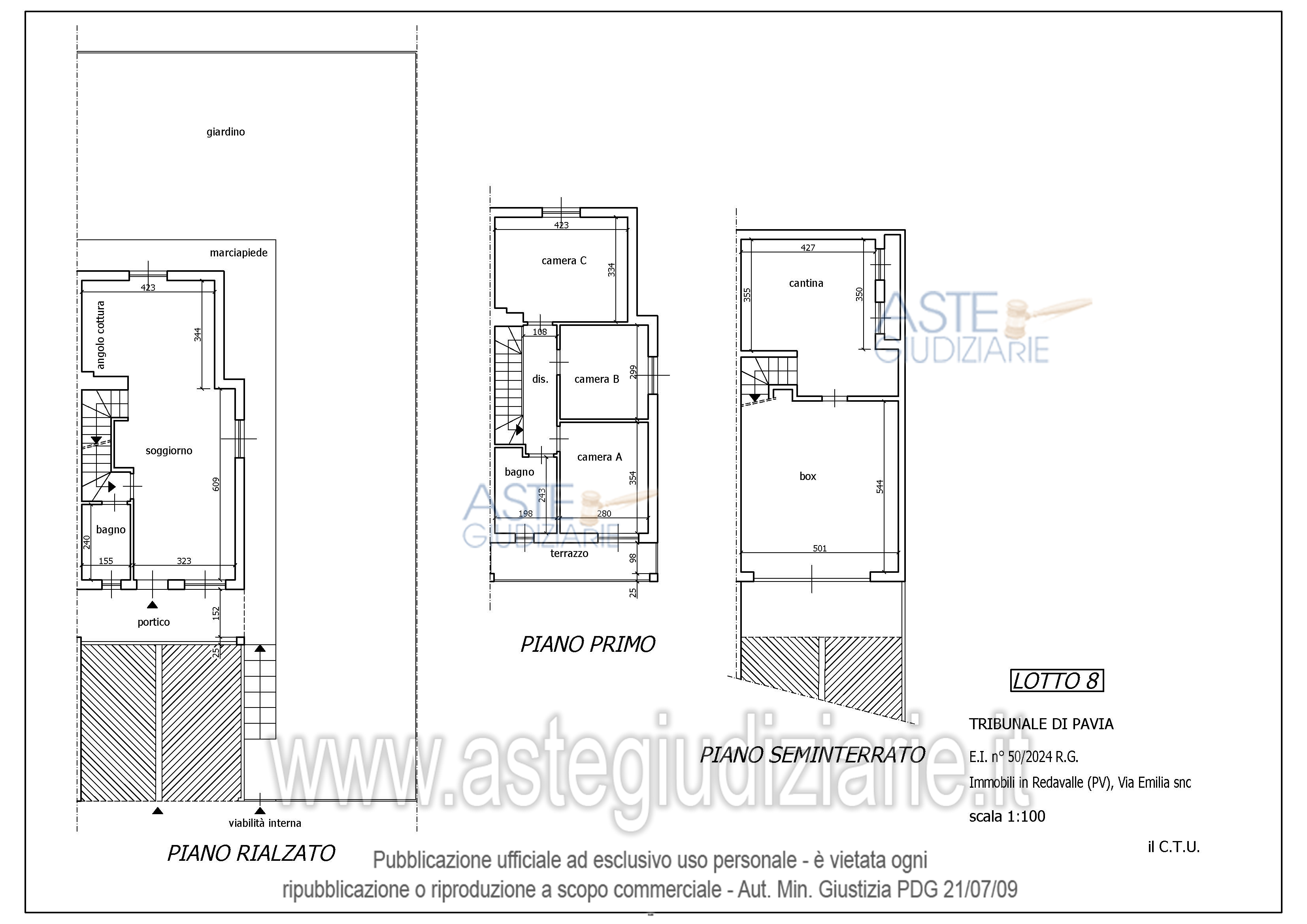 Vendita in attesa dell'emissione del nuovo bando d'asta. LOTTO 8: Porzione di villa bifamiliare in corso di costruzione, ad uso residenziale, disposta su piano rialzato, primo e seminterrato, con giardino e autorimessa di proprietà. L’immobile risulta così suddiviso: piano rialzato: giardino, portico esterno, soggiorno con angolo cottura, disimpegno, bagno e vano scala; piano primo: tre camere, disimpegno, bagno e terrazzo; piano seminterrato: box, cantina e cavedio. Ultimo prezzo base € 59.500,00 (offerta minima € 44.625,00). Giudice Antonio Maria Codega. Professionista delegato alla vendita Avv. Giorgio Giacobone - Email "giorgio@giacobone.it"; Tel. 0383646149. Custode Giudiziario Istituto Vendite Giudiziarie Di Vigevano - Email "richiestevisite.vigevano@ifir.it"; Tel. 0381691137. Rif. Tribunale di Pavia - Espropriazione immobiliare (cartabia) n. 50/2024