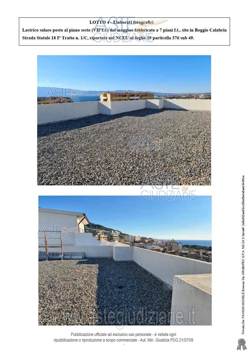 Vendita all'asta Senza incanto, con gara telematica asincrona - LOTTO 4: Lastrico solare di mq. 20 circa, posto al piano sesto (VII° f.t.) del maggior fabbricato a 7 piani f.t., sito in Reggio Calabria Strada Statale 18 I° Tratto n.1/C, riportato nel NCEU al foglio 19 particella 376 sub 49. Prezzo base € 5.860,00 (offerta minima € 4.990,00). Data inizio operazioni di vendita: 27/05/2026 ore 16:00. Giudice Dott. Stefano Cantone. Curatore Avv. Maria Martino - Email "studioavv.martino@virgilio.it"; Tel. 0965358436. Rif. Tribunale di Reggio di Calabria - Fallimentare (nuovo rito) n. 1/2021