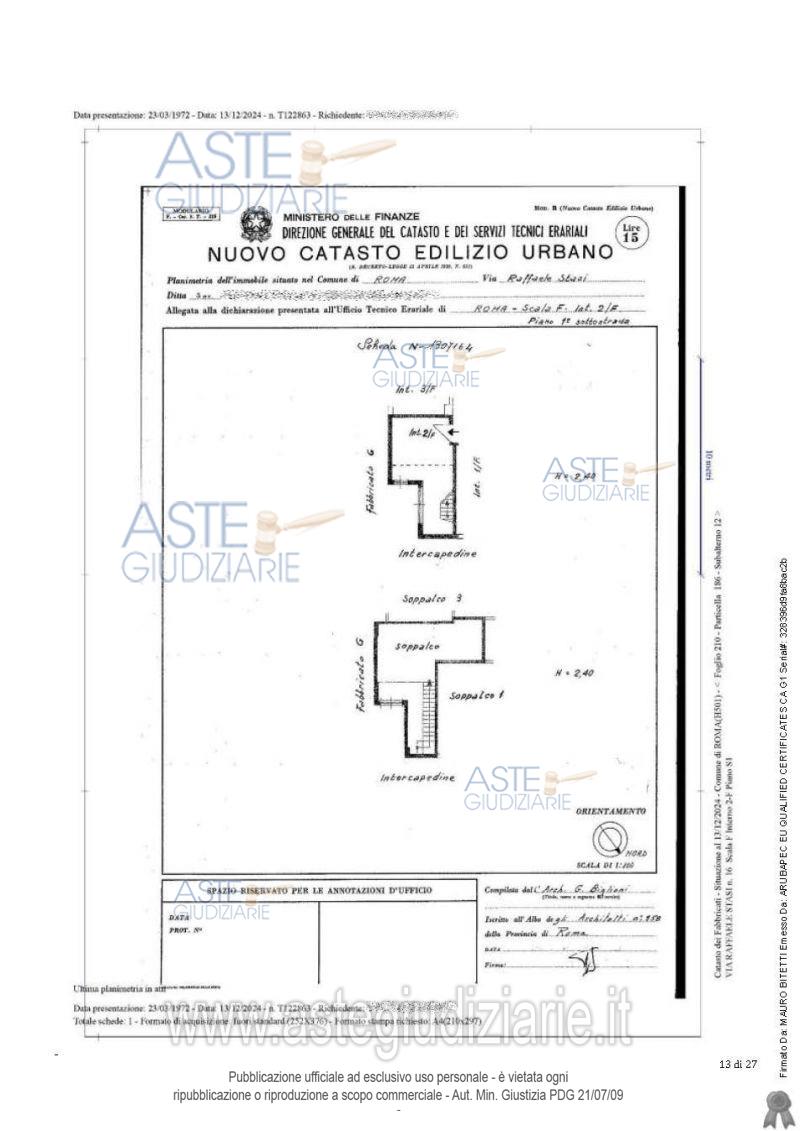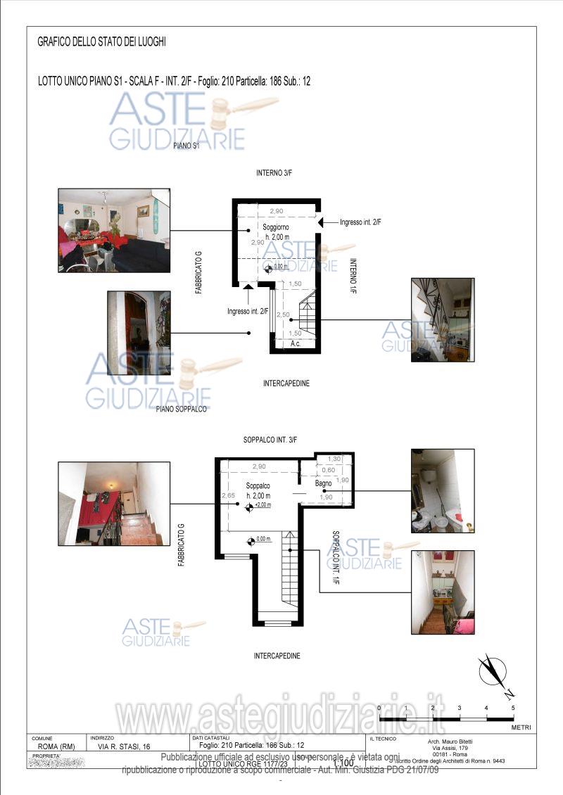 Vendita all'asta Senza incanto, con gara telematica asincrona - LOTTO UNICO: unità immobiliare sita in Roma – via Raffaele Stasi n. 16, scala FF, interno 2, piano S1, disposto su due livelli, composto al primo livello da un piccolo soggiorno con angolo cottura ricavato e al piano superiore un soppalco con bagno per complessivi mq 25,72. I due piani sono collegati da una scala rettilinea interna ridossata su una parete longitudinale. Identificato al NCEU al foglio n. 210, part. 186, sub. 12, z.c. 5, cat. A2, classe 2, rendita € 371,85. Emesso ordine di liberazione. Prezzo base € 23.148,00 (offerta minima € 17.361,00). Data inizio operazioni di vendita: 20/11/2025 ore 15:00. Giudice Dott. Romolo Ciufolini. Professionista delegato alla vendita Avv. Valentina Rombola'. Custode Giudiziario Ivg Di Roma Srl - Email "Pvp@visiteivgroma.it"; Tel. 0689569801. Rif. Tribunale di Roma - Espropriazione immobiliare (cartabia) n. 1177/2023