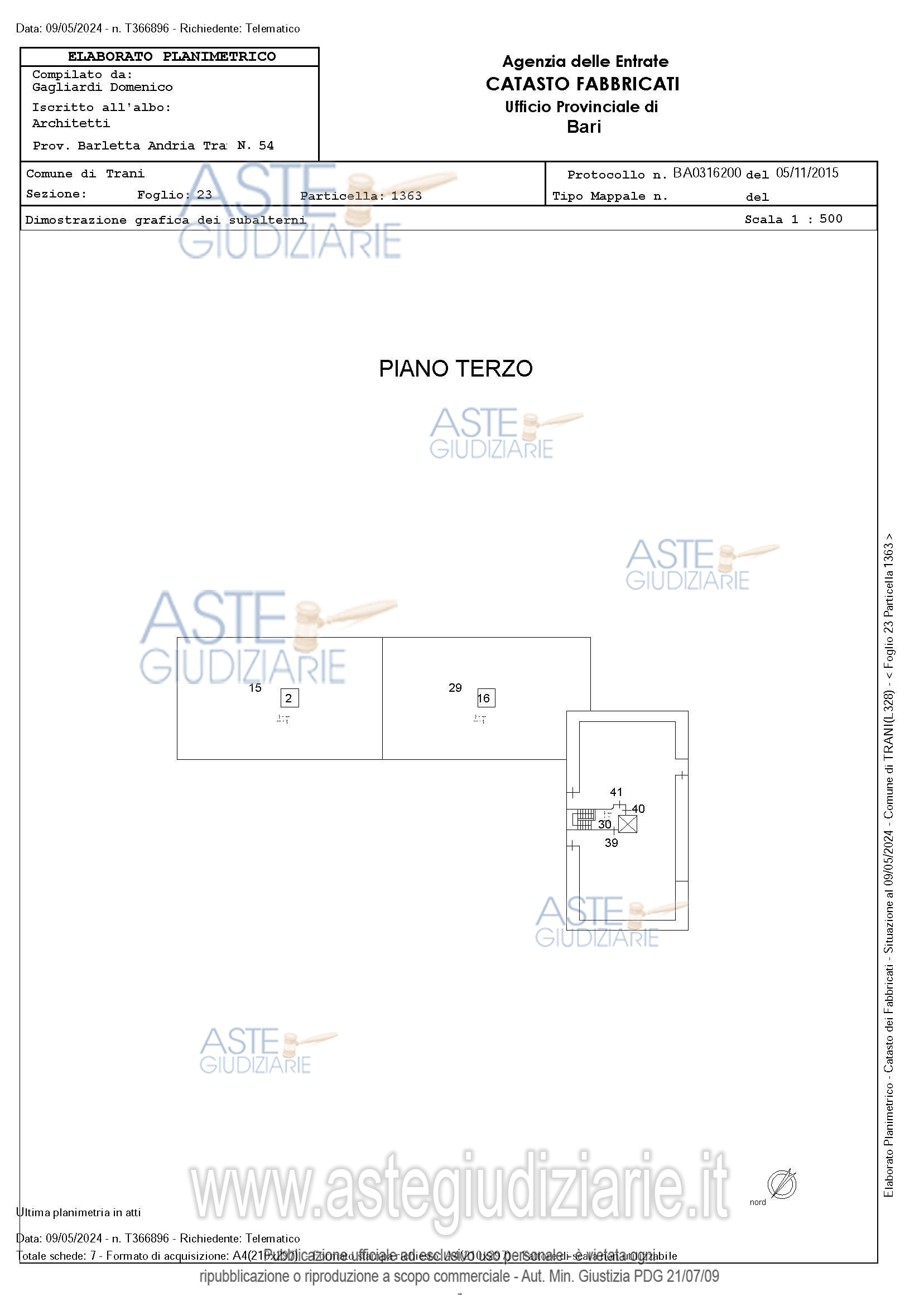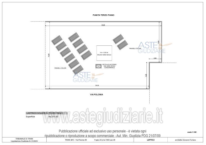 Vendita all'asta Senza incanto, con gara telematica asincrona - LOTTO 2: Piena e perfetta proprietà del lastrico solare, posto al piano terzo della superficie di metri quadri 311 circa. Prezzo base € 31.022,25 (offerta minima € 31.022,25). Data inizio operazioni di vendita: 12/11/2025 ore 10:00. In caso di più offerte valide si procederà a gara che inizierà il 12/11/2025 ore 10:00 e terminerà il 19/11/2025 ore 12:00. Giudice Dott. Maria Azzurra Guerra. Curatore Avv. Francesco Fuzio - Tel. 0805213433 - 0809905347. Rif. Tribunale di Trani - Liquidazione giudiziale(cci) n. 21/2023