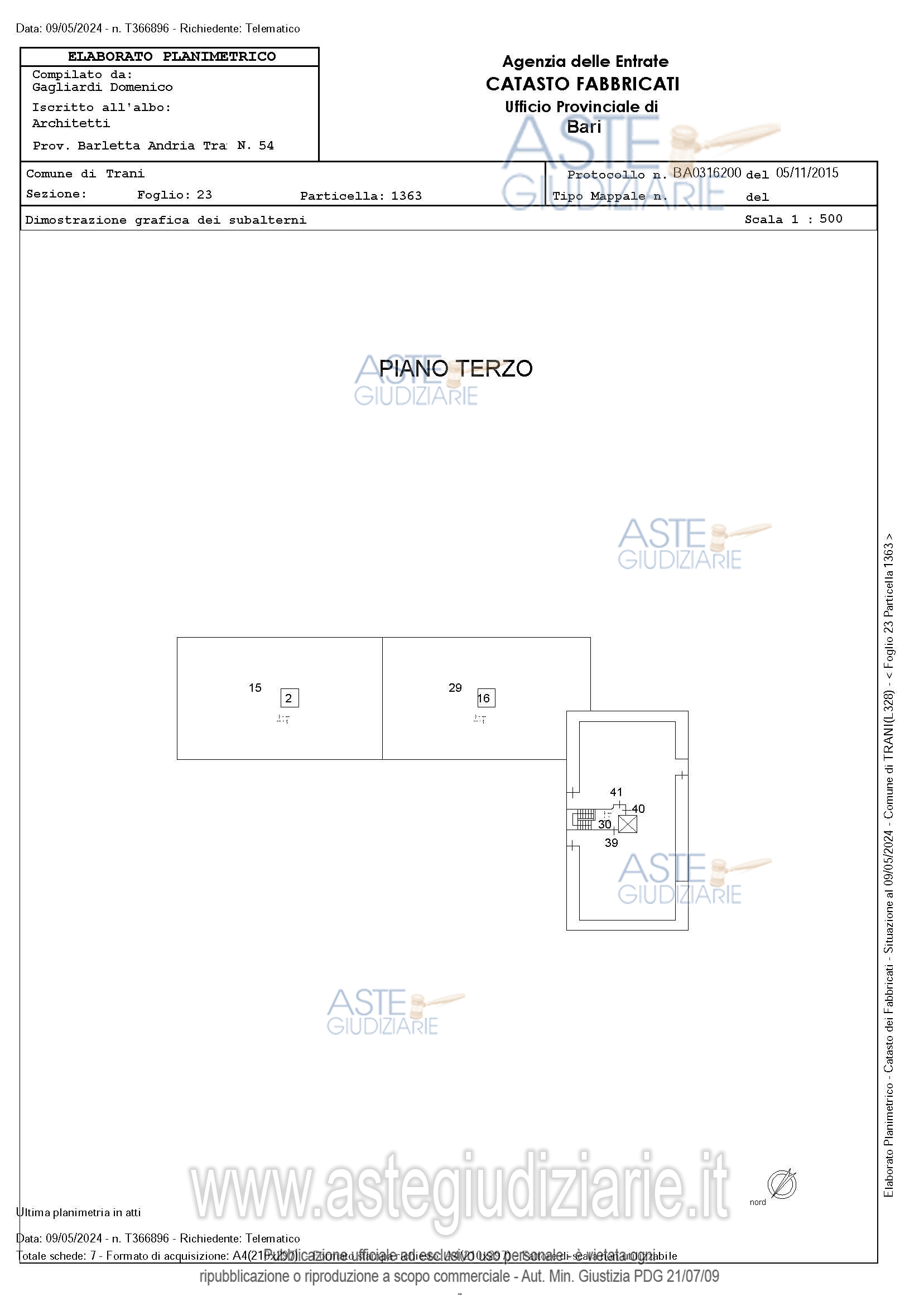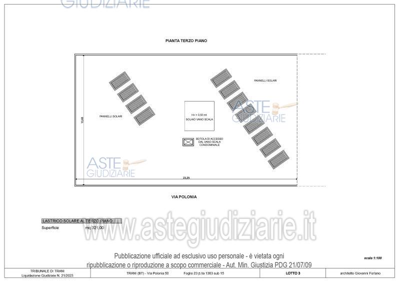 Vendita all'asta Senza incanto, con gara telematica asincrona - LOTTO 3: Piena e perfetta proprietà del lastrico solare, posto al piano terzo, scala Y3 della superficie di metri quadri 321 circa. Prezzo base € 32.019,75 (offerta minima € 32.019,75). Data inizio operazioni di vendita: 12/11/2025 ore 10:00. In caso di più offerte valide si procederà a gara che terminerà il 19/11/2025 ore 12:00. Giudice Dott. Maria Azzurra Guerra. Curatore Avv. Francesco Fuzio - Tel. 0805213433 - 0809905347. Rif. Tribunale di Trani - Liquidazione giudiziale(cci) n. 21/2023