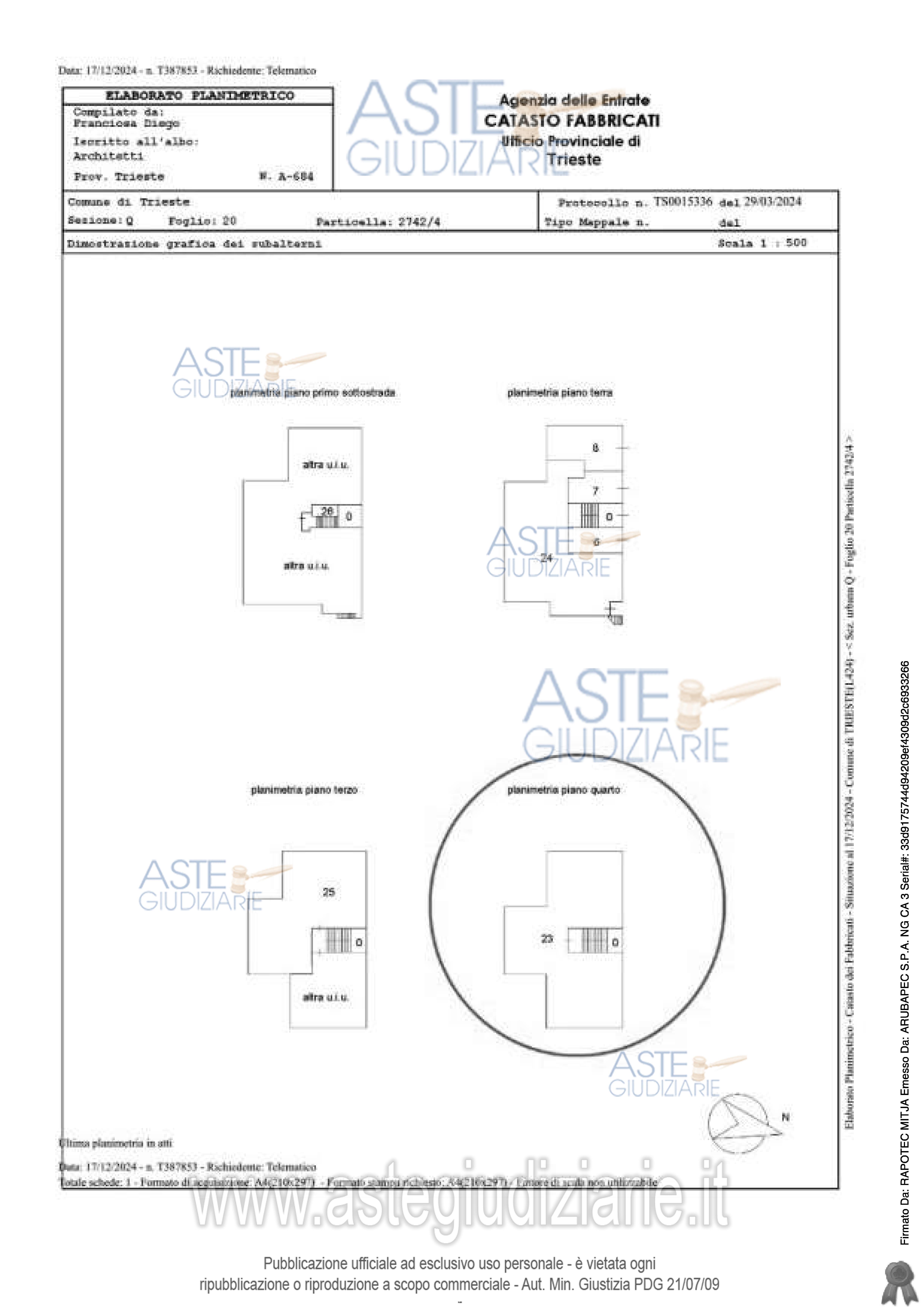 Vendita all'asta Senza incanto, con gara telematica sincrona mista - LOTTO UNICO: lastrico solare costituente il tetto piano dello stabile condominiale sito in Trieste, via Pietro Mascagni n. 7. Prezzo base € 9.000,00 (offerta minima € 6.750,00). Data vendita 20/03/2026 ore 15:00. Professionista delegato alla vendita Avv. Ileana Dagostini - Email "idagostini@avvdagostini.it"; Cell. 3703344418; Tel. 0409570813. Custode Giudiziario Avv. Ileana Dagostini - Email "idagostini@avvdagostini.it"; Cell. 3703344418; Tel. 0409570813. Rif. Tribunale di Trieste - Esecuzione immobiliare n. 79/2024