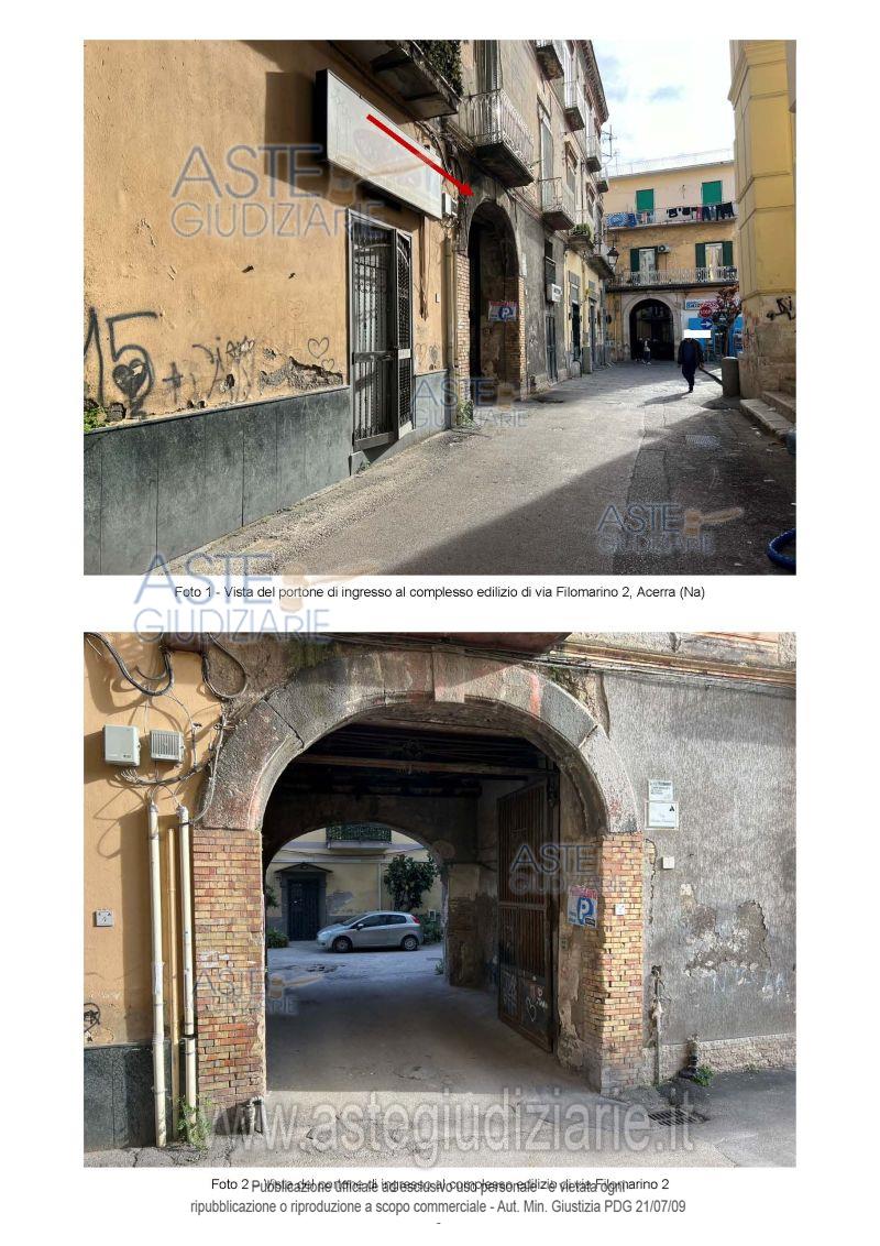 Vendita all'asta Senza incanto, con gara telematica asincrona - LOTTO UNICO: Piena ed intera proprietà di compendio immobiliare in Acerra Via Filomarino n.14 composto da un vano al piano terra, due vani al primo piano, disimpegnati da scala e ballatoio con accesso dal cortile interno, di cui uno collegato a mezzo di una scala interna al predetto vano terraneo; completano la consistenza del lotto due soprastanti ambienti sottotetto privi di accesso e due ulteriori piccoli manufatti terranei posti nel citato cortile interno. Prezzo base € 37.125,00 (offerta minima € 27.843,75). Data inizio operazioni di vendita: 15/04/2026 ore 13:00. Giudice Miriam Valenti. Professionista delegato alla vendita Avv. Sabatino Madonna - Email "sabatino.madonna@legalecm.it"; Tel. 08231656102. Custode Giudiziario Avv. Sabatino Madonna - Email "sabatino.madonna@legalecm.it"; Tel. 08231656102. Rif. Tribunale di Nola - Espropriazione immobiliare (cartabia) n. 176/2023