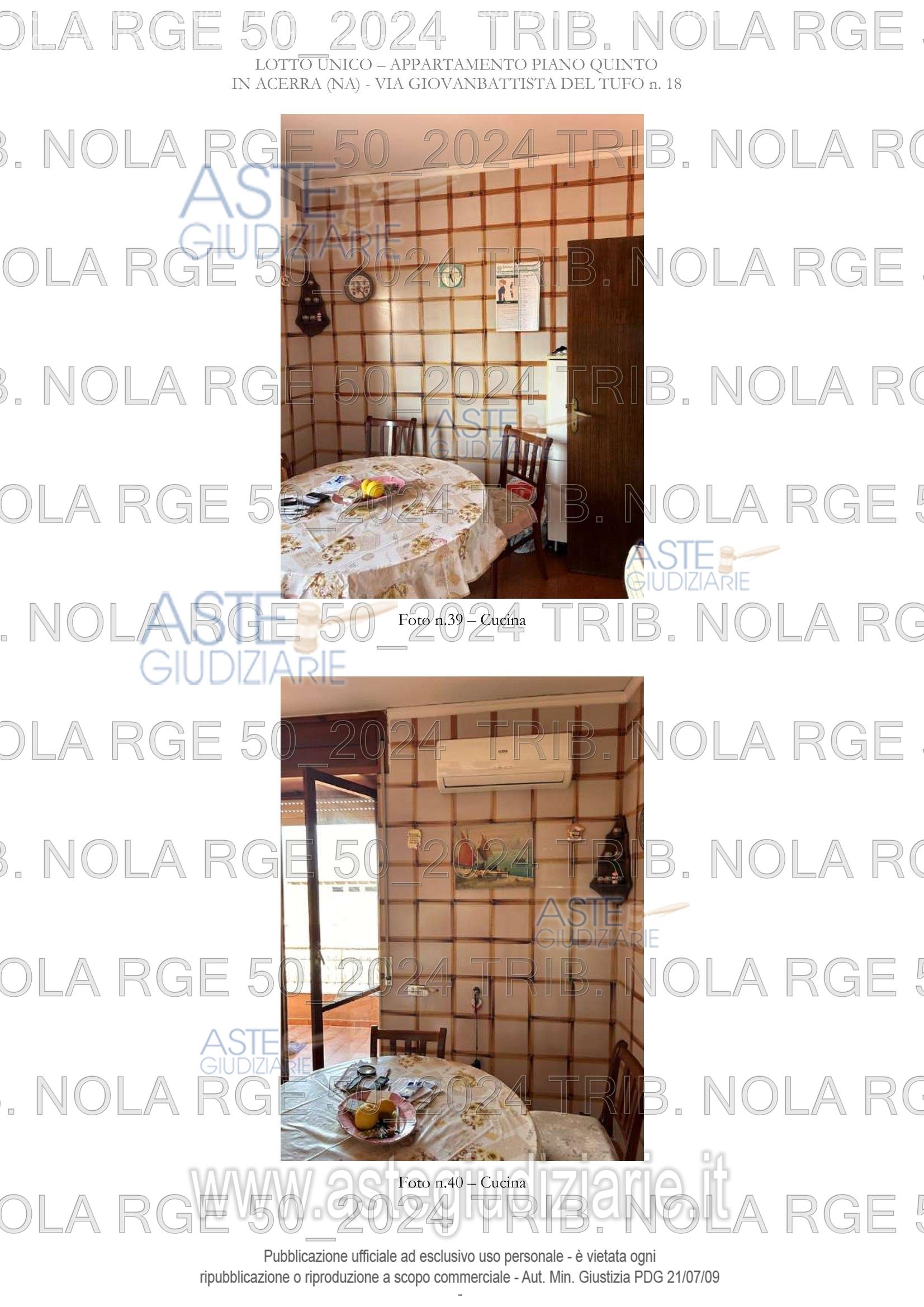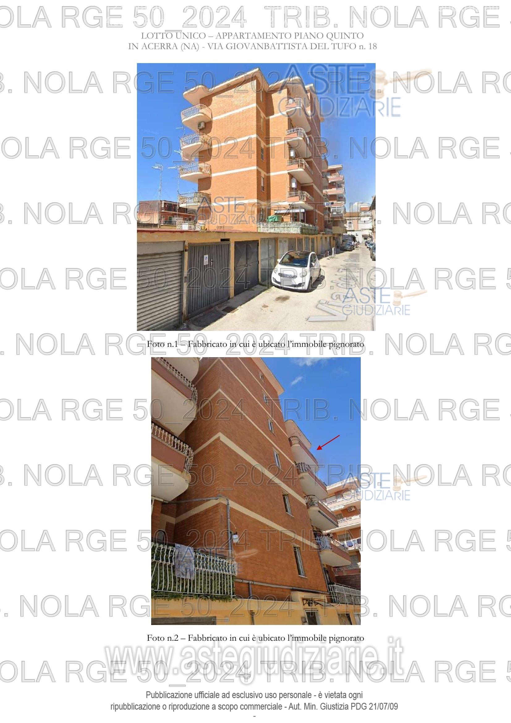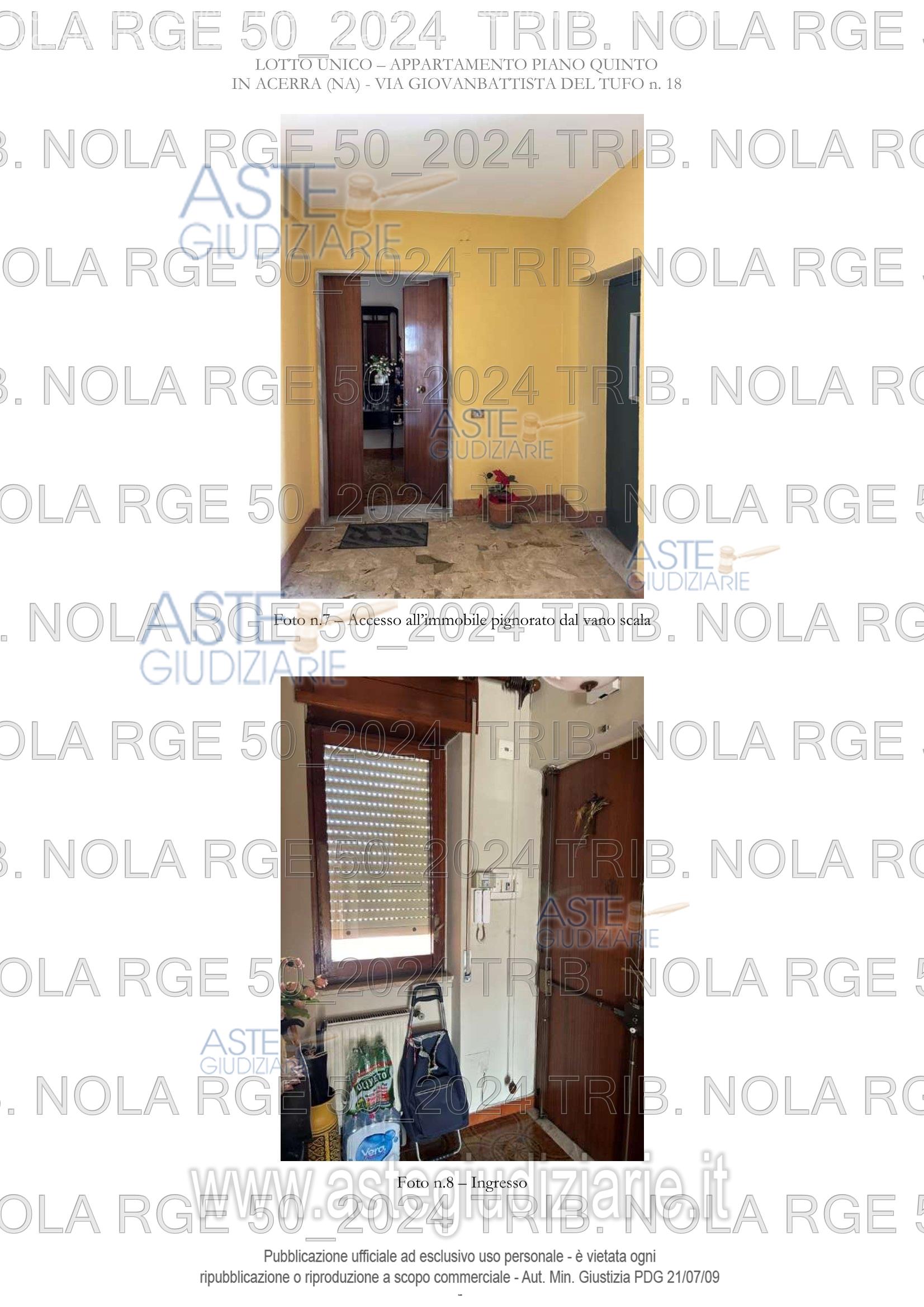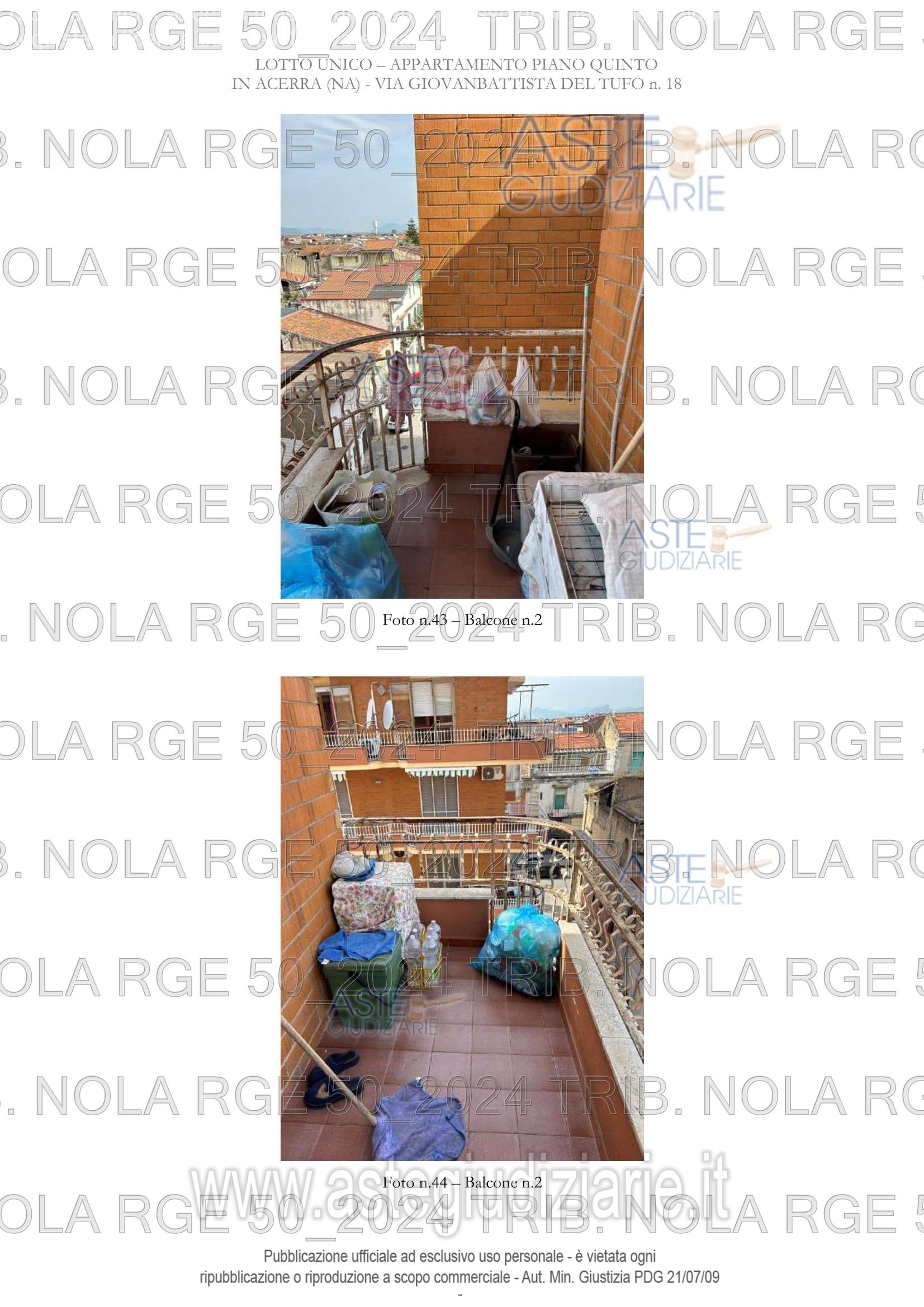 Vendita all'asta Senza incanto, con gara telematica asincrona - LOTTO UNICO: Piena ed intera proprietà di immobile ubicato in Acerra (NA) alla via Giovanbattista del Tufo n. 18, scala C, int. 10, identificato al N.C.E.U. del Comune di Acerra al Foglio 53, Part. 431, Sub 74, Cat. A/2, Classe 4, Consistenza 4,5 vani, R.C. € 278,89. Prezzo base € 71.250,00 (offerta minima € 53.437,50). Data inizio operazioni di vendita: 11/11/2025 ore 17:00. Giudice Miriam Valenti. Professionista delegato alla vendita Avv. Velia Gallo - Email "velia.gallo@alice.it"; Cell. 3382790177; Tel. 0810147439. Custode Giudiziario Avv. Velia Gallo - Email "velia.gallo@alice.it"; Cell. 3382790177; Tel. 0810147439. Rif. Tribunale di Nola - Espropriazione immobiliare (cartabia) n. 50/2024