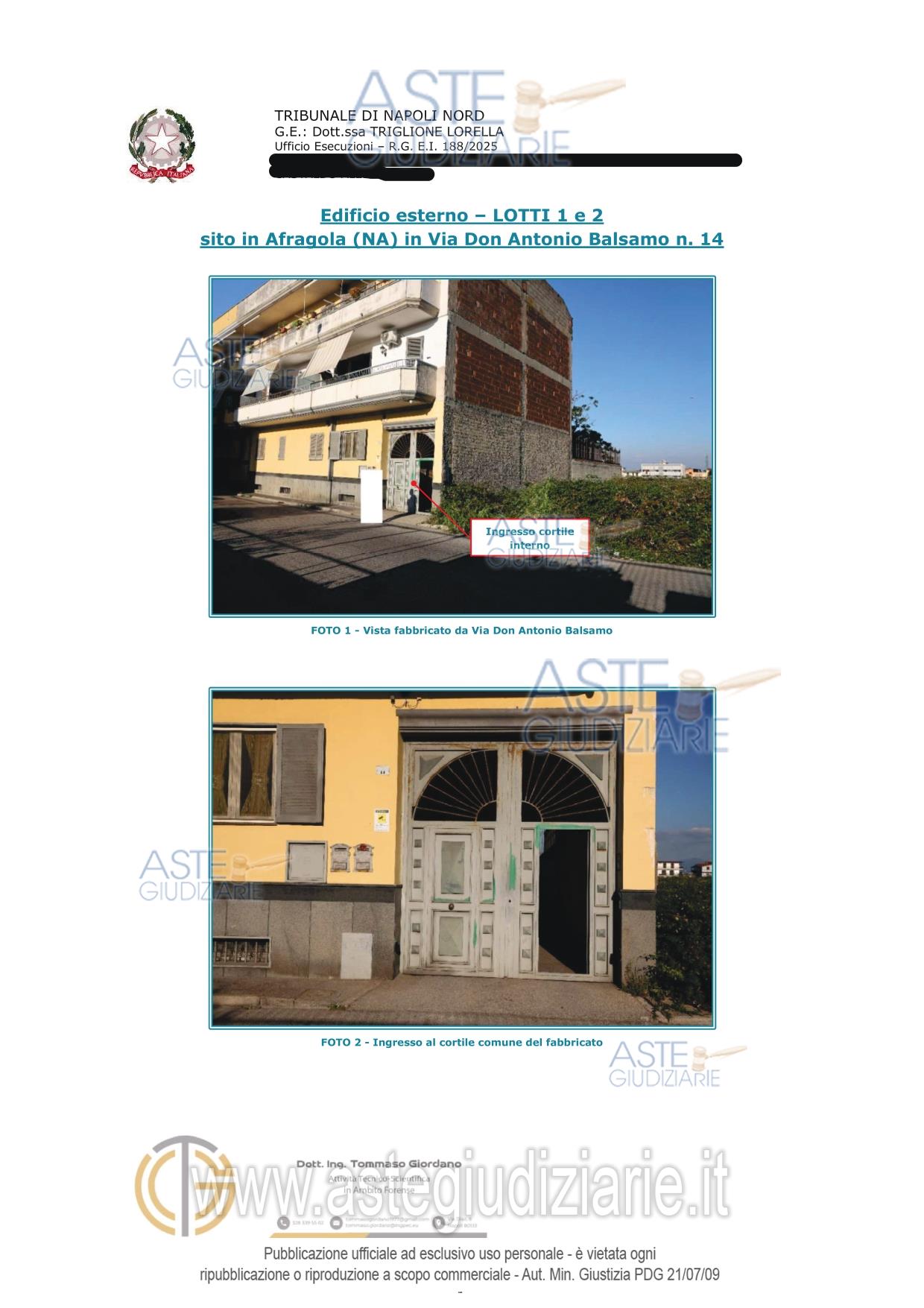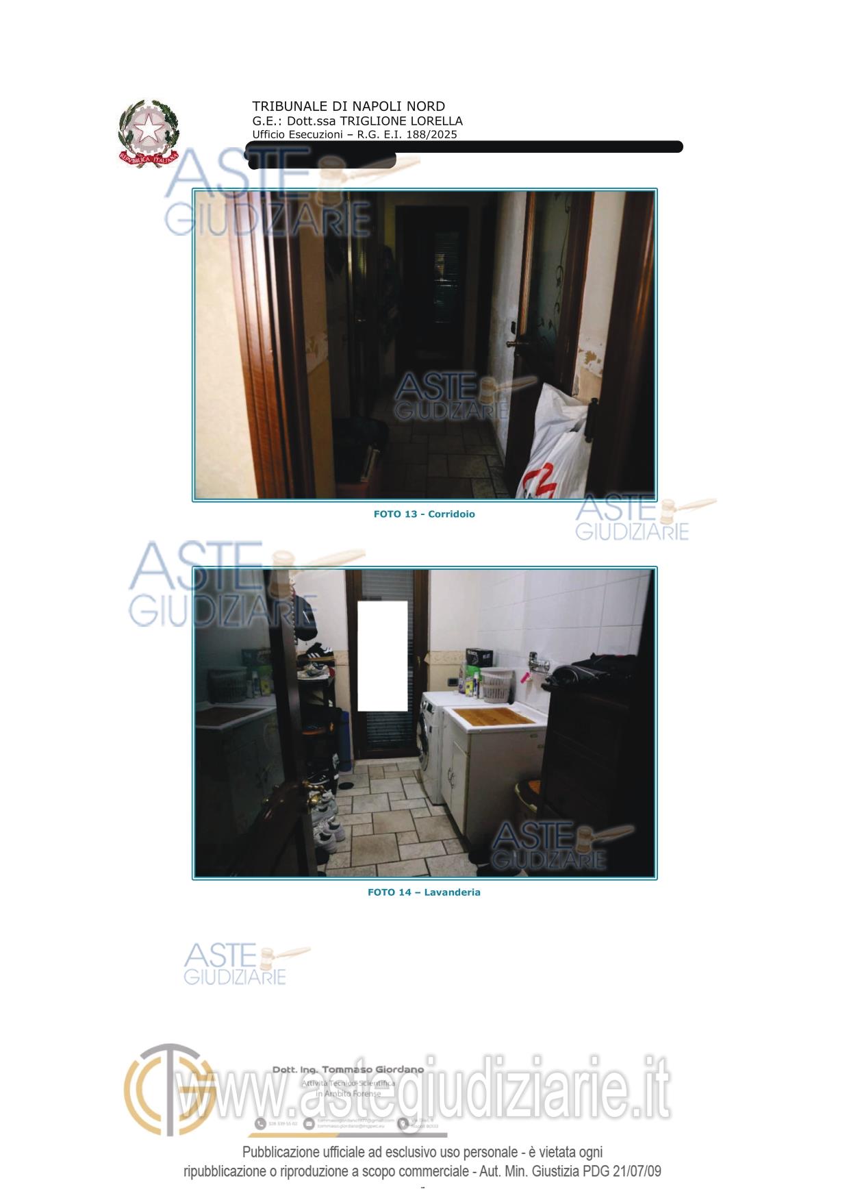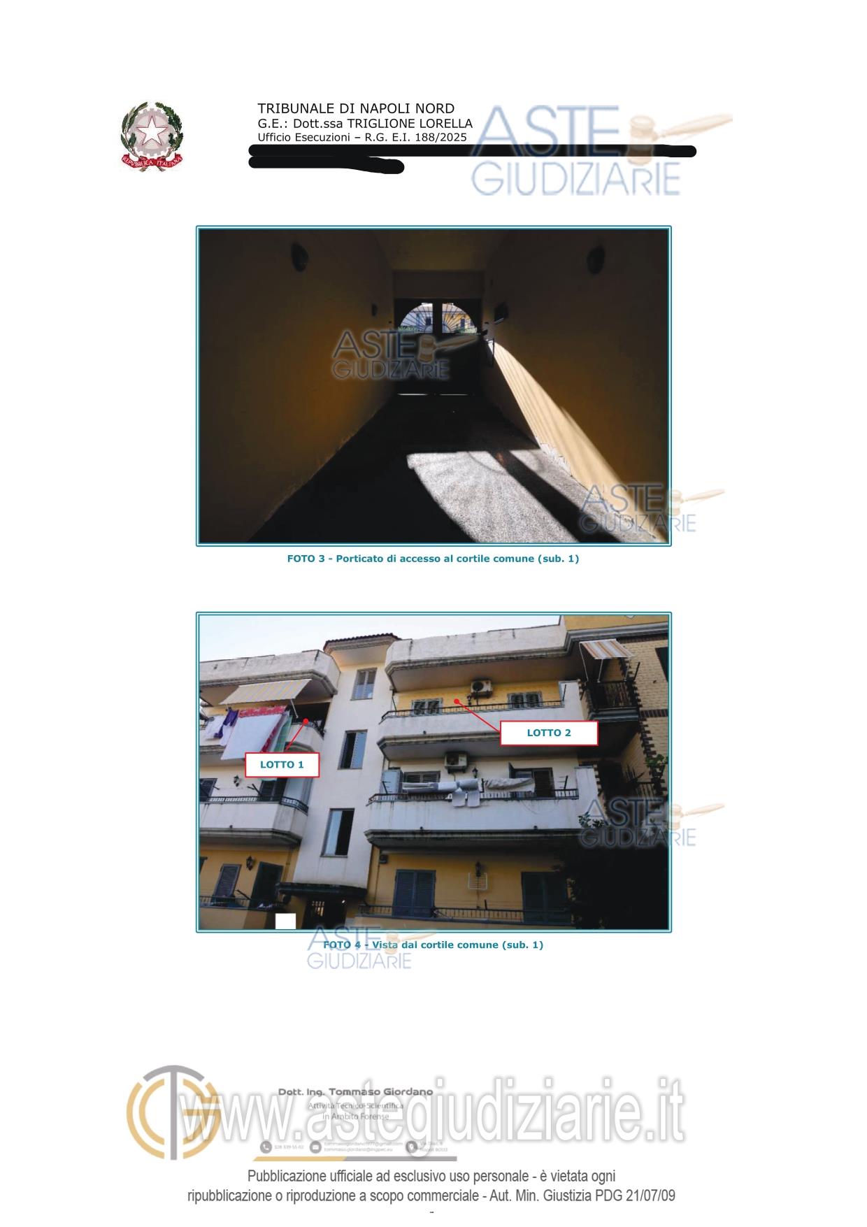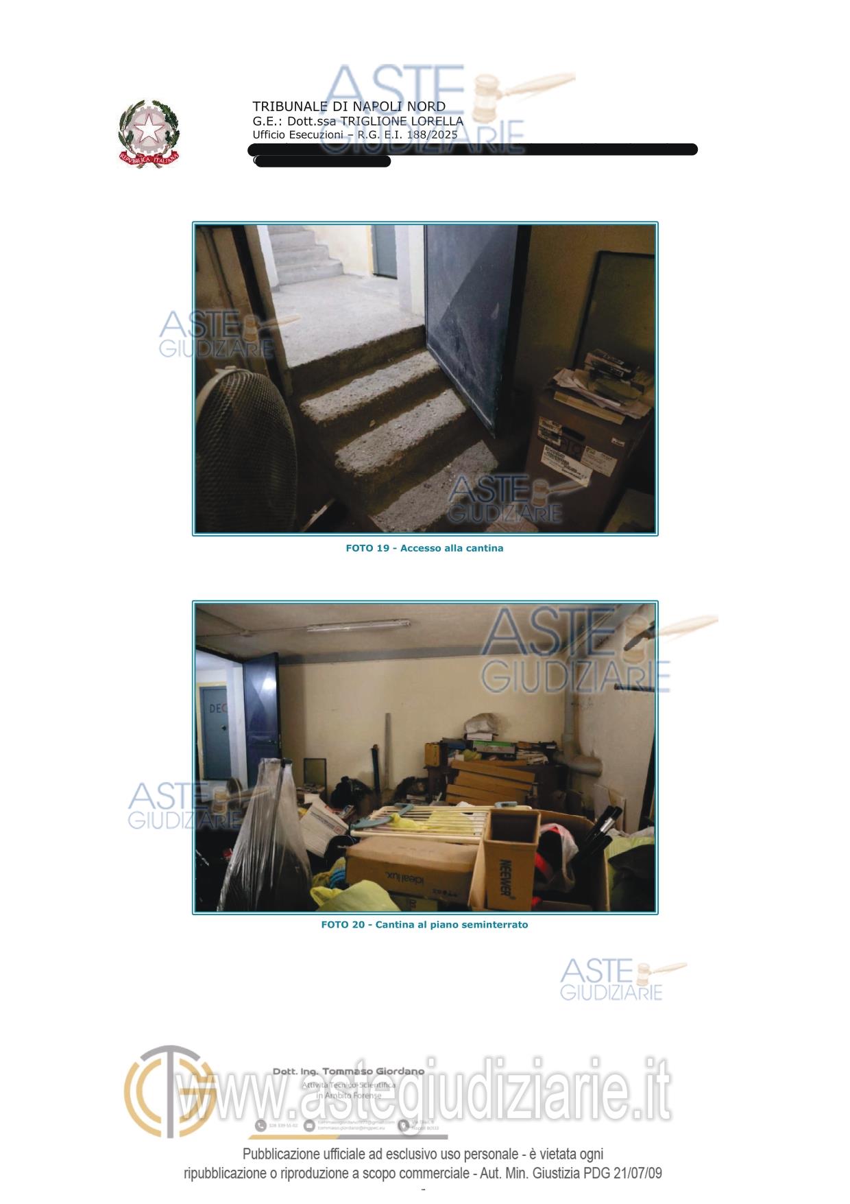 Vendita all'asta Senza incanto, con gara telematica asincrona - LOTTO 1: Piena e intera proprietà di appartamento al secondo piano e pertinenziale cantina al piano seminterrato. Si precisa che entrambi sono fusi con altro appartamento e cantina sub 18 (lotto 2) costituendo di fatto un'unità unità abitativa e unica cantina. l'appartamento si compone di ingresso, cucina, vano studio/ripostiglio, ripostiglio bagno. Prezzo base € 123.000,00 (offerta minima € 92.250,00). Data inizio operazioni di vendita: 23/06/2026 ore 12:00. Professionista delegato alla vendita Avv. Tommasina Valentina Panico - Email "panico.valentina@libero.it"; Tel. 08118820912. Custode Giudiziario Avv. Tommasina Valentina Panico - Email "panico.valentina@libero.it"; Tel. 08118820912. Rif. Tribunale di Napoli Nord - Espropriazione immobiliare (cartabia) n. 188/2025