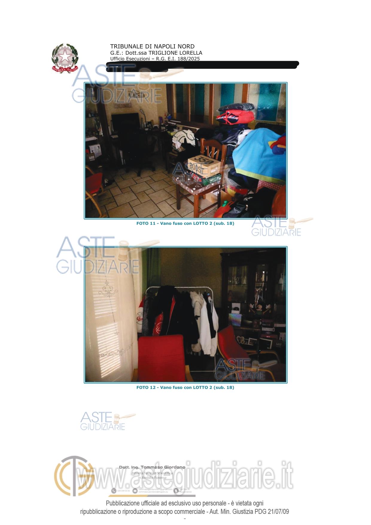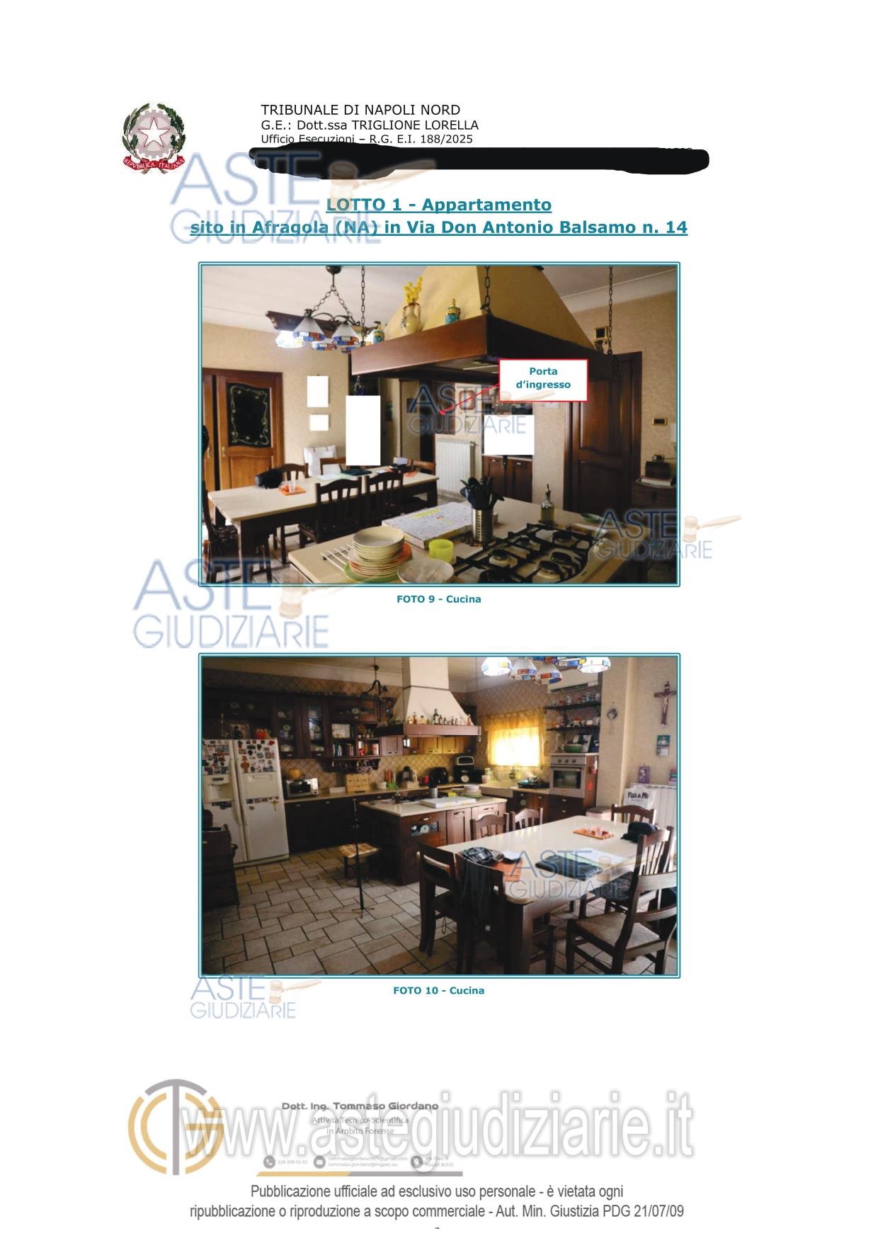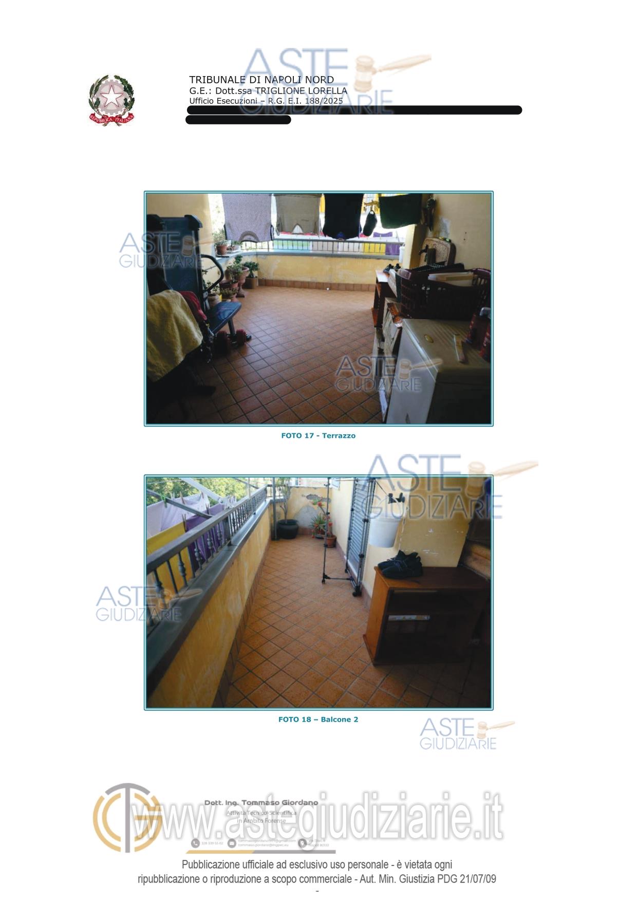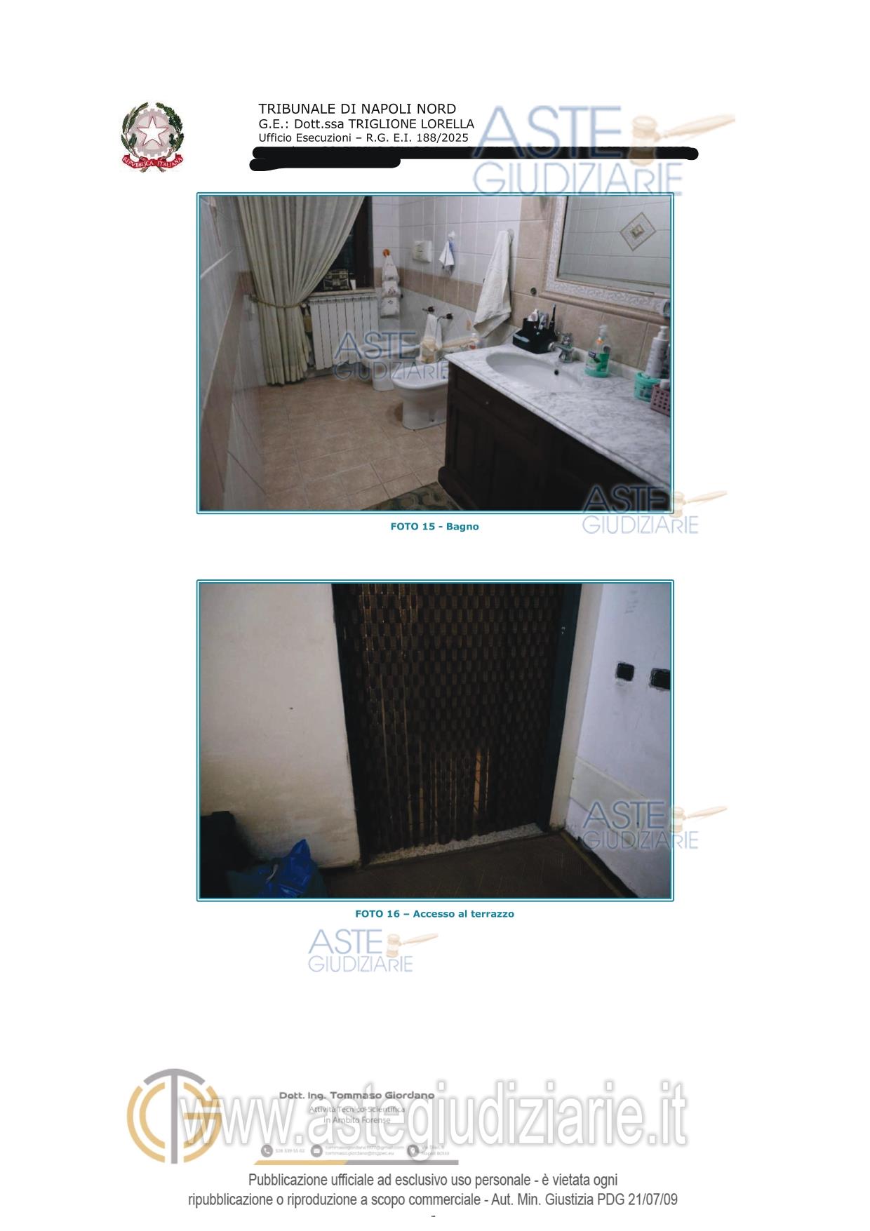 Vendita all'asta Senza incanto, con gara telematica asincrona - LOTTO 1: Piena e intera proprietà di appartamento al secondo piano e pertinenziale cantina al piano seminterrato. Si precisa che entrambi sono fusi con altro appartamento e cantina sub 18 (lotto 2) costituendo di fatto un'unità unità abitativa e unica cantina. l'appartamento si compone di ingresso, cucina, vano studio/ripostiglio, ripostiglio bagno. Prezzo base € 123.000,00 (offerta minima € 92.250,00). Data inizio operazioni di vendita: 23/06/2026 ore 12:00. Professionista delegato alla vendita Avv. Tommasina Valentina Panico - Email "panico.valentina@libero.it"; Tel. 08118820912. Custode Giudiziario Avv. Tommasina Valentina Panico - Email "panico.valentina@libero.it"; Tel. 08118820912. Rif. Tribunale di Napoli Nord - Espropriazione immobiliare (cartabia) n. 188/2025