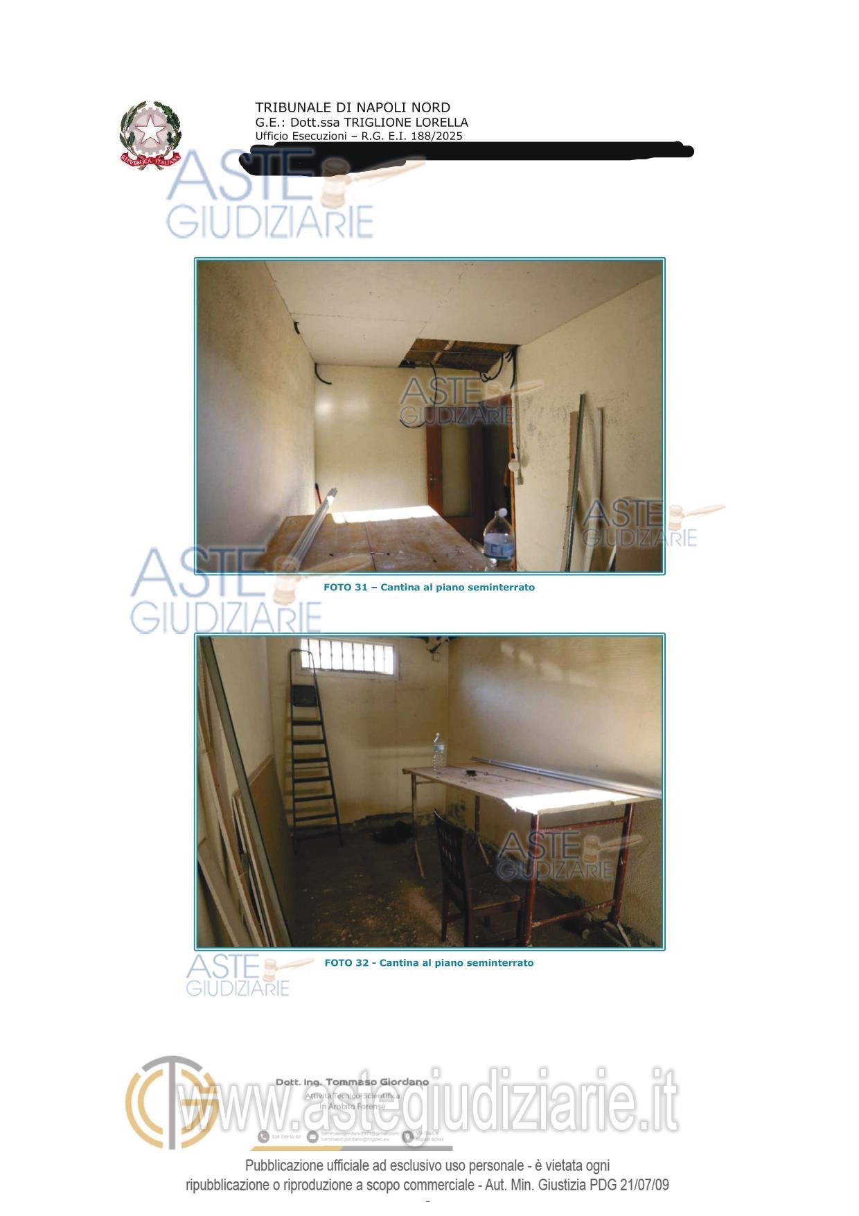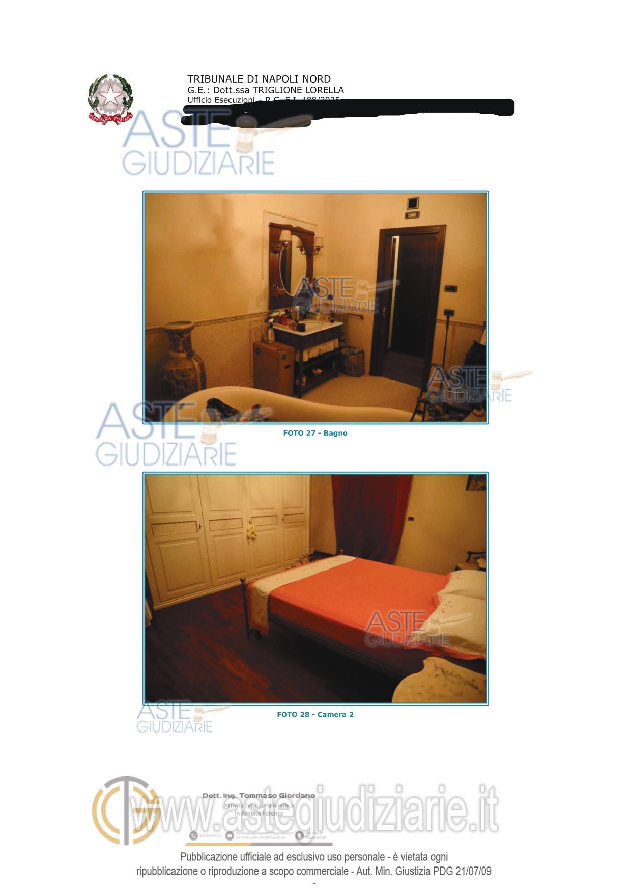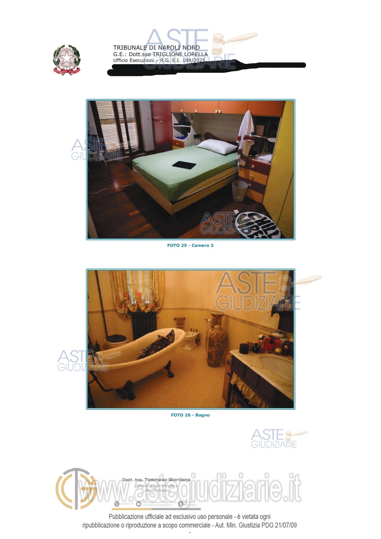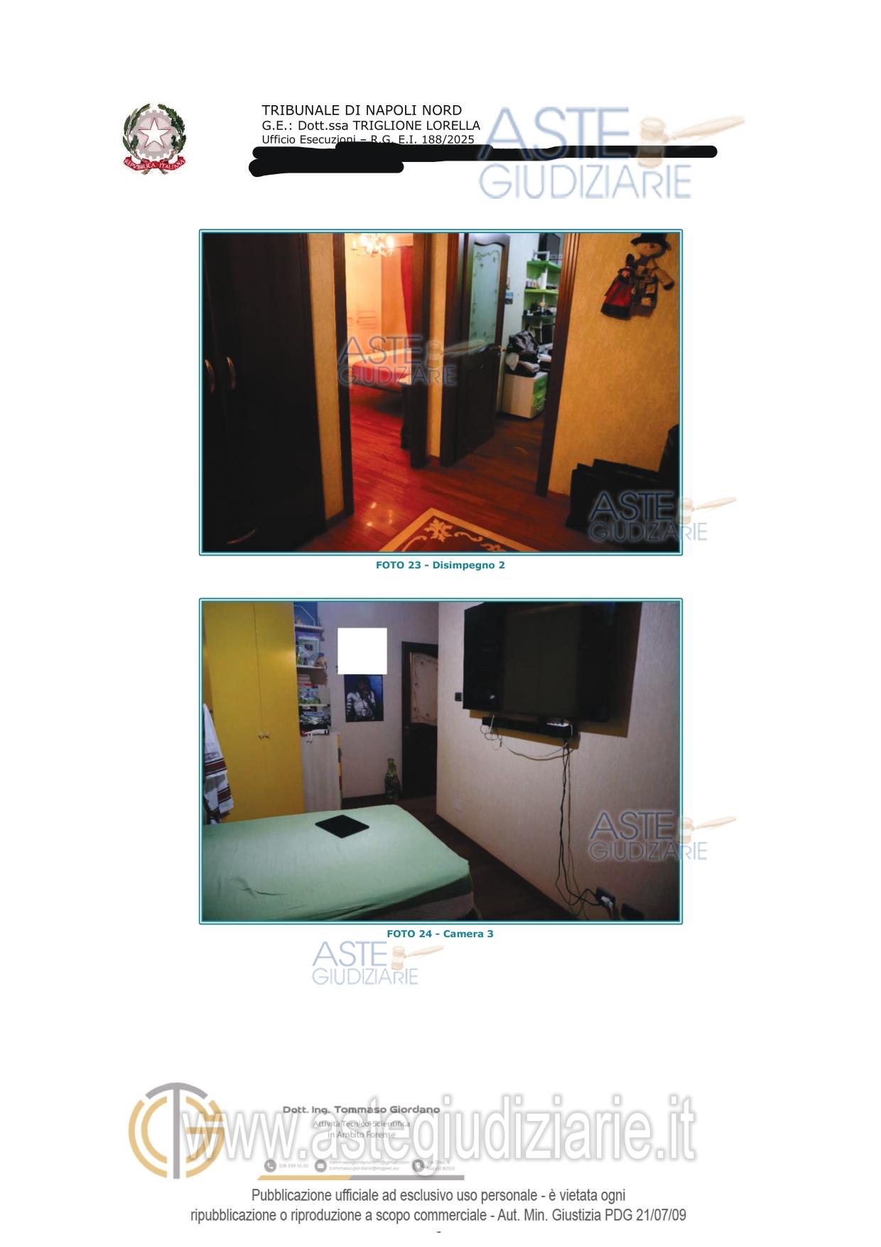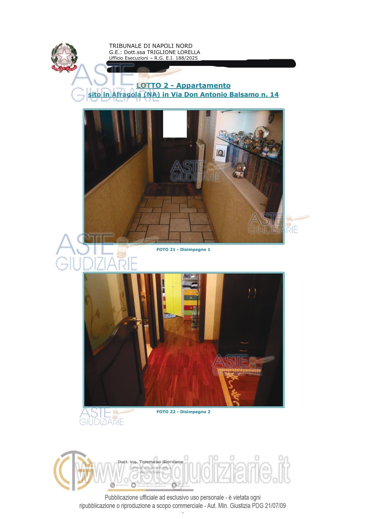 Vendita all'asta Senza incanto, con gara telematica asincrona - LOTTO 2: Piena e intera proprietà di appartamento al secondo piano con ingresso dalla porta a destra di chi sale le scale, e pertinenziale cantina al piano seminterrato. Si precisa che entrambi sono fusi con altro appartamento e cantina sub 17 (lotto 1) costituendo di fatto un'unità unità abitativa e unica cantina. L'appartamento si compone di ingresso, Bagno, tre camere da letto di cui una dotata di cabina armadio. Prezzo base € 128.000,00 (offerta minima € 96.000,00). Data inizio operazioni di vendita: 23/06/2026 ore 12:00. Professionista delegato alla vendita Avv. Tommasina Valentina Panico - Email "panico.valentina@libero.it"; Tel. 08118820912. Custode Giudiziario Avv. Tommasina Valentina Panico - Email "panico.valentina@libero.it"; Tel. 08118820912. Rif. Tribunale di Napoli Nord - Espropriazione immobiliare (cartabia) n. 188/2025