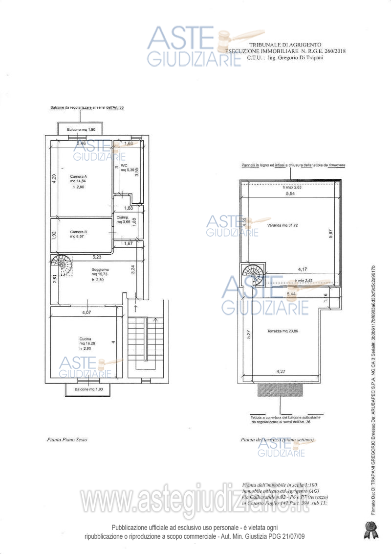 Vendita all'asta Senza incanto, con gara telematica sincrona mista - LOTTO UNICO: Piena proprietà per la quota di 1000/1000 di appartamento della superficie commerciale di 88,27 m.q., posto al piano sesto. Note: - presenti difformità edilizie e catastali regolarizzabili per come indicato a pagina 4 e 5 della perizia a firma dell’Ing. G. Di Trapani agli atti della procedura; - spese condominiali scadute ed insolute alla data della perizia € 5.000,00. Prezzo base € 12.463,13 (offerta minima € 9.347,35). Data vendita 29/01/2026 ore 09:15. Giudice Dott. Domenica Spanò. Professionista delegato alla vendita Avv. Flavia Di Rosa - Email "flaviadirosa@libero.it"; Tel. 3498833287. Custode Giudiziario Avv. Flavia Di Rosa - Email "flaviadirosa@libero.it"; Tel. 3498833287. Rif. Tribunale di Agrigento - Esecuzione immobiliare post legge 80 n. 260/2018