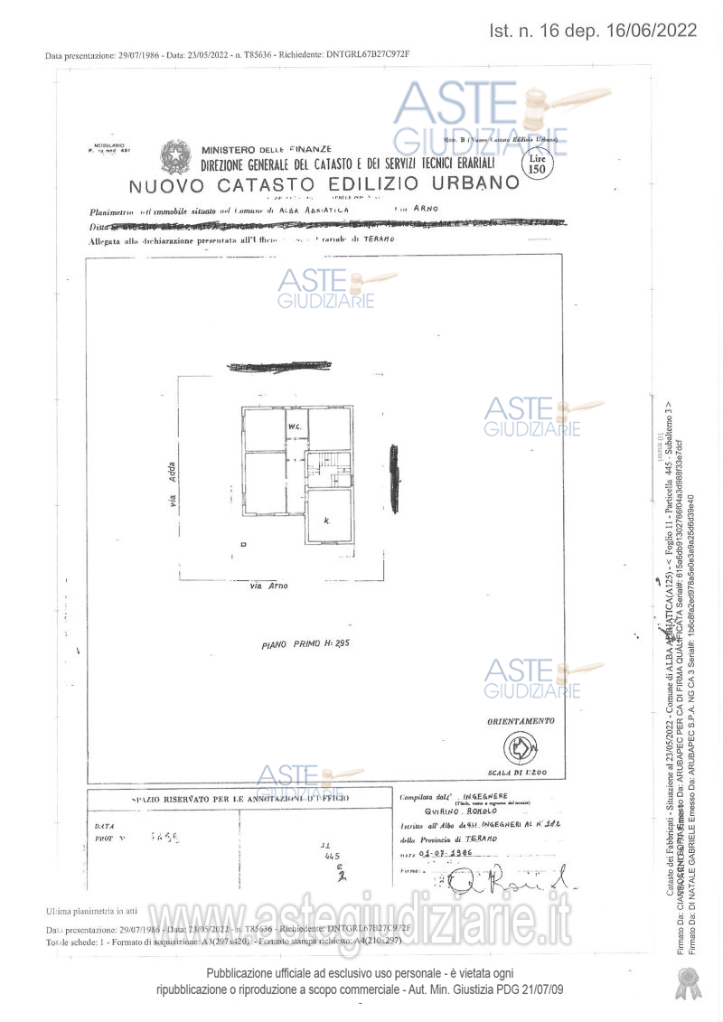 Vendita all'asta Senza incanto, con gara telematica asincrona - LOTTO 2: Diritti pari alla piena proprietà su appartamento di civile abitazione sito in Alba Adriatica (TE) alla Via Arno n.71 (ex 95), sito al piano primo e composto da ingresso, disimpegno, soggiorno, cucina, due camere da letto, bagno e terrazzo, con complessiva superficie catastale di mq. 115,00. Prezzo base € 168.000,00 (offerta minima € 126.000,00). Data inizio operazioni di vendita: 13/05/2026 ore 16:00. Professionista delegato alla vendita Avv. Rosci Marina - Email "m.rosci@studiolegalerosci.it"; Cell. 335202569; Tel. 335202569. Custode Giudiziario Avv. Rosci Marina - Email "m.rosci@studiolegalerosci.it"; Cell. 335202569; Tel. 335202569. Rif. Tribunale di Teramo - Esecuzione immobiliare post legge 80 n. 279/2018
