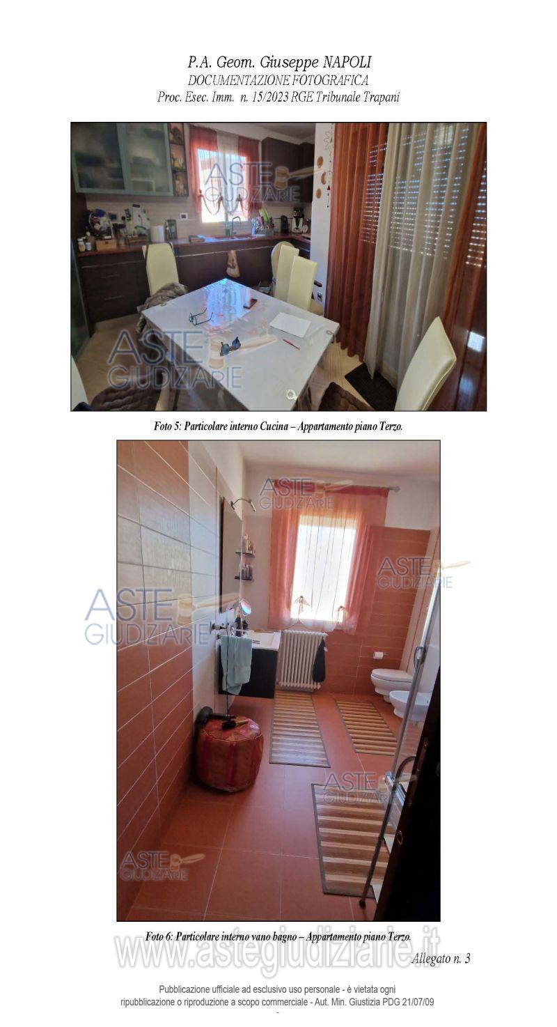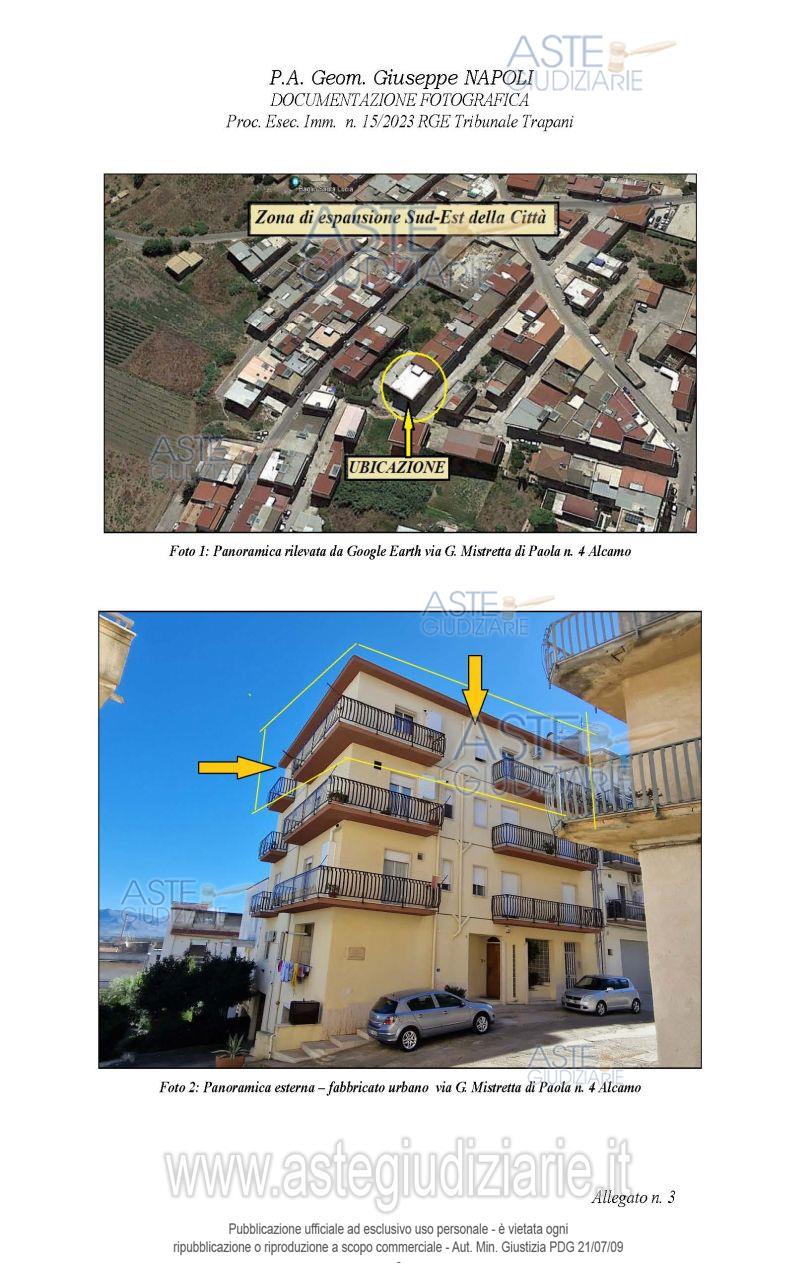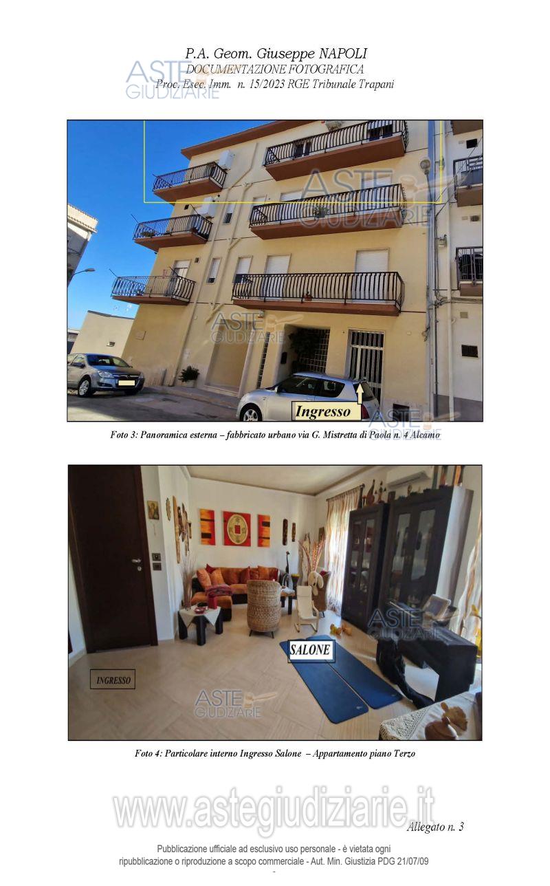 Vendita all'asta Senza incanto, con gara telematica asincrona - LOTTO UNICO: Piena Proprietà per la quota di 1000/1000 di Appartamento per civile abitazione, al piano terzo, ubicato a Alcamo (TP) - Via Giuseppe Mistretta Di Paola n. 4. Identificato al catasto Fabbricati - Fg. 55, Part. 605, Sub. 5, Categoria A3. Occupato. Sussistono irregolarità. L'immobile fa parte di un edificio condominiale privato, con ingresso unico. Prezzo base € 115.000,00 (offerta minima € 86.250,00). Data inizio operazioni di vendita: 19/05/2026 ore 16:30. Giudice Dott. Giovanni Campisi. Professionista delegato alla vendita Avv. Maria Cristina Pirrone - Email "cristina.pirrone@libero.it"; Cell. 3491474849. Custode Giudiziario Avv. Maria Cristina Pirrone - Email "cristina.pirrone@libero.it"; Cell. 3491474849. Rif. Tribunale di Trapani - Esecuzione immobiliare post legge 80 n. 15/2023