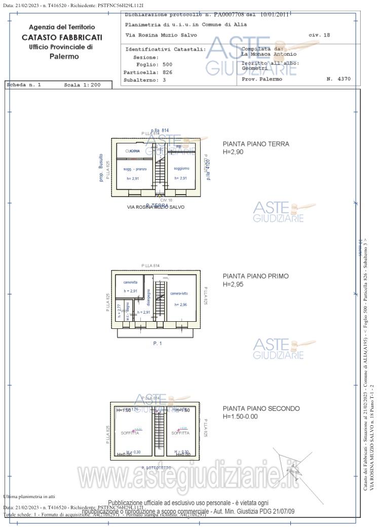 Vendita all'asta Senza incanto, con gara telematica sincrona - LOTTO UNICO: piena ed intera proprietà di Abitazione sita ad Alia (PA) in Via Rosina Muzio Salvo civ. 18, Cat. A/4 - classe 2 - foglio 500 - p.lla 826 sub 3 - p. T- 1 – 2, cons. cat. 6,5 vani, superficie 117 mq, rendita € 208,13, composta da: al P.T una cucina e sala da pranzo; un wc doccia posto nel sottoscala, un soggiorno; al P1 una camera da letto, una cameretta e un WC bagno; dal primo piano si accede, mediante una scala, al sottotetto utilizzato come locale di sgombero. Prezzo base € 21.339,50 (offerta minima € 16.005,00). Data vendita 21/04/2026 ore 09:30. Professionista delegato alla vendita Avv. Alessandra Castagnetta - Email "alessandra.castagnetta@gmail.com"; Tel. 0916154268. Custode Giudiziario Avv. Alessandra Castagnetta - Email "alessandra.castagnetta@gmail.com"; Tel. 0916154268. Rif. Tribunale di Termini Imerese - Esecuzione immobiliare post legge 80 n. 114/2022