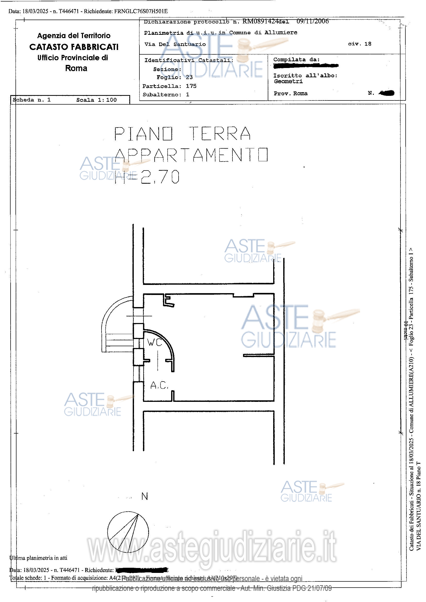 Vendita in attesa dell'emissione del nuovo bando d'asta. LOTTO 0: Piena proprietà appartamento sito nel Comune di Allumiere (RM) alla Via Adolfo Klitsche n. 18, piano T, composto da unico ambiente adibito a soggiorno, pranzo, letto con piccolo angolo cottura e bagno, in NCEU del Comune di Allumiere al foglio 23, particella 175, sub 1, cat. A/4, cl. 2, vani 1, superficie catastale 37 mq., R,C, € 48,55, Via del Santuario n. 18, Piano T. Ultimo prezzo base € 15.300,00 (offerta minima € 11.475,00). Giudice Stefano Palmaccio. Professionista delegato alla vendita Avv. Luca Marconi - Email "studiomarconiluca@virgilio.it"; Cell. 3403311347; Tel. 076621272. Custode Giudiziario Avv. Luca Marconi - Email "studiomarconiluca@virgilio.it"; Cell. 3403311347; Tel. 076621272. Rif. Tribunale di Civitavecchia - Espropriazione immobiliare (cartabia) n. 221/2024