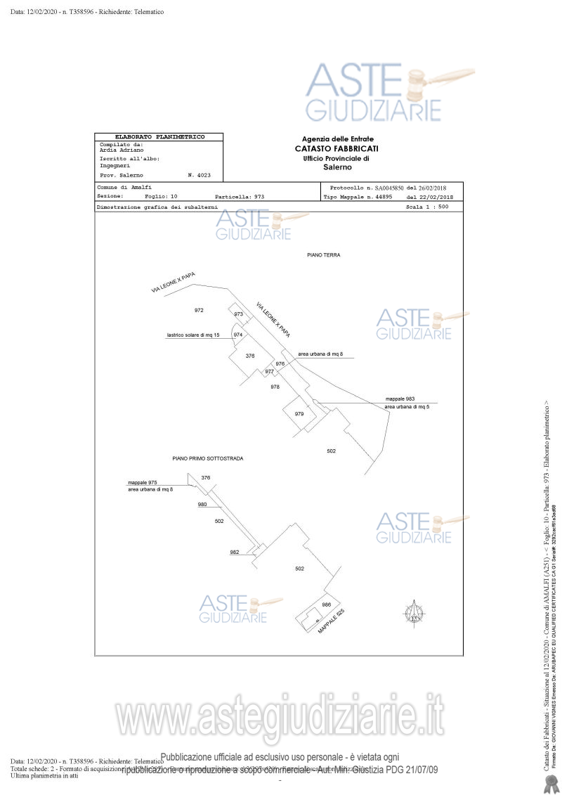 Vendita all'asta Senza incanto, con gara telematica asincrona - LOTTO UNICO: Unità abitativa indipendente, composta da un vano ed accessori, due terrazzi a livello e sottostante cantinola con area cortilizia, in via Papa Leone X n.2 del Comune di Amalfi (SA) (distinto al NCEU del Comune di Amalfi (SA) al fg. 10, p.lla 376 sub. 2, part. 974 sub.1, part. 975 sub.1, part. 977 sub.1, graffate, cat. A/4, di 3^ classe, 3 vani, piano terra, r.c. euro 92,96). Prezzo base € 250.000,00 (offerta minima € 187.500,00). Data inizio operazioni di vendita: 02/04/2026 ore 10:00. Giudice Dott. Giuseppina Valiante. Professionista delegato alla vendita Avv. Marco Panico. Custode Giudiziario Avv. Marco Panico - Email "studiolegaleavvmarcopanico@gmail.com"; Cell. 3398366768. Rif. Tribunale di Salerno - Esecuzione immobiliare post legge 80 n. 222/2019