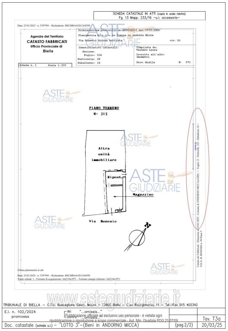 Vendita in attesa dell'emissione del nuovo bando d'asta. LOTTO 1: Al piano secondo: unità immobiliare abitativa (con accesso dalla corte transitoria al civico 50 e poi dal civico 50 attraverso atrio/vano scala comune e balcone) composta da ingresso, cucina, due camere, bagno, ripostiglio e tre balconi. Ultimo prezzo base € 21.000,00 (offerta minima € 15.750,00). Professionista delegato alla vendita Dott. Francesco Marchesi - Email "vendite@bcmz.it"; Tel. 0158853156. Custode Giudiziario Dott. Francesco Marchesi - Email "vendite@bcmz.it"; Tel. 0158853156. Rif. Tribunale di Biella - Espropriazione immobiliare (cartabia) n. 102/2024