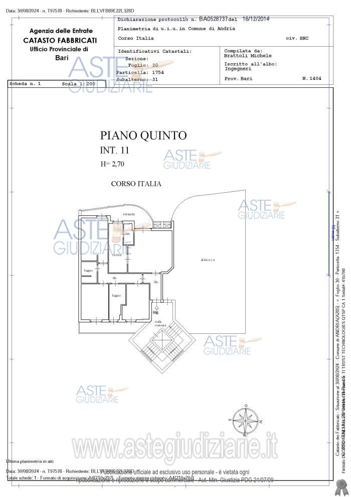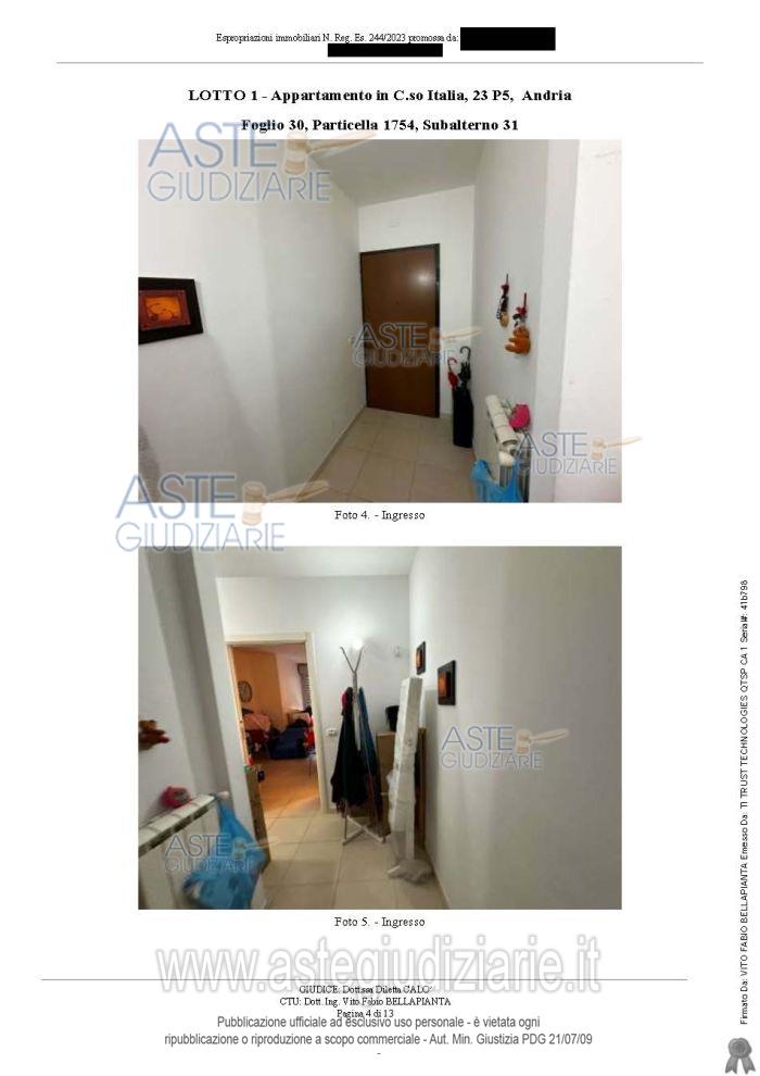 Vendita all'asta Senza incanto, con gara telematica sincrona - LOTTO 1:  Piena proprietà superficiaria quota di 1/1 di immobile abitativo tipo civile sito in Andria (BT) al Corso Italia n. 23 piano 5, con accesso a sinistra per chi sale le scale, con una superficie commerciale complessiva di mq 148,12. L’appartamento si compone di ingresso/disimpegno, zona living, cucina, lavanderia, letto 1 wc 1, letto 2, wc 2 letto 3, pavimentato con piastrelle in gres porcellanato, impianti elettrici sottotraccia a 220v impianti termici, idrici e fognanti . Prezzo base € 152.085,60 (offerta minima € 114.064,20). Data vendita 04/11/2025 ore 10:00. Professionista delegato alla vendita Avv. Vincenza De Gioia - Email "avv.degioia@gmail.com"; Cell. 3285390521; Tel. 0802084144. Custode Giudiziario Avv. Vincenza De Gioia - Email "avv.degioia@gmail.com"; Cell. 3285390521; Tel. 0802084144.  Rif. Tribunale di Trani - Espropriazione immobiliare (cartabia) n. 244/2023