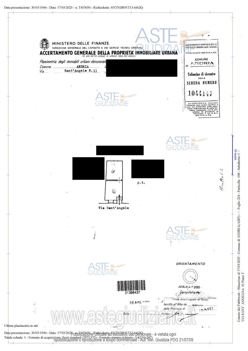 Vendita all'asta Senza incanto, con gara telematica sincrona - LOTTO UNICO: Appartamento ubicato a Andria (BT) alla Via Sant'Angelo, 33, piano T, composto da ingresso in pranzo-soggiorno, una camera da letto, bagno ed un soppalco in legno sulla camera da letto con funzione di ripostiglio, pavimentazione dell'appartamento è composta da ceramica, porte interne sono in legno, infissi esterni sono in pvc, porta d'ingresso è blindata. Ident.al catasto Fabbr. - Fg. 224, Part. 108, Sub. 1, Cat.A4, cl.3, vani 2, mq 51, rendita €.118,79. Prezzo base € 53.422,50 (offerta minima € 40.066,88). Data vendita 18/06/2026 ore 12:00. Giudice Margherita Valeriani. Professionista delegato alla vendita Dott. Mariateresa Quinto - Email "quintomt.esecuzioni@libero.it"; Tel. 0808987840. Custode Giudiziario Dott. Mariateresa Quinto - Email "quintomt.esecuzioni@libero.it"; Tel. 0808987840. Rif. Tribunale di Trani - Espropriazione immobiliare (cartabia) n. 202/2024