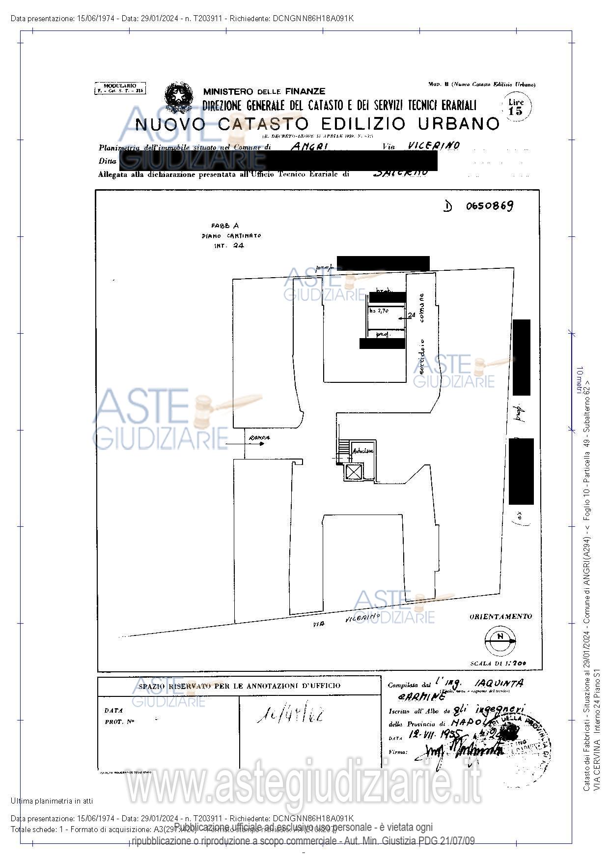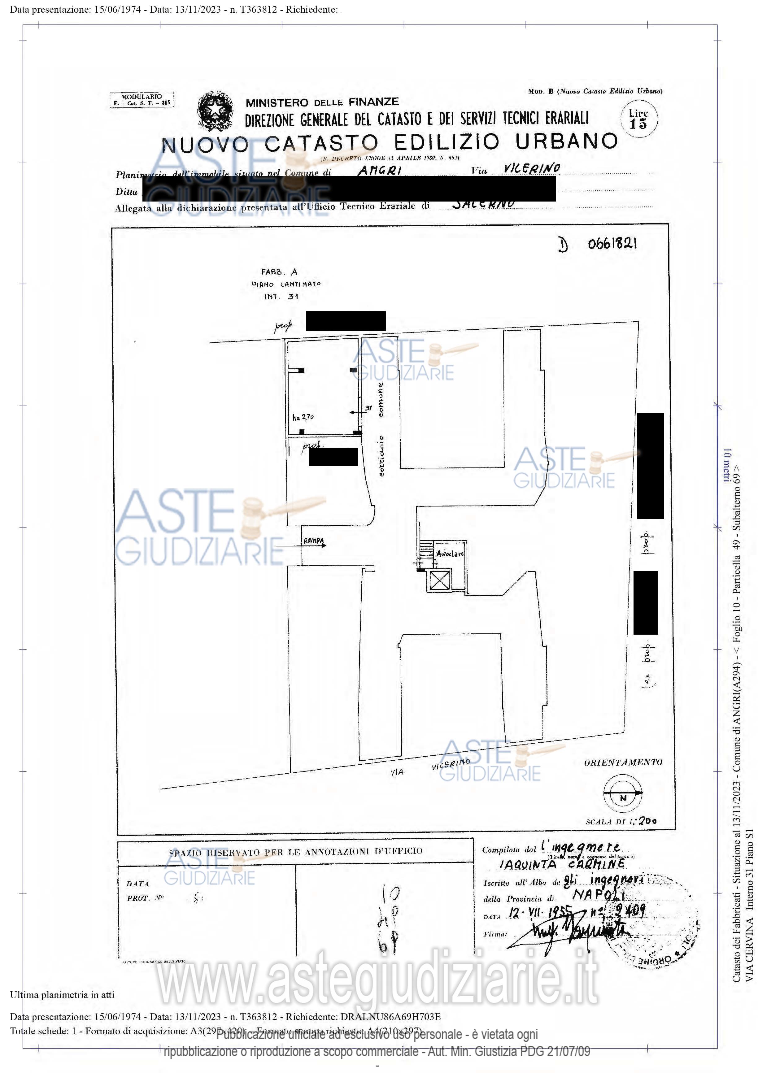 The garage is located on the basement floor of a condominium located in the South-East area of the Municipality of Angri at Via Cervinia, 27. Prezzo base € 116.333,00 (offerta minima € 104.699,70). Data inizio operazioni di vendita: 25/11/2025 ore 10:00. Giudice Dott. Bianca Manuela Longo. Custode Giudiziario Aste Giudiziarie Inlinea Spa - Email "vendite@astegiudiziarie.it"; Tel. 0586 201480. Curatore Dott. Loredana Cioffi - Tel. 339 64 95 239. Rif. Tribunale di Nocera Inferiore - Fallimentare (nuovo rito) n. 51/2019
