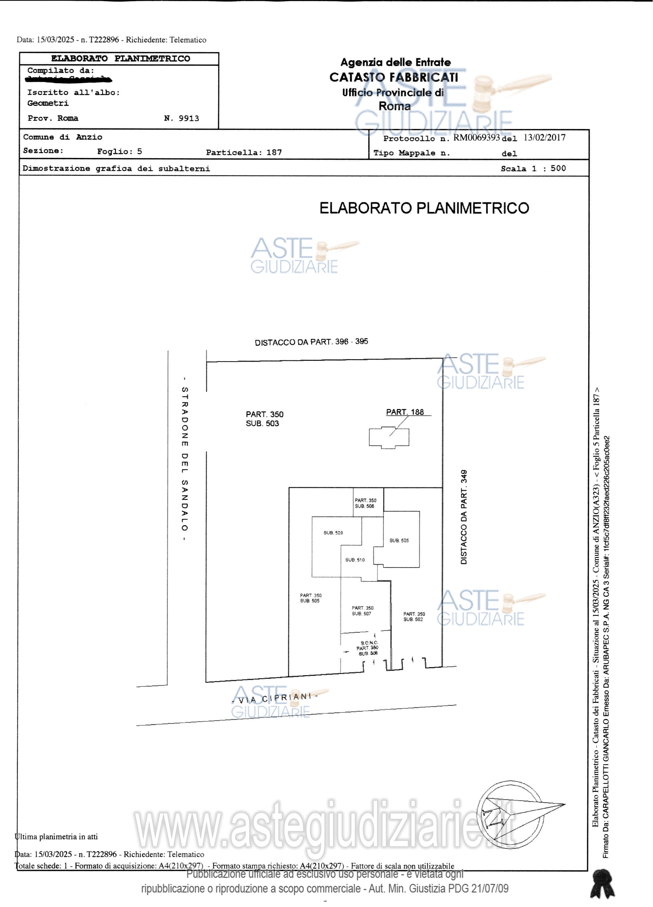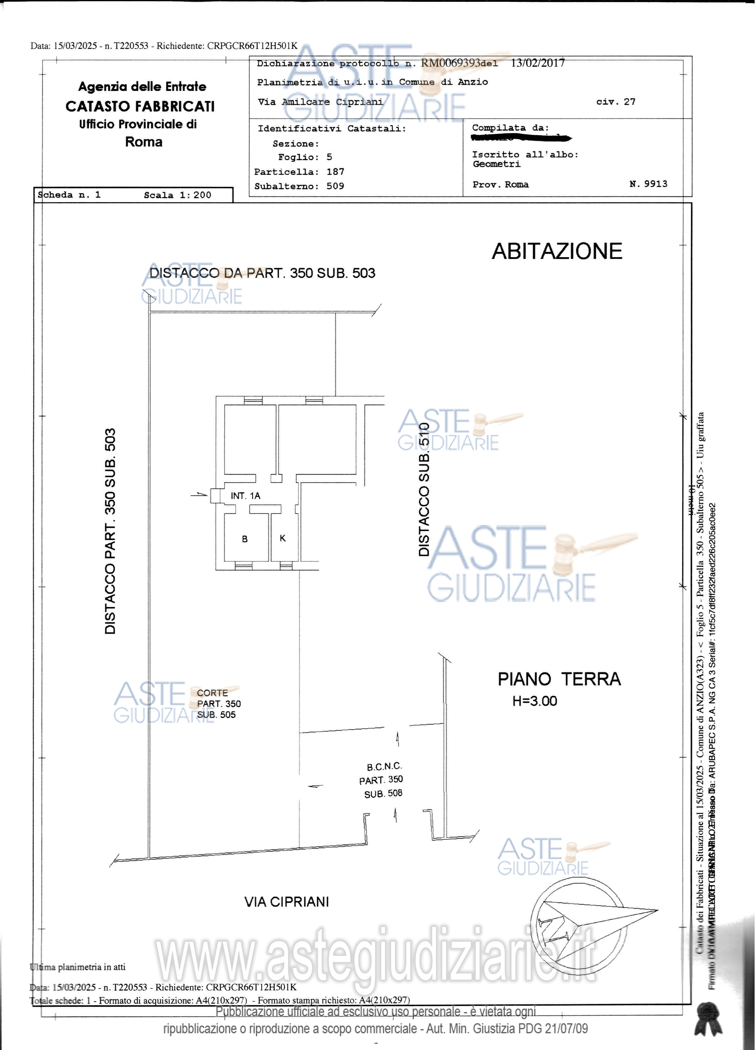 Vendita all'asta Senza incanto, con gara telematica asincrona - LOTTO UNICO: L’immobile si sviluppa su un unico livello-piano terra e risulta composta da ingresso/disimpegno, soggiorno, cucina, bagno e camera da letto con annessa area cortilizia di uso esclusivo, identificato in Catasto Fabbricati foglio 5, part. 350-187, sub 509, cat A 3, graffato 505. Superficie convenzionale 123,04mq tra interno esterno. Prezzo base € 87.375,00 (offerta minima € 65.531,25). Data inizio operazioni di vendita: 11/06/2026 ore 10:00. Giudice Dott. Anna Luisa Di Serafino. Professionista delegato alla vendita Avv. Claudia Lenci. Custode Giudiziario Avv. Claudia Lenci - Email "claudialenci@icloud.com"; Cell. 3392859974; Tel. 0662286850. Rif. Tribunale di Velletri - Espropriazione immobiliare (cartabia) n. 500/2024