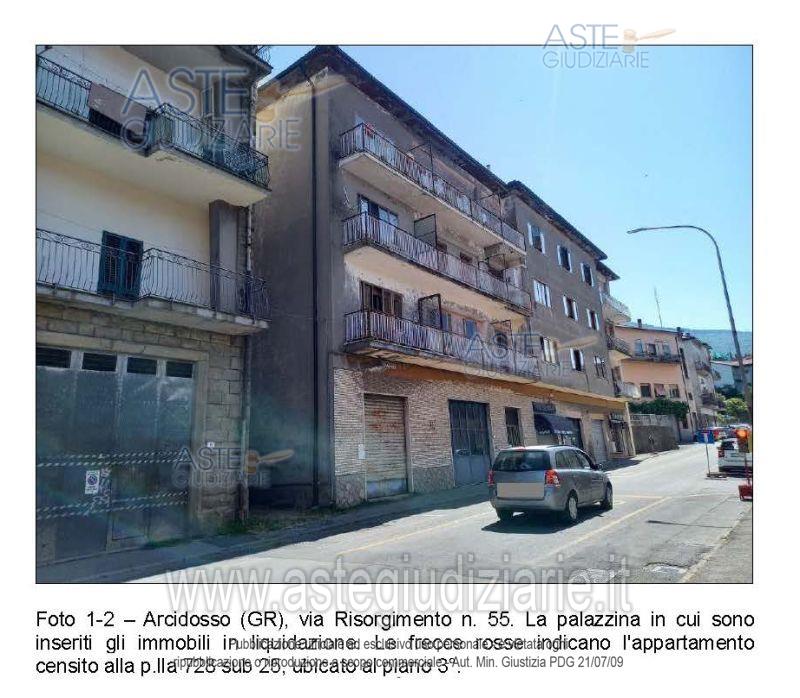 Vendita all'asta Senza incanto, con gara telematica sincrona mista - LOTTO UNICO: Compendio residenziale costituito da un APPARTAMENTO per civile abitazione ubicato al piano terzo oltre a due SOFFITTE ubicate al piano quarto (sottotetto), inseriti in una palazzina condominiale realizzata su quattro livelli fuori terra oltre al sottotetto, ubicata in via Risorgimento n. 55 ad Arcidosso (GR) con accesso anche da Largo Sant'Antonio n. 9. Prezzo base € 80.000,00 (offerta minima € 60.000,00). Data vendita 08/04/2026 ore 11:00. Curatore Avv. Alessandro Oneto - Email "info@studionetocarollo.it"; Tel. 0564418541. Rif. Tribunale di Grosseto - Fallimentare (nuovo rito) n. 3483/2003