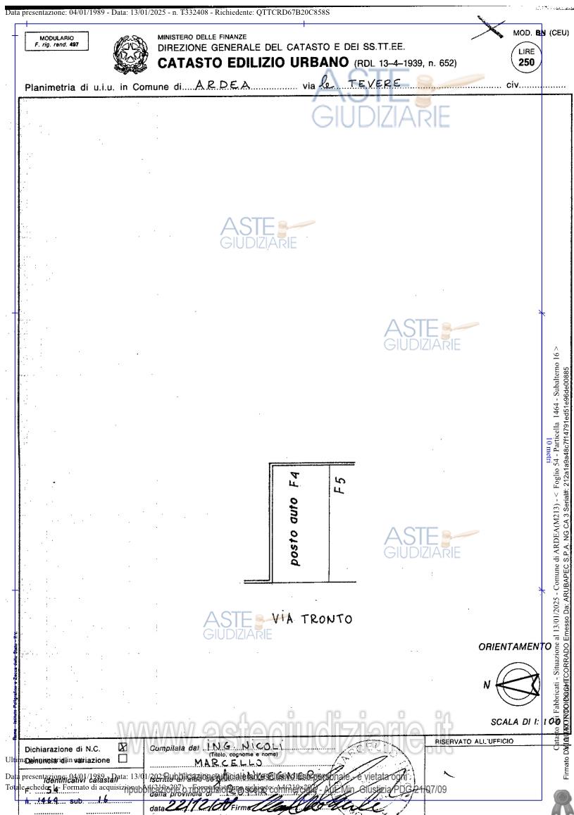 Vendita all'asta Senza incanto, con gara telematica asincrona - LOTTO UNICO: Appartamento di circa 45mq ubicato in Ardea (RM) in via Teverone n.15 Scala F, Int. 4, posto al piano terra. Entrando dal cancello pedonale troviamo un piccolo giardino di pertinenza con portico d’accesso all’abitazione. Completa la proprietà un posto auto scoperto (mq. 8,60) posto al di fuori dell’abitazione su descritta e sito in via Teverone e distinto come “F4”. Prezzo base € 60.000,00 (offerta minima € 45.000,00). Data inizio operazioni di vendita: 19/01/2026 ore 10:30. Professionista delegato alla vendita Avv. Salvatore Di Marco - Email "studiolegale.dimarco@libero.it"; Cell. 3332996836; Tel. 0689014502. Custode Giudiziario Avv. Salvatore Di Marco - Email "studiolegale.dimarco@libero.it"; Cell. 3332996836; Tel. 0689014502. Rif. Tribunale di Velletri - Espropriazione immobiliare (cartabia) n. 444/2024