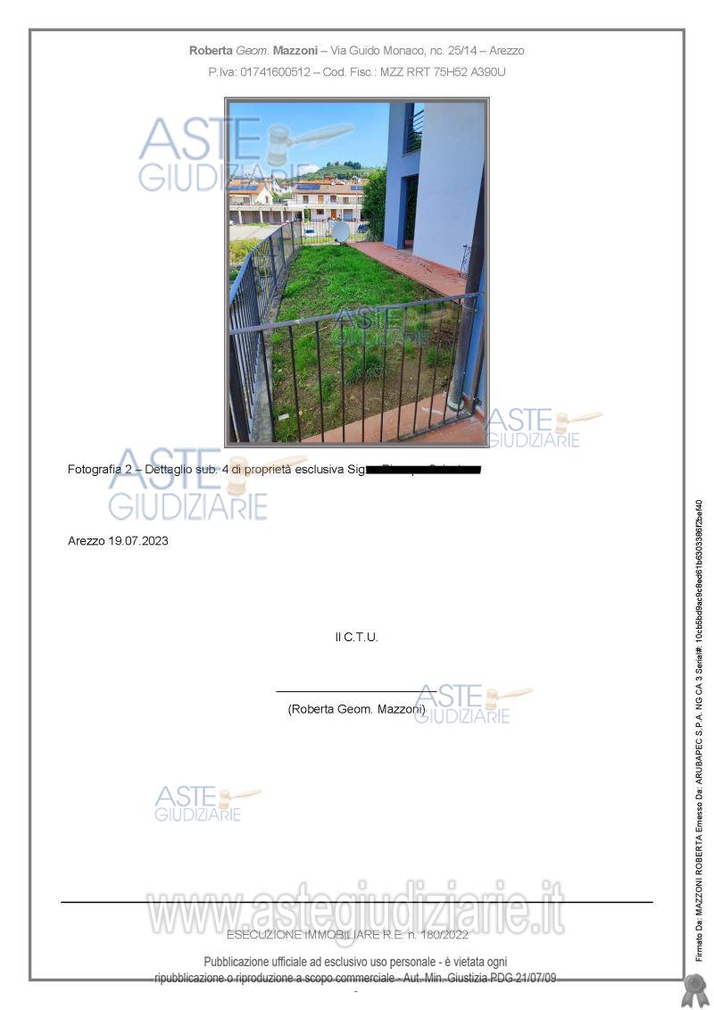 Vendita all'asta Senza incanto, con gara telematica sincrona mista - LOTTO UNICO: APPARTAMENTO SITO IN AREZZO, LOC. BATTIFOLLE, POSTO AL PIANO TERRA, CORREDATO DA BOX AUTO E RESEDE ESCLUSIVO. Prezzo base € 94.330,00 (offerta minima € 70.747,50). Data vendita 16/12/2025 ore 09:00. Professionista delegato alla vendita Avv. Francesca Tanti - Email "avvfrancescatanti@gmail.com"; Cell. 3332681490; Tel. 057527861. Custode Giudiziario Istituto Vendite Giudiziarie Arezzo - Siena - Email "visite.ivg@gmail.com"; Cell. 3397337017; Tel. 0577318111. Rif. Tribunale di Arezzo - Esecuzione immobiliare post legge 80 n. 180/2022