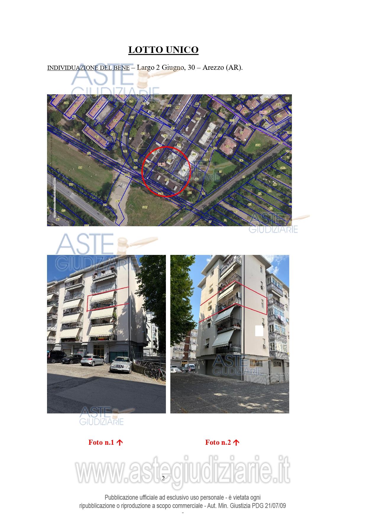 Vendita all'asta Senza incanto, con gara telematica sincrona mista - LOTTO UNICO: Diritto di piena proprietà per l’intero su di un appartamento di civile abitazione posto al piano terzo di un immobile di maggior consistenza, sito in Arezzo (AR), Via Largo 2 Giugno, n°30, corredato da posto auto e cantina al piano seminterrato. Prezzo base € 71.000,00 (offerta minima € 53.250,00). Data vendita 15/07/2026 ore 10:00. Professionista delegato alla vendita Dott. Soledad Angelillo Tarussio - Email "soledad.angelillo@gmail.com"; Cell. 3397329326; Tel. 3397329326. Custode Giudiziario Avv. Istituto Vendite Giudiziarie Arezzo-Siena - Email "visite.ivg@gmail.com"; Cell. 3397337017; Tel. 0577318111. Rif. Tribunale di Arezzo - Espropriazione immobiliare (cartabia) n. 1/2024