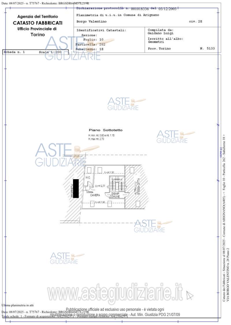 Vendita all'asta Senza incanto, con gara telematica asincrona - LOTTO UNICO: nella palazzina elevata a due piani fuori terra oltre sottotetto mansardato: - al piano sottotetto (3° f.t.) senza ascensore: alloggio monolocale della superficie commerciale di 29 mq con disimpegno e servizi, riscaldamento autonomo con radiatori e caldaia. Completa la proprietà il diritto di usoperpetuo, trasmissibile con l'alloggio, dell'area di cortile individuata con il numero 10 (posto auto P.10) nella pianta del piano terreno allegata al Regolamento di Condominio. Prezzo base € 24.000,00 (offerta minima € 18.000,00). Data inizio operazioni di vendita: 26/05/2026 ore 10:00. Professionista delegato alla vendita Dott. Mauro Binello Vigliani - Email "studio@studiobvb.it"; Tel. 011539276. Custode Giudiziario Dott. Ifir Piemonte Istituto Vendite Giudiziarie Srl - Email "RICHIESTE.VISITE@ivgpiemonte.it". Rif. Tribunale di Torino - Espropriazione immobiliare (cartabia) n. 303/2025