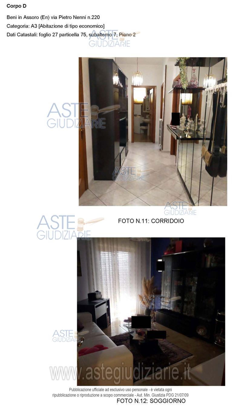 Vendita all'asta Senza incanto, con gara telematica sincrona mista - LOTTO 3: Piena proprietà dell’appartamento per civile abitazione sito in Assoro (EN), via Pietro Nenni n. 220 (ex via Provinciale n. 1-9), piano secondo, della consistenza di n. 6 vani. Prezzo base € 70.476,00 (offerta minima € 52.857,00). Data vendita 23/06/2026 ore 10:30. Giudice Nunzio Noto. Professionista delegato alla vendita Avv. Sara Indovino - Email "studiolegale.saraindovino@gmail.com". Custode Giudiziario Avv. Sara Indovino - Email "studiolegale.saraindovino@gmail.com"; Tel. 3317312856. Rif. Tribunale di Enna - Esecuzione immobiliare post legge 80 n. 9/2022