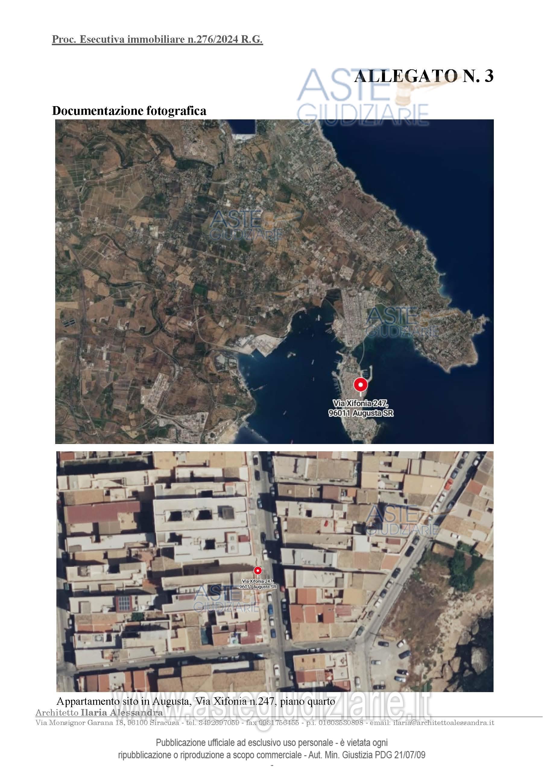 Vendita all'asta Senza incanto, con gara telematica sincrona mista - LOTTO UNICO: Piena proprietà di appartamento, facente parte di un fabbricato residenziale pluripiano, ubicato nel comune di Augusta, in Via Xifonia n.247, al Catasto Fabbricati di detto Comune, Ufficio catastale della Provincia di Siracusa, al foglio 91, particella 3418, subalterno 5, (ex foglio 95, ex particella 934), categoria A/3, classe 3, consistenza 7,5 vani, superficie catastale totale 167 mq, superficie catastale totale escluse aree scoperte 165 mq, rendita 503,55 €, indirizzo Via Xifonia n.247, piano 4. Prezzo base € 31.950,00 (offerta minima € 23.962,50). Data vendita 14/01/2026 ore 12:00. Professionista delegato alla vendita Avv. Lucia Amato - Email "avv.amatolucia@gmail.com"; Cell. 3490588978; Tel. 0931841633. Custode Giudiziario Avv. Lucia Amato - Email "avv.amatolucia@gmail.com"; Cell. 3490588978; Tel. 0931841633. Rif. Tribunale di Siracusa - Esecuzione immobiliare post legge 80 n. 276/2024
