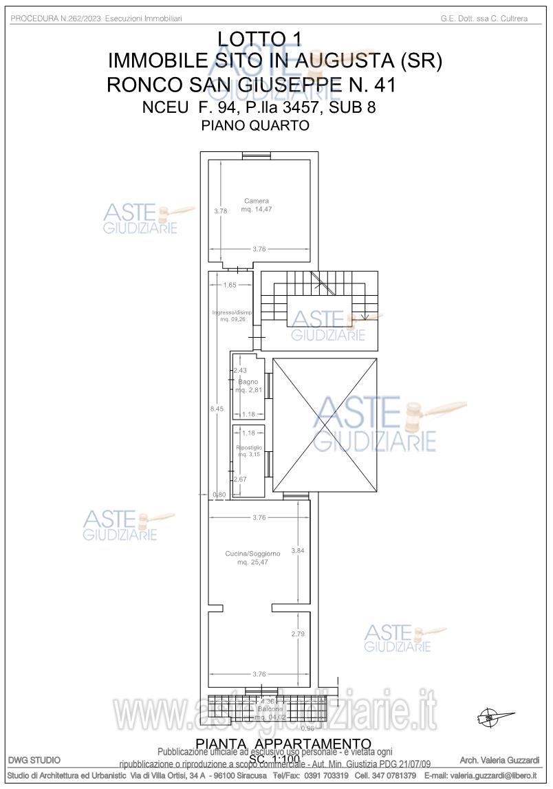 Vendita all'asta Senza incanto, con gara telematica sincrona mista - LOTTO UNICO: immobile sito in Augusta, ronco San Giuseppe n. 41 (di fatto, via San Giuseppe n.41), piano 4, cat. A/4, vani 5, censito al foglio 94, particella 3457 (ex p.lla 334), sub.8 r. c. euro 253,06, superficie catastale 72 mq. Prezzo base € 30.500,00 (offerta minima € 22.875,00). Data vendita 20/05/2026 ore 12:30. Professionista delegato alla vendita Avv. Maria Barsalona - Email "maria.barsalona@gmail.com"; Tel. 0931441414. Custode Giudiziario Avv. Maria Barsalona - Email "maria.barsalona@gmail.com"; Tel. 0931441414. Rif. Tribunale di Siracusa - Espropriazione immobiliare (cartabia) n. 262/2023