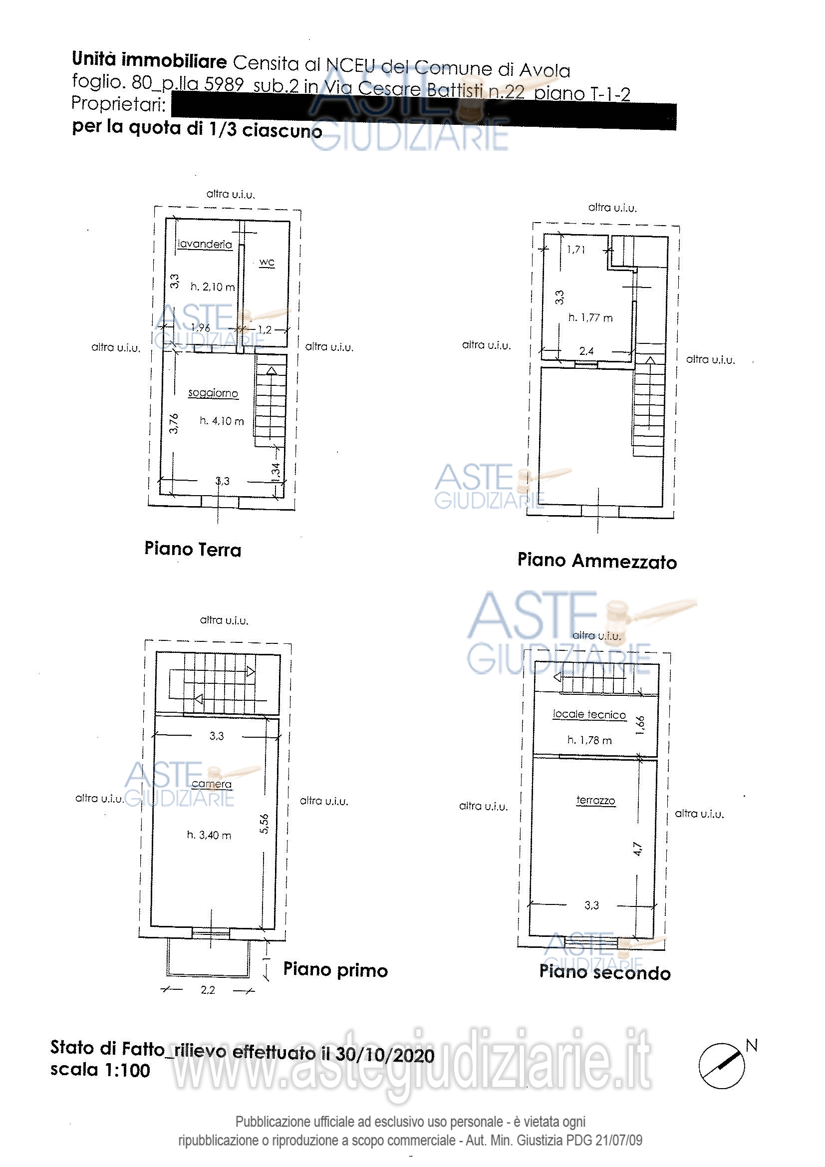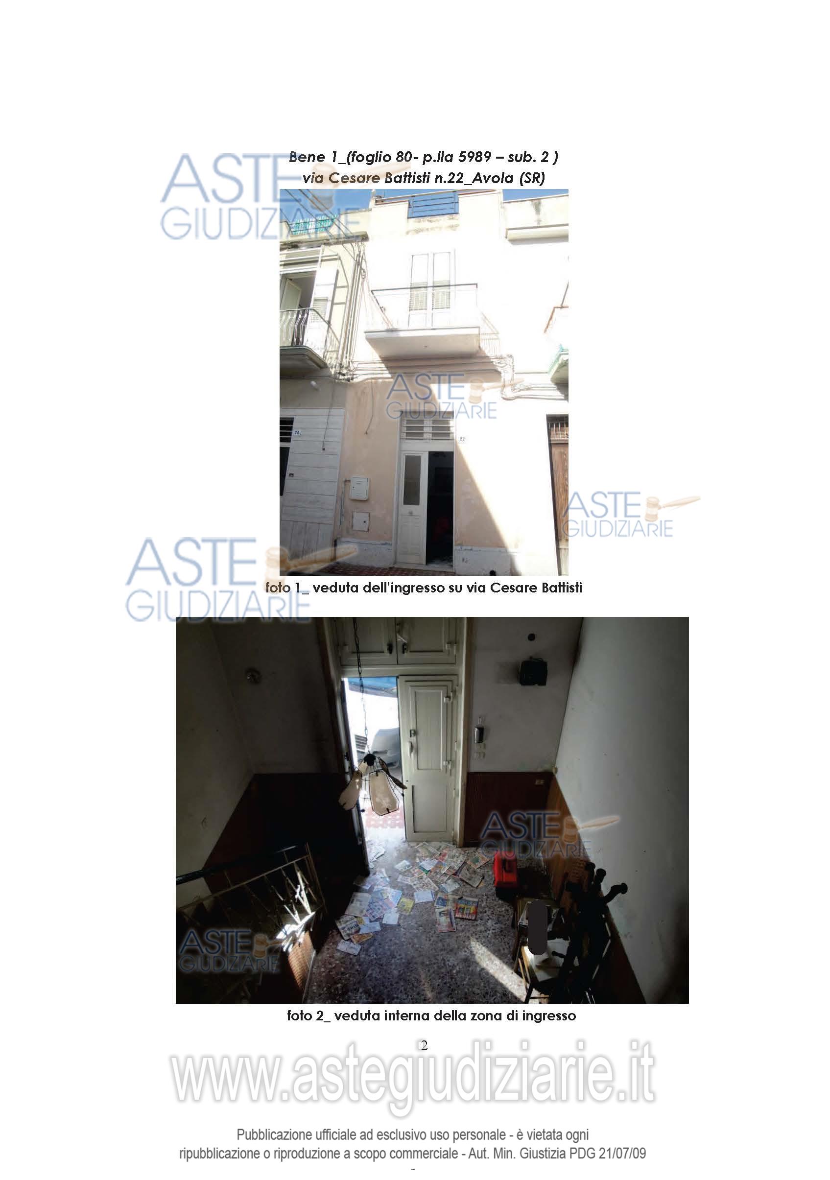 Vendita all'asta Senza incanto, con gara telematica sincrona mista - LOTTO UNICO: Piena proprietà Unità immobiliare per civile abitazione sita presso il comune di Avola (SR), nella via Cesare Battisti al n.22, posto al piano T – 1 - 2 censita nel C.F. del Comune di Avola al foglio 80, p.lla 5989 (ex foglio 84 - p.lla 1218), sub.2, cat. A/4, vani 3, classe 2, superficie catastale 65 mq, R.C. € 127,05. Prezzo base € 19.888,45 (offerta minima € 14.916,34). Data vendita 15/04/2026 ore 11:00. Giudice Giuseppe Solarino. Professionista delegato alla vendita Avv. Simona Matarazzo - Email "avv.simona.matarazzo@gmail.com"; Tel. 0931096234. Custode Giudiziario Avv. Simona Matarazzo - Email "avv.simona.matarazzo@gmail.com"; Tel. 0931096234. Rif. Tribunale di Siracusa - Esecuzione immobiliare post legge 80 n. 526/2012