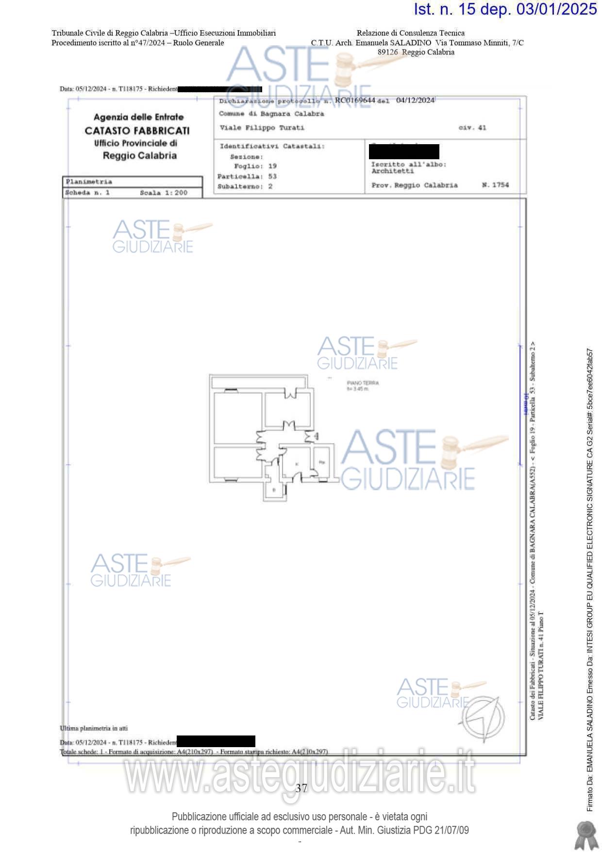 Vendita in attesa dell'emissione del nuovo bando d'asta. LOTTO UNICO: Quota di 1/8 di un immobile destinato a civile abitazione, sito nel Comune di BagnaraCalabra (RC), viale Filippo Turati n. 41 posto al piano terreno di un fabbricato ad unpiano (due f.t.). Ultimo prezzo base € 5.454,00 (offerta minima € 4.090,00). Giudice Dott. Stefano Cantone. Professionista delegato alla vendita Dott. Maurizio Alfieri - Email "maurizio@studioalfieri.info"; Tel. 0965810393. Custode Giudiziario Dott. Maurizio Alfieri - Email "maurizio@studioalfieri.info"; Tel. 0965810393. Rif. Tribunale di Reggio di Calabria - Espropriazione immobiliare (cartabia) n. 47/2024