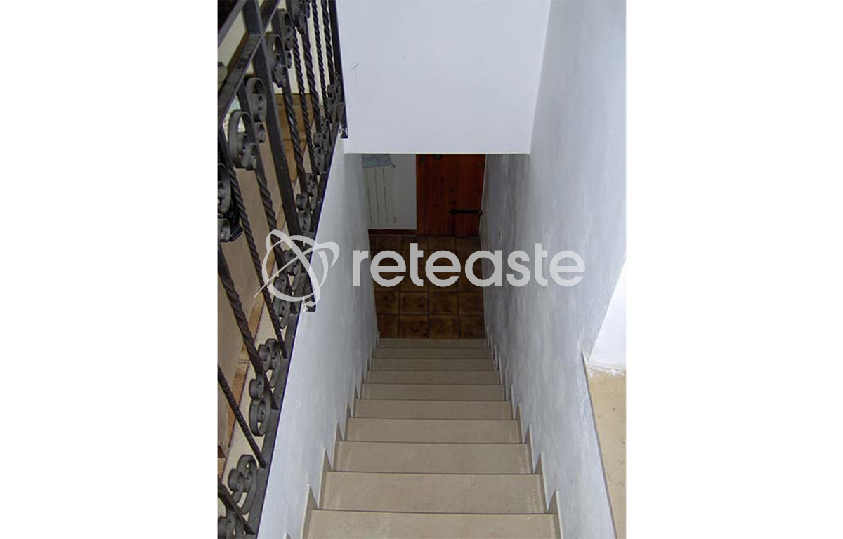 Au deuxième étage, accessible par un dégagement commun avec l'appartement voisin, se trouve un grand et lumineux espace de vie. Cet espace est valorisé par des fenêtres opposées, offrant une vue agréable sur le paysage environnant, et par une belle cheminée en briques apparentes située dans un coin, créant une atmosphère chaleureuse et accueillante. La cuisine, de configuration traditionnelle avec des meubles en bois et des carreaux de céramique, est fonctionnelle et bien organisée. Les murs ont une finition rustique à l'enduit, et le sol est en carreaux. Un escalier intérieur caractéristique avec une rampe en fer forgé mène à l'étage supérieur, dédié à la zone de nuit et aux services. On y trouve les deux chambres à coucher, un pratique débarras et la salle de bain principale, caractérisée par des revêtements de carreaux bleus, avec lavabo, WC et bidet.