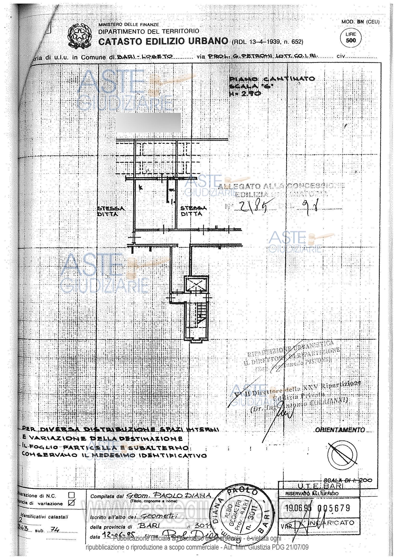 Vendita all'asta Senza incanto, con gara telematica asincrona - LOTTO 7: Porzione immobiliare posta al piano interrato del fabbricato sito in Bari-Loseto, al prolungamento di via Giulio Petroni, via Perrone n. 8, avente accesso dal vano scala dello stabile, posta in posizione centrale rispetto al corridoio di accesso comune. Prezzo base € 10.091,25 (offerta minima € 7.568,44). Data inizio operazioni di vendita: 30/06/2026 ore 17:00. Giudice Cristina Fasano. Professionista delegato alla vendita Avv. Antonio Maria Giacomo Schiavoni - Email "antonio@studioavvocatischiavoni.it". Rif. Tribunale di Bari - Volontaria giurisdizione n. 1382/1999