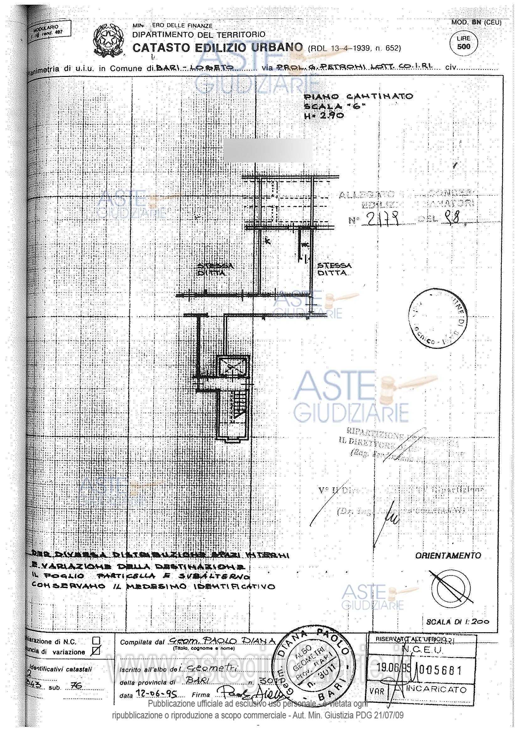 Vendita all'asta Senza incanto, con gara telematica asincrona - LOTTO 9: Porzione immobiliare posta al piano interrato del fabbricato sito in Bari-Loseto, al prolungamento di via Giulio Petroni, via Perrone n. 8, avente accesso dal vano scala dello stabile, posta in posizione centrale rispetto al corridoio di accesso comune. Prezzo base € 11.047,50 (offerta minima € 8.285,63). Data inizio operazioni di vendita: 30/06/2026 ore 17:00. Giudice Cristina Fasano. Professionista delegato alla vendita Avv. Antonio Maria Giacomo Schiavoni - Email "antonio@studioavvocatischiavoni.it". Rif. Tribunale di Bari - Volontaria giurisdizione n. 1382/1999