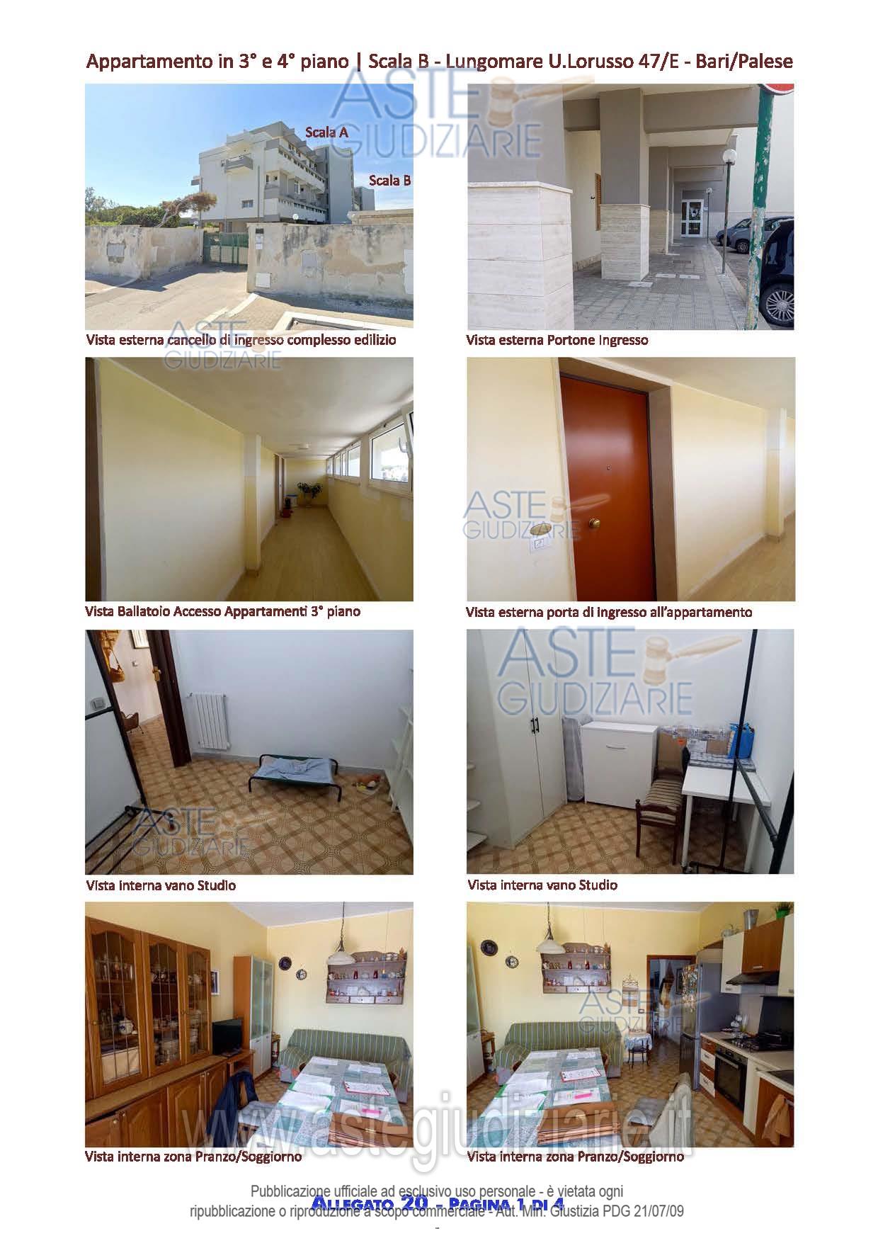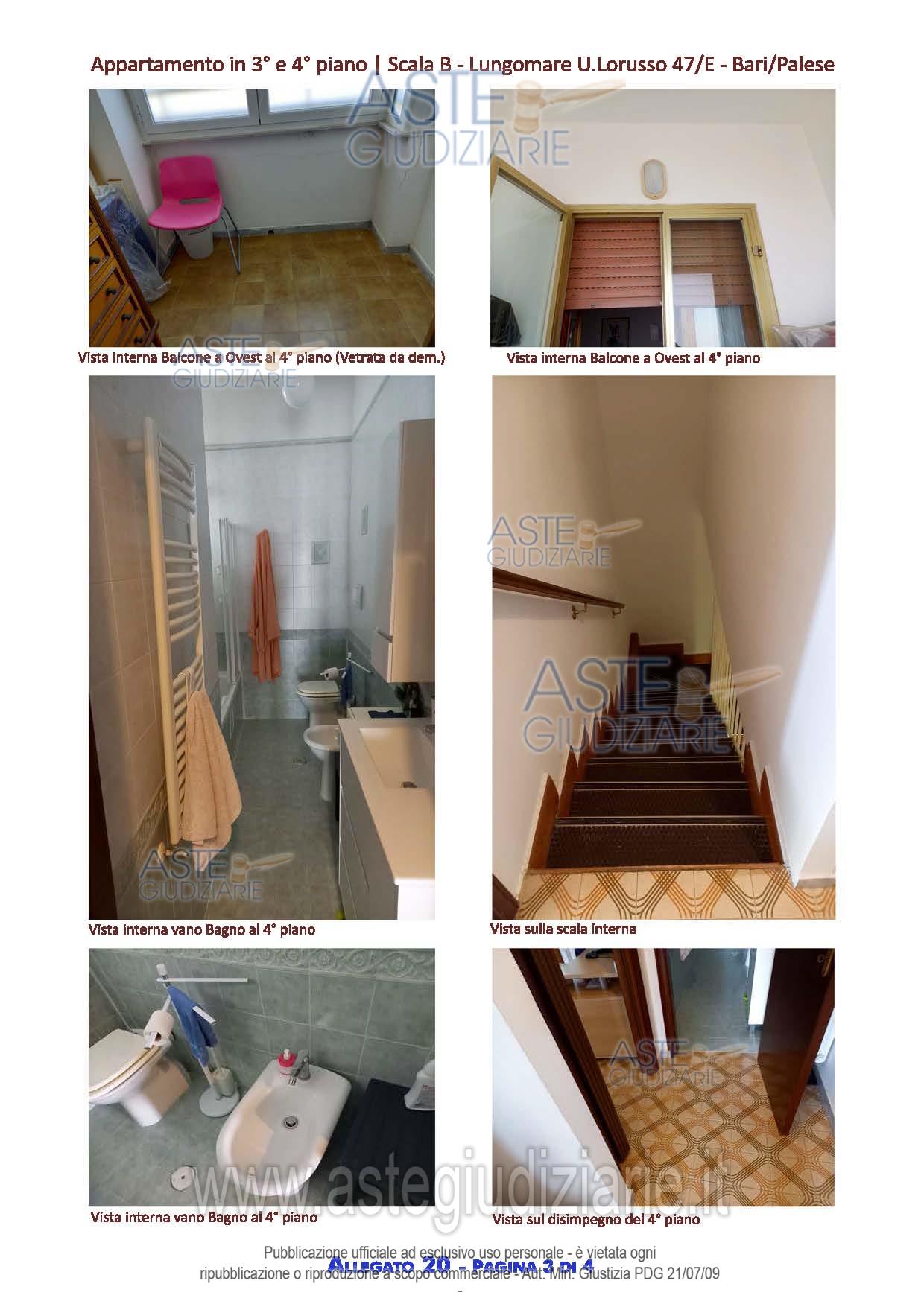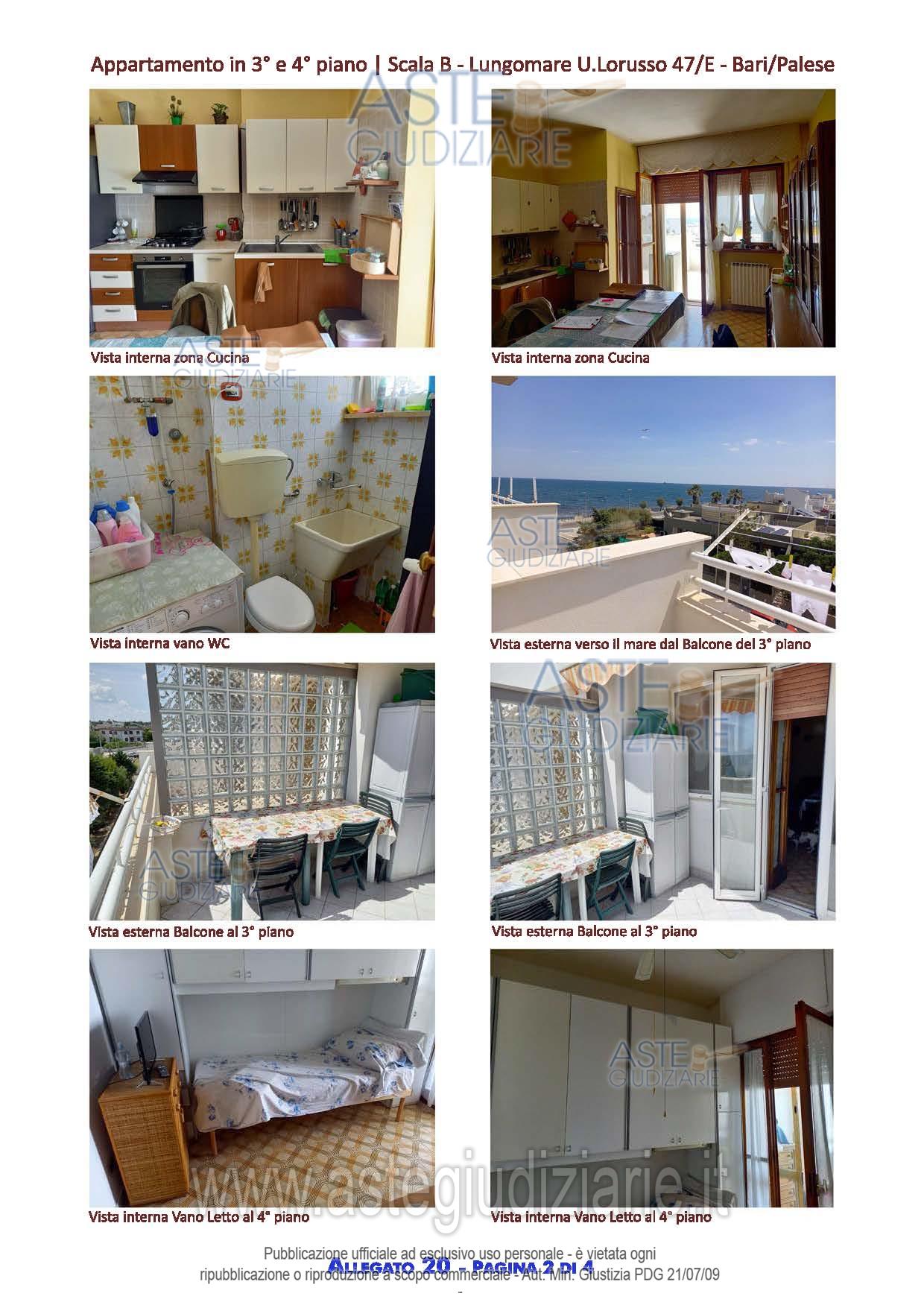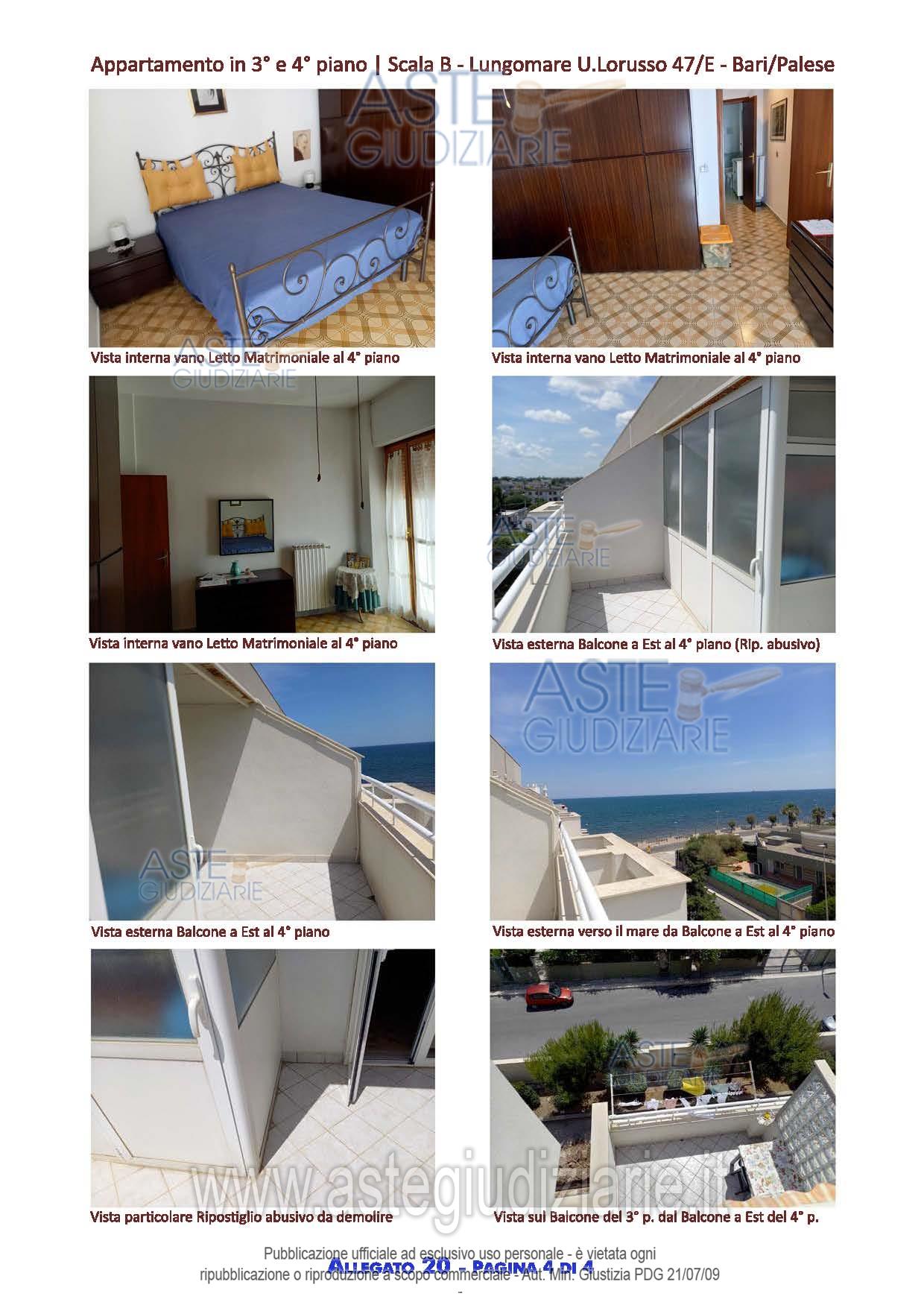 Vendita all'asta Senza incanto, con gara telematica asincrona - LOTTO UNICO: Piena proprietà di appartamento di tipo economico al 3° e 4° piano, composto dalla zona giorno (ingresso, studio, cucina/soggiorno, WC e balcone vista mare) al 3° piano, mentre la zona notte (letto con balcone, bagno, letto matrimoniale con balcone vista mare) al 4° piano. Sui balconi del 4° piano sono presenti due modesti abusi edilizi, sul primo vi è la chiusura a vetri sul secondo vi è un ripostiglio in struttura leggera di alluminio con vetri, che andranno eliminati a cura e spese del futuro acquirente. Prezzo base € 157.023,50 (offerta minima € 117.767,70). Data inizio operazioni di vendita: 25/11/2025 ore 17:45. Giudice Dott. Marina Cavallo. Professionista delegato alla vendita Dott. Antonella Bernardi - Email "antonella.bernardi@studiobernardibari.it". Custode Giudiziario Dott. Antonella Bernardi - Email "antonella.bernardi@studiobernardibari.it". Rif. Tribunale di Bari - Espropriazione immobiliare (cartabia) n. 435/2023
