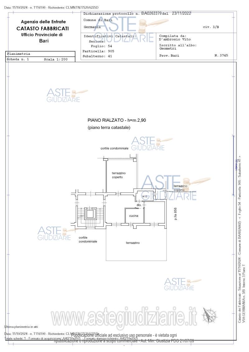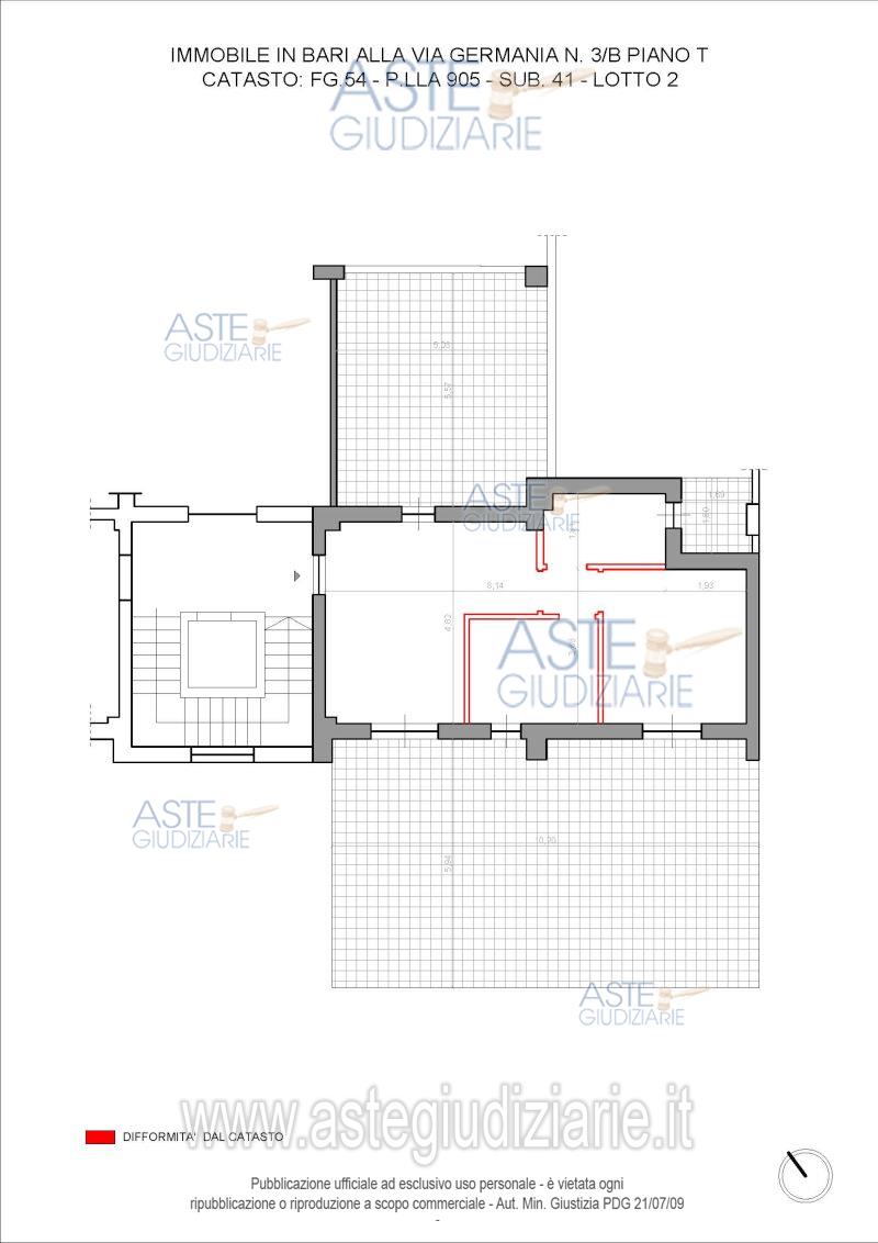 Vendita all'asta Senza incanto, con gara telematica asincrona - LOTTO 2: Appartamento a Bari, posto al piano terra del fabbricato alla via Germania n.3/B al quartiere Sant’Anna, contraddistinto dall’interno 3 e sviluppante la superficie di mq.74 circa; costituito da un unico ambiente, privo di tramezzature interne, intonaci, pitture ed impianti, fatta eccezione per il terrazzino che risulta pavimentato e la presenza di infissi metallici. Prezzo base € 101.400,00 (offerta minima € 76.050,00). Data inizio operazioni di vendita: 05/11/2025 ore 15:30. Giudice Dott. Marina Cavallo. Professionista delegato alla vendita Avv. Vito Luigi Cofano - Email "vitoluigicofano@yahoo.it". Custode Giudiziario Avv. Vito Luigi Cofano - Email "vitoluigicofano@yahoo.it". Rif. Tribunale di Bari - Espropriazione immobiliare (cartabia) n. 99/2024
