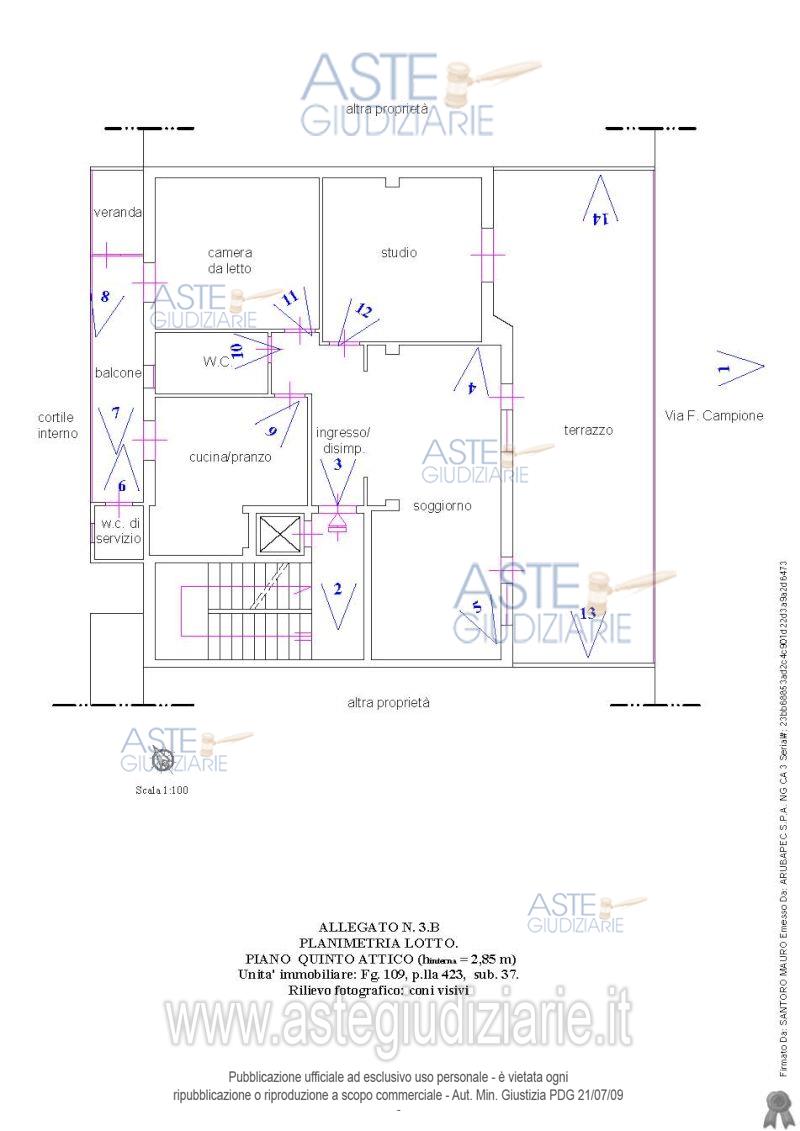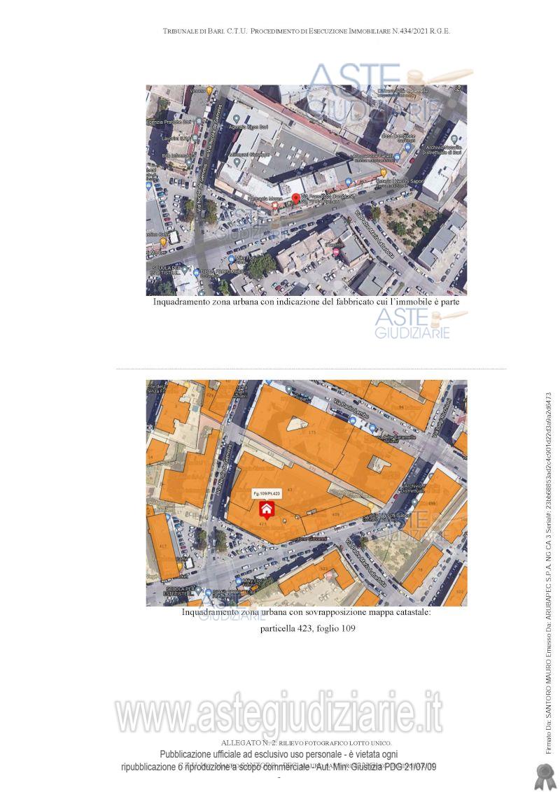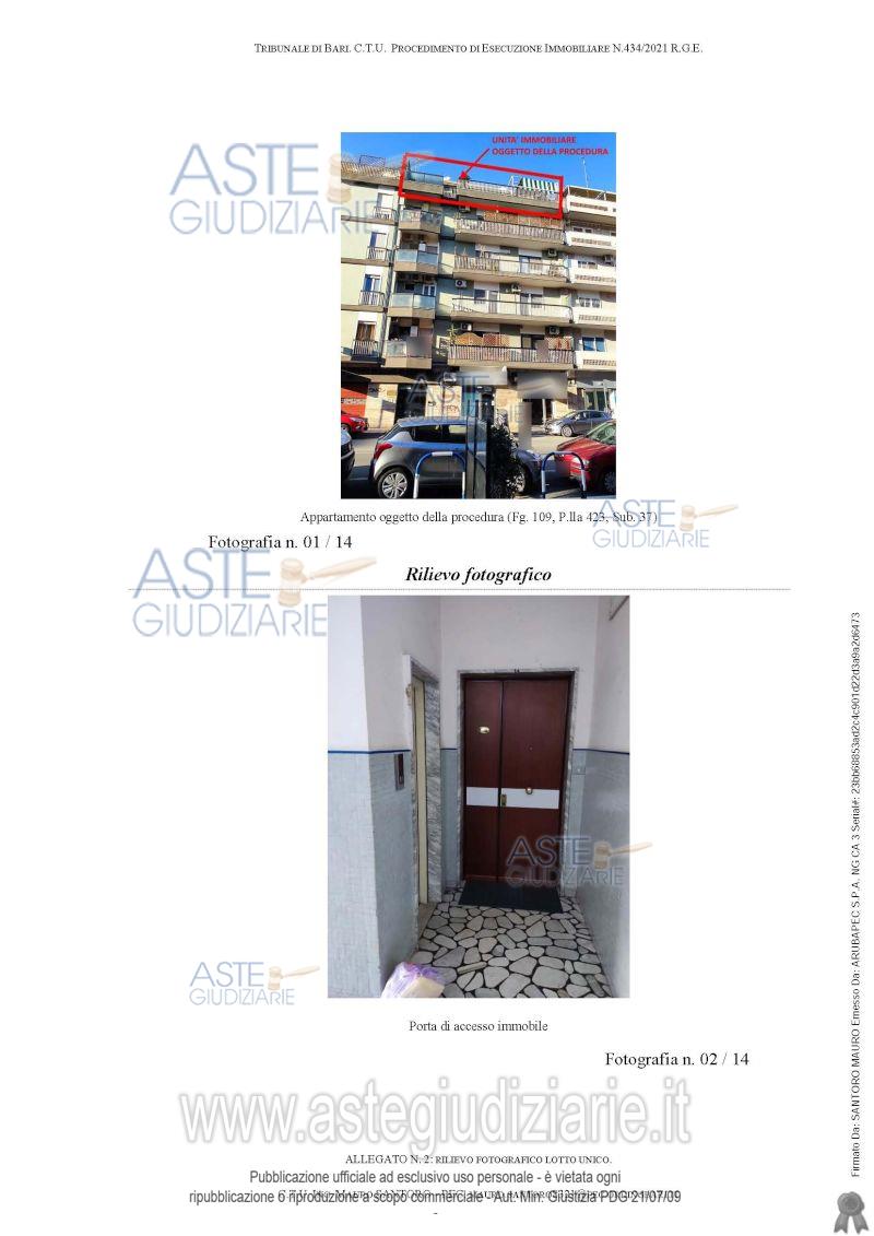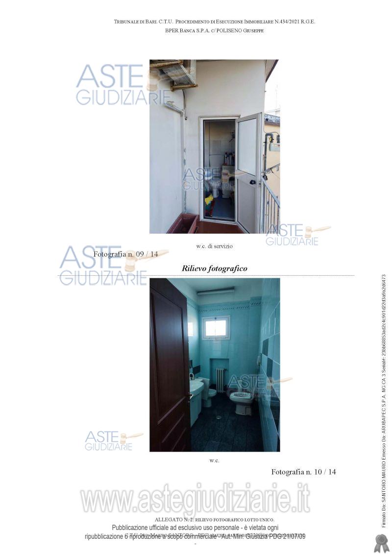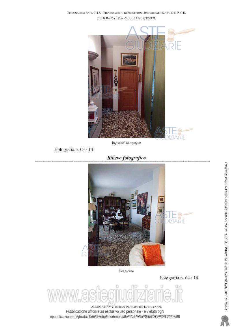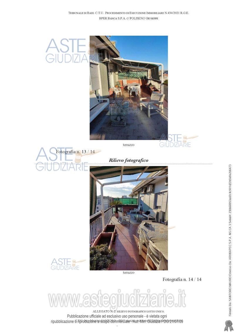 Vendita all'asta Senza incanto, con gara telematica asincrona - LOTTO UNICO: Piena proprietà di appartamento al quinto piano, composto da: ingresso/disimpegno; un soggiorno; una cucina/pranzo; un balcone con affaccio interno al condominio alle cui estremità opposte sono presenti una veranda ed un piccolo vano adibito a servizio igienico di servizio. Dal disimpegno si accede al servizio igienico con finestra, ad una camera da letto dotata di porta-finestra con affaccio sul balcone interno e ad un vano studio con porta-finestra avente affaccio sul terrazzo a livello pertinenziale. Prezzo base € 201.022,00 (offerta minima € 150.765,00). Data inizio operazioni di vendita: 27/11/2025 ore 16:00. Giudice Dott. Chiara Cutolo. Professionista delegato alla vendita Avv. Marco Ventriglia - Email "studiolegaleventriglia@virgilio.it". Custode Giudiziario Avv. Marco Ventriglia - Email "studiolegaleventriglia@virgilio.it". Rif. Tribunale di Bari - Esecuzione immobiliare post legge 80 n. 434/2021