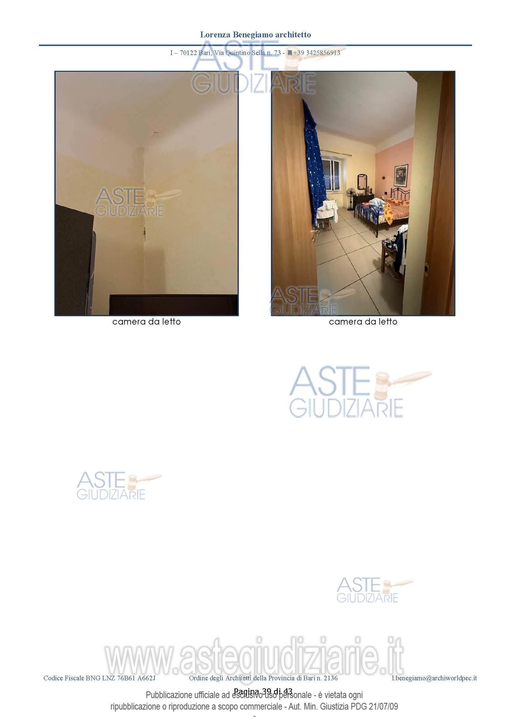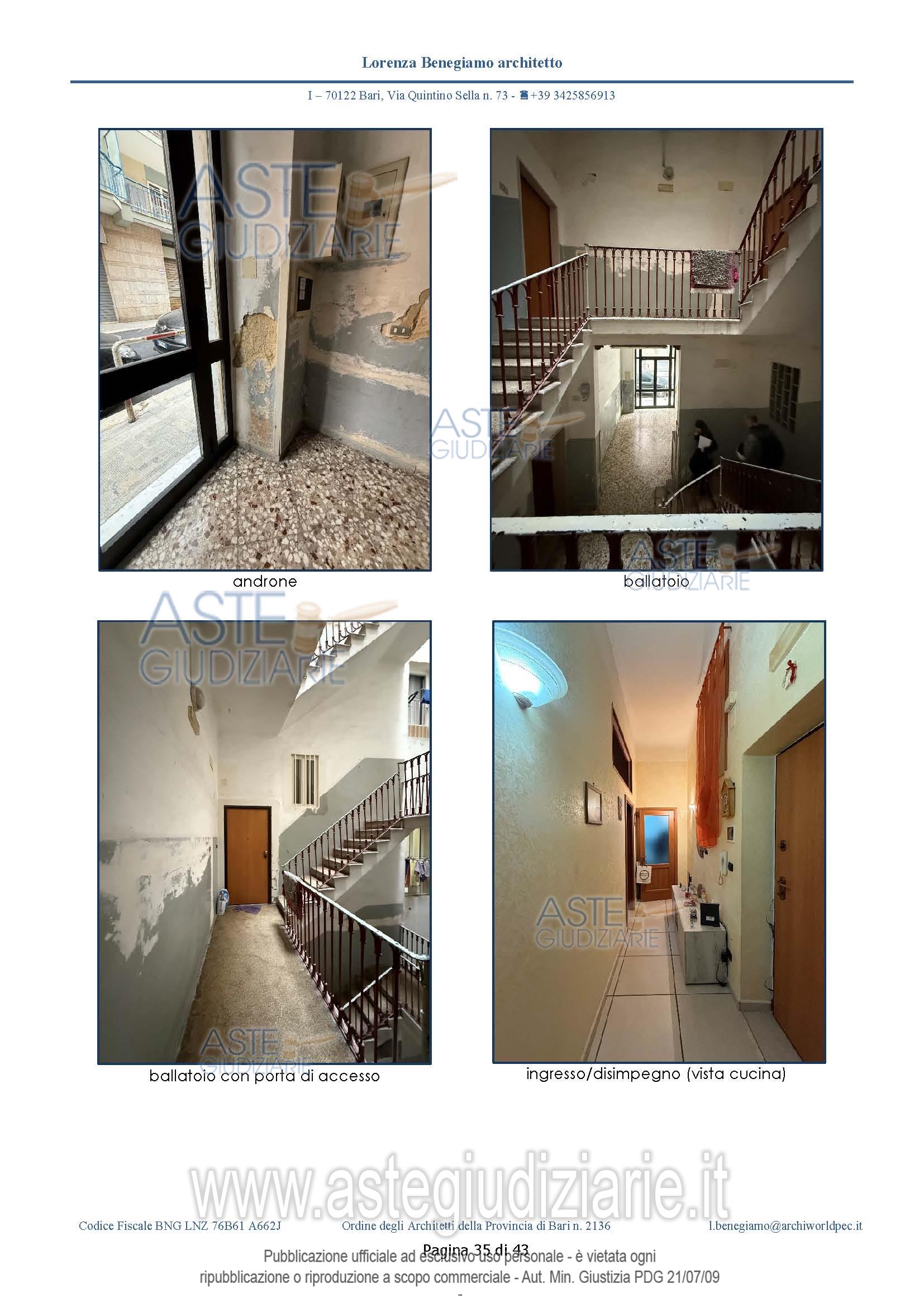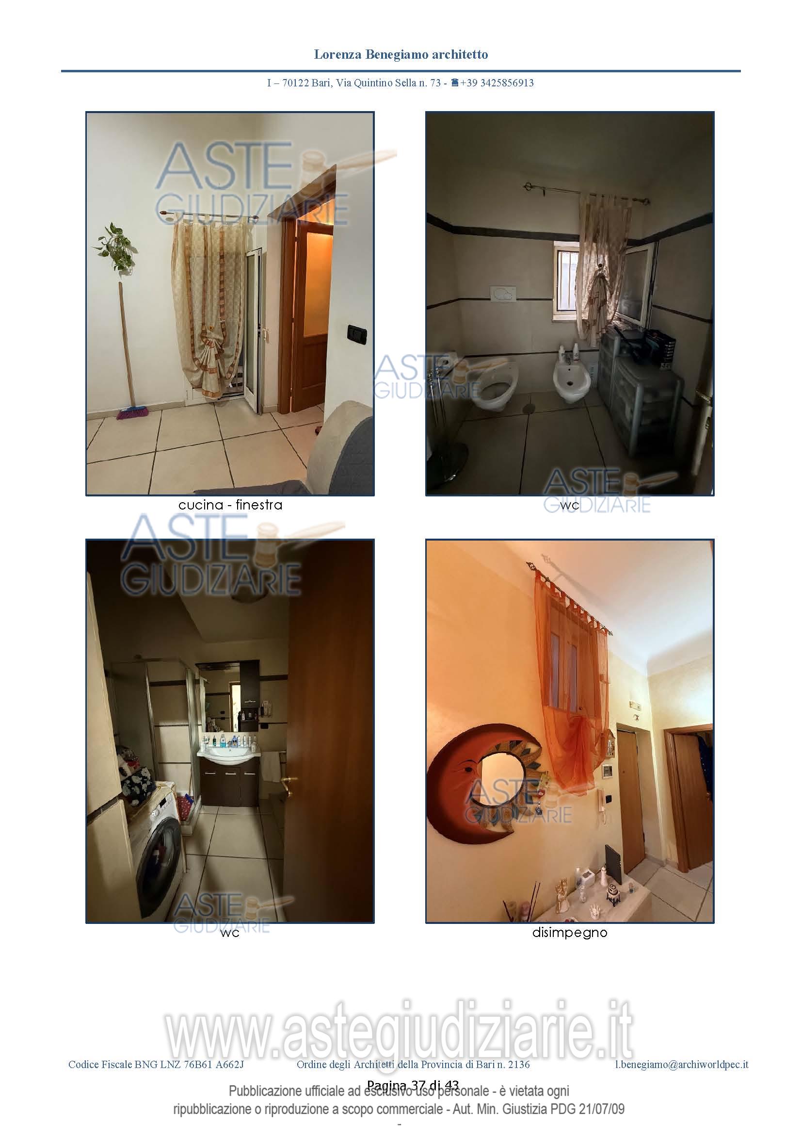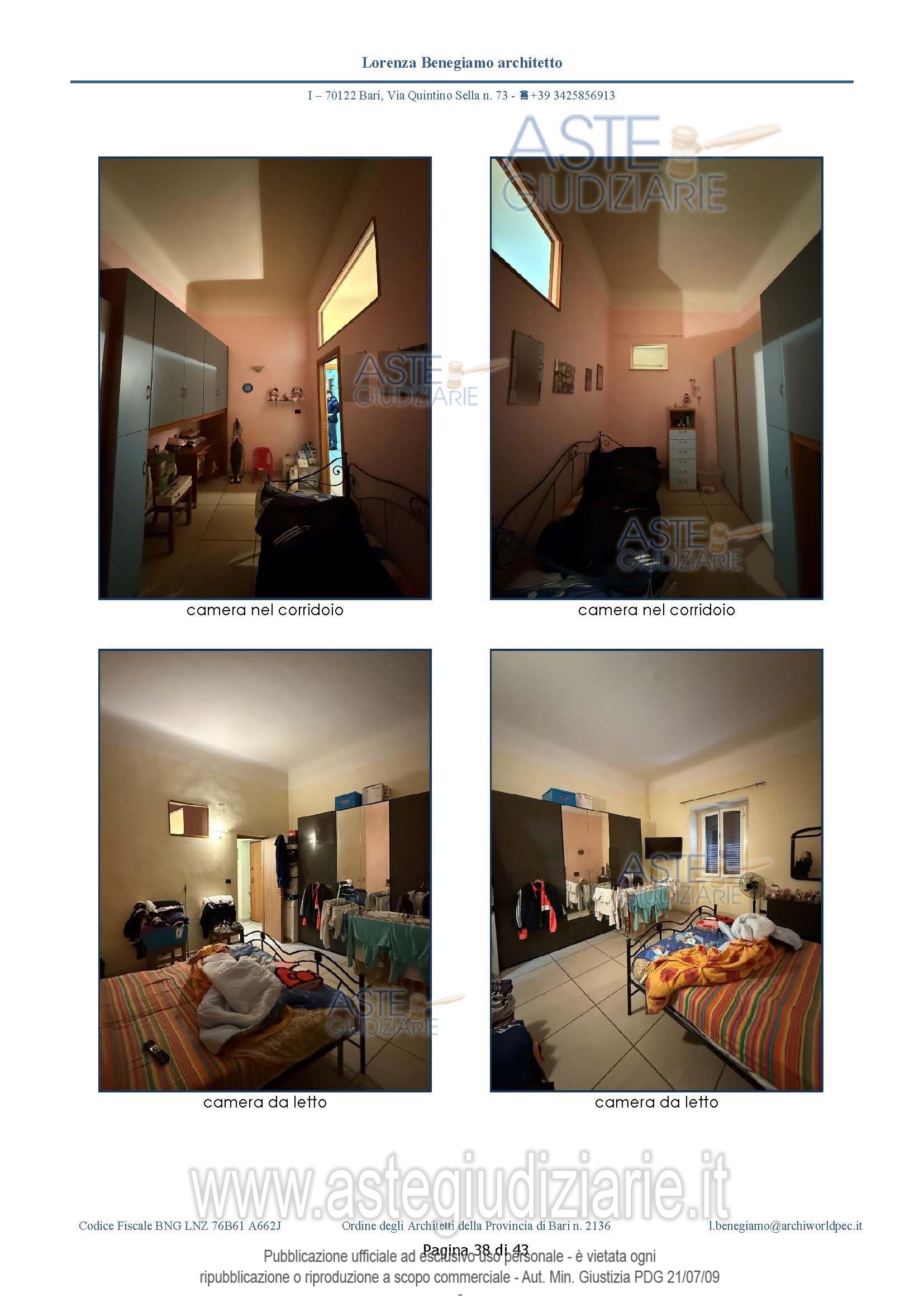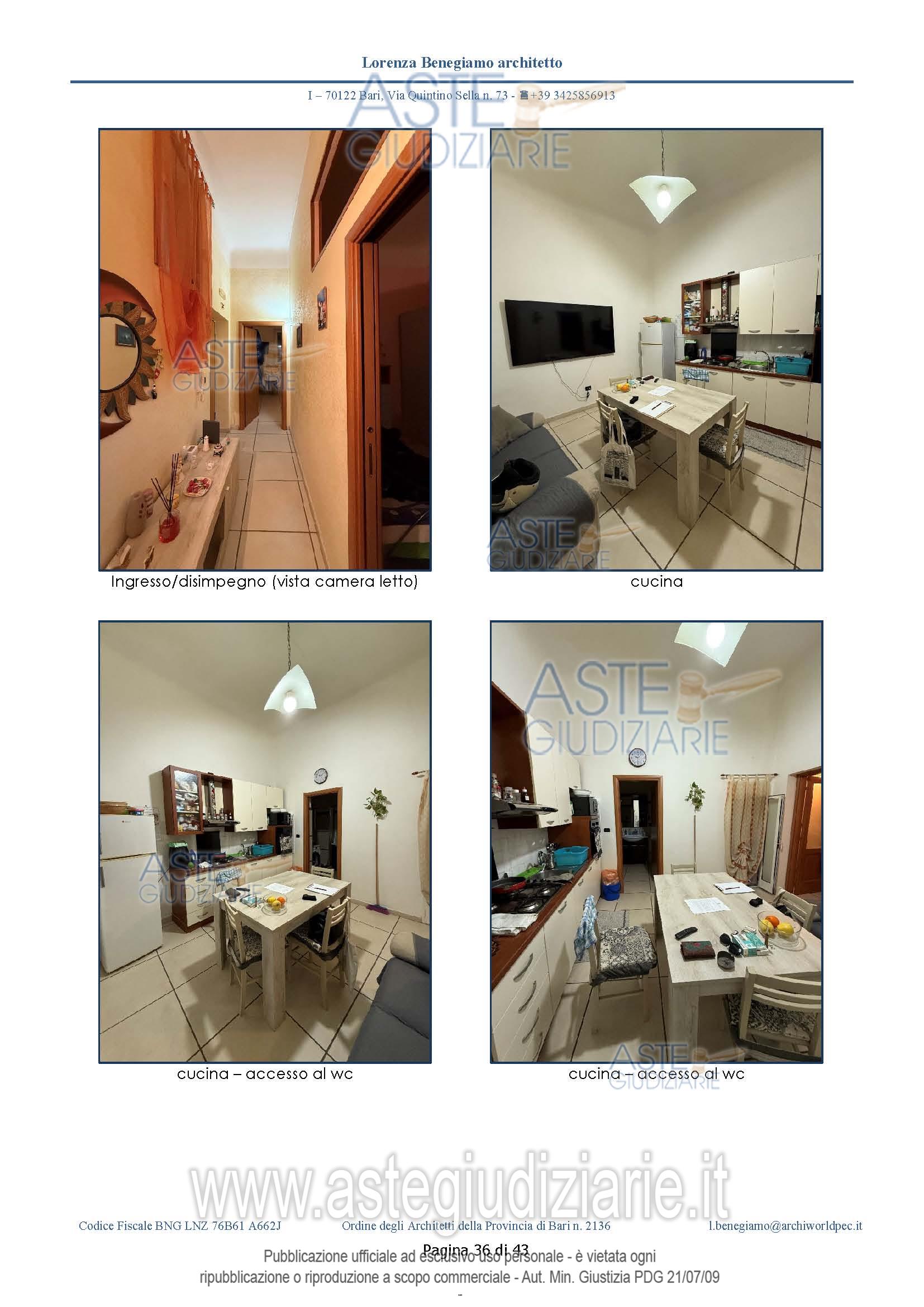 Vendita all'asta Senza incanto, con gara telematica asincrona - LOTTO UNICO: L'immobile ha un'estensione di circa 74,36 mq chiusi e coperti, non ha balconi a livello. Il cespite è costituito da: ingresso-corridoio, cucina, bagno e due camere. Al bagno si accede dalla cucina – soggiorno. Prezzo base € 86.500,00 (offerta minima € 57.670,00). Data inizio operazioni di vendita: 18/03/2026 ore 17:00. Giudice Dott. Chiara Cutolo. Professionista delegato alla vendita Avv. Ileana Giovanna Magarelli - Email "avvileanamagarelli@gmail.com". Custode Giudiziario Avv. Ileana Giovanna Magarelli - Email "avvileanamagarelli@gmail.com". Rif. Tribunale di Bari - Espropriazione immobiliare (cartabia) n. 387/2024