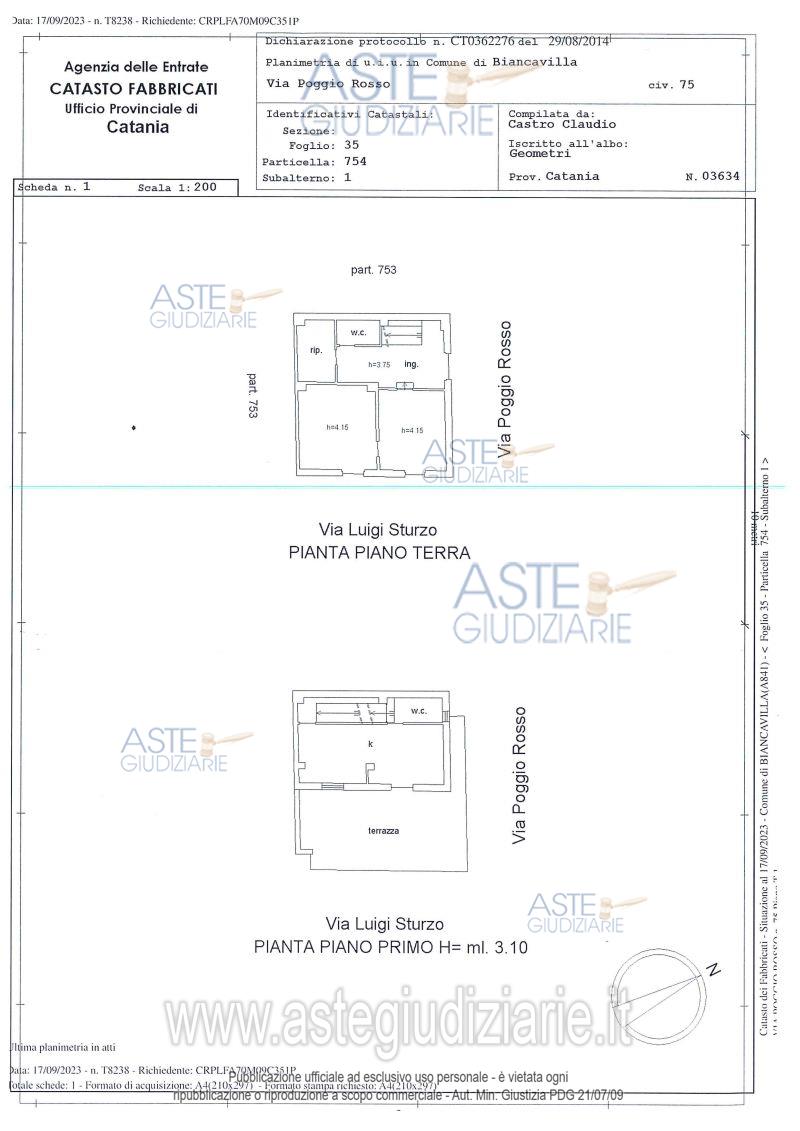 Vendita all'asta Senza incanto, con gara telematica sincrona mista - LOTTO UNICO: LOTTO UNICO Piena proprietà di un immobile distribuito su 3 livelli (piano terra, piano primo e piano secondo), non ascensorato, sito in Biancavilla ( CT ), Via Poggio Rosso n. 75, censito nel N.C.E.U. al Foglio 35, Part. 754, Sub 1, Categoria A/3, Classe 7, Consistenza 4,5 vani, Superficie Catastale totale 123 mq. (escluso aree scoperte 114 mq. Prezzo base € 24.046,87 (offerta minima € 18.035,16). Data vendita 13/05/2026 ore 12:00. Professionista delegato alla vendita Avv. Luca Giammusso - Email "giammusso@finocchiaro.it"; Tel. 095388875. Custode Giudiziario Avv. Luca Giammusso - Email "giammusso@finocchiaro.it"; Tel. 095388875. Rif. Tribunale di Catania - Esecuzione immobiliare post legge 80 n. 34/2022