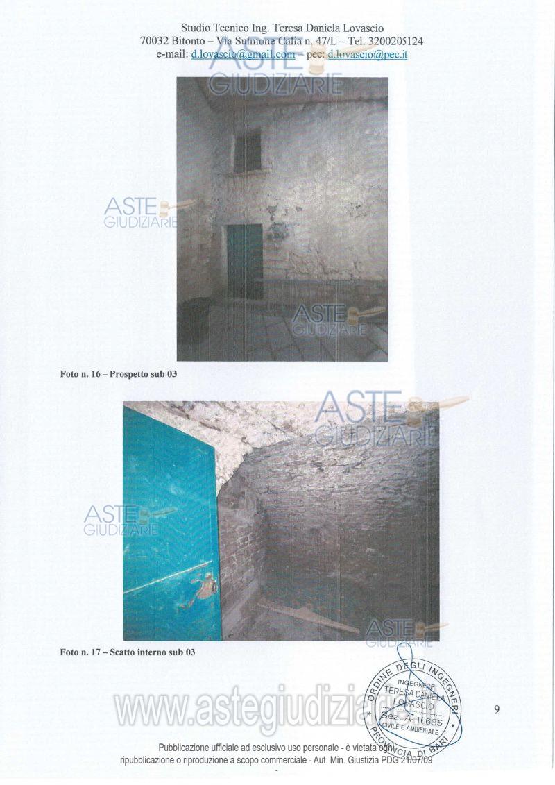 Vendita all'asta Senza incanto, con gara telematica asincrona - LOTTO 2: Piena proprietà dell’unità immobiliare posta a piano terra e costituita da un solo vano, esteso su unico livello, della superficie di 15 mq. Prezzo base € 2.700,00 (offerta minima € 2.025,00). Data inizio operazioni di vendita: 15/01/2026 ore 15:00. Giudice Dott. Antonio Ruffino. Professionista delegato alla vendita Dott. Elena Torsi - Email "elena.torsi@libero.it". Custode Giudiziario Dott. Elena Torsi - Email "elena.torsi@libero.it". Rif. Tribunale di Bari - Esecuzione immobiliare post legge 80 n. 92/2023